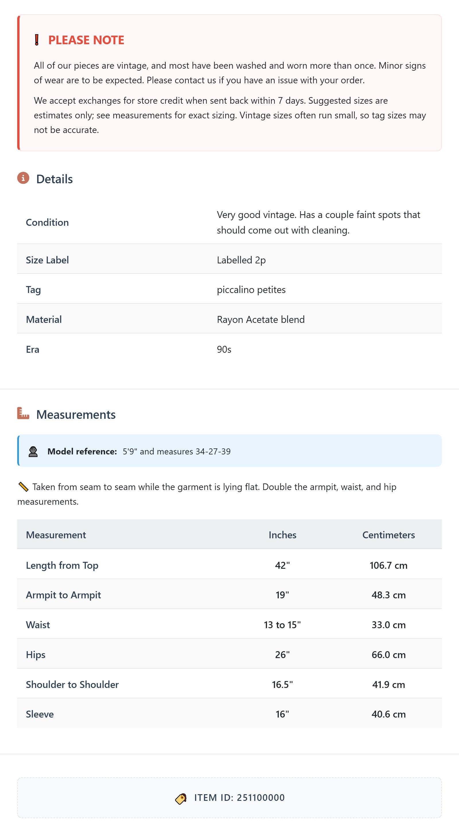 All of our pieces are vintage, and most have been washed and worn more than once. Minor signs of wear are to be expected. Please contact us if you have an issue with your order. We accept exchanges for store credit when sent back within 7 days.