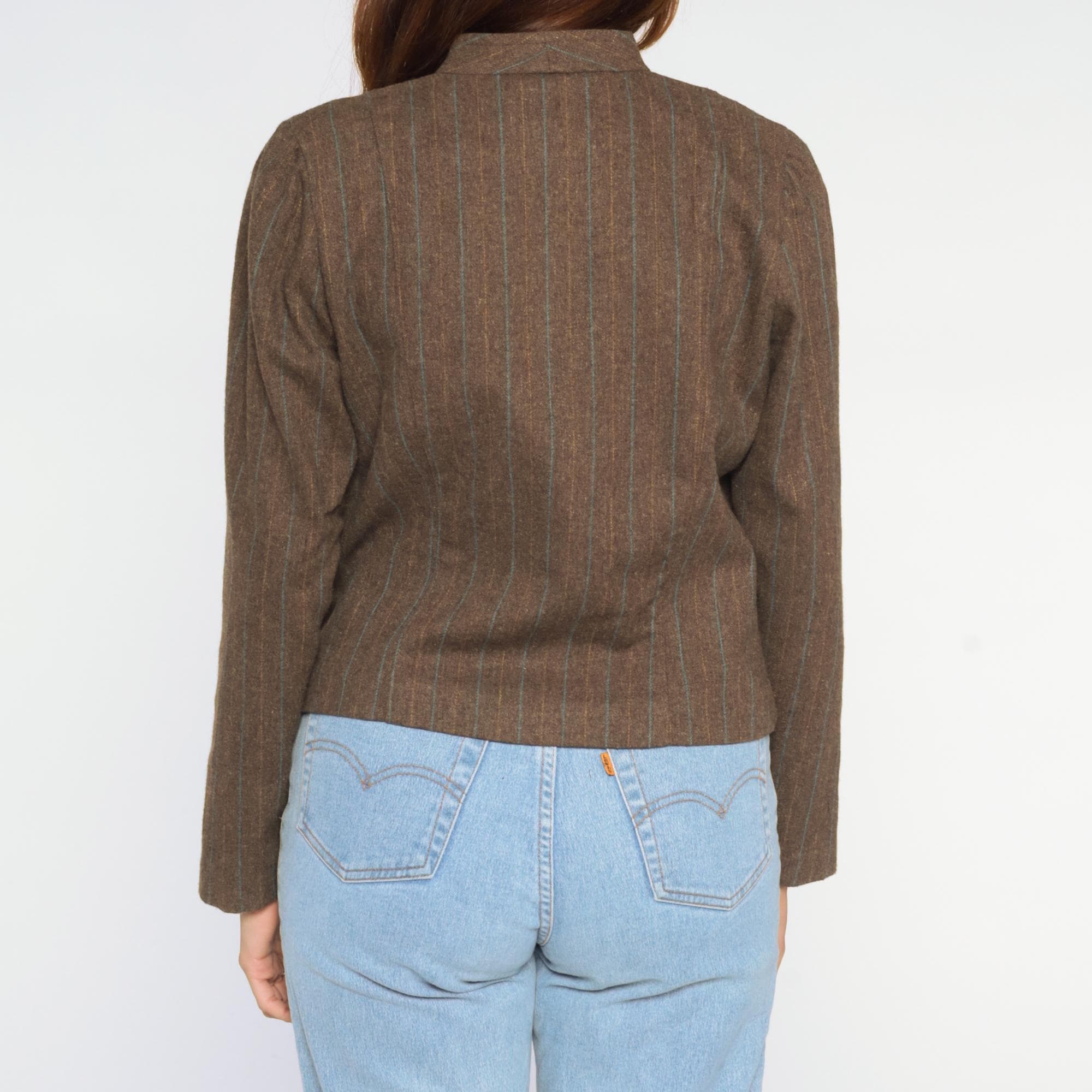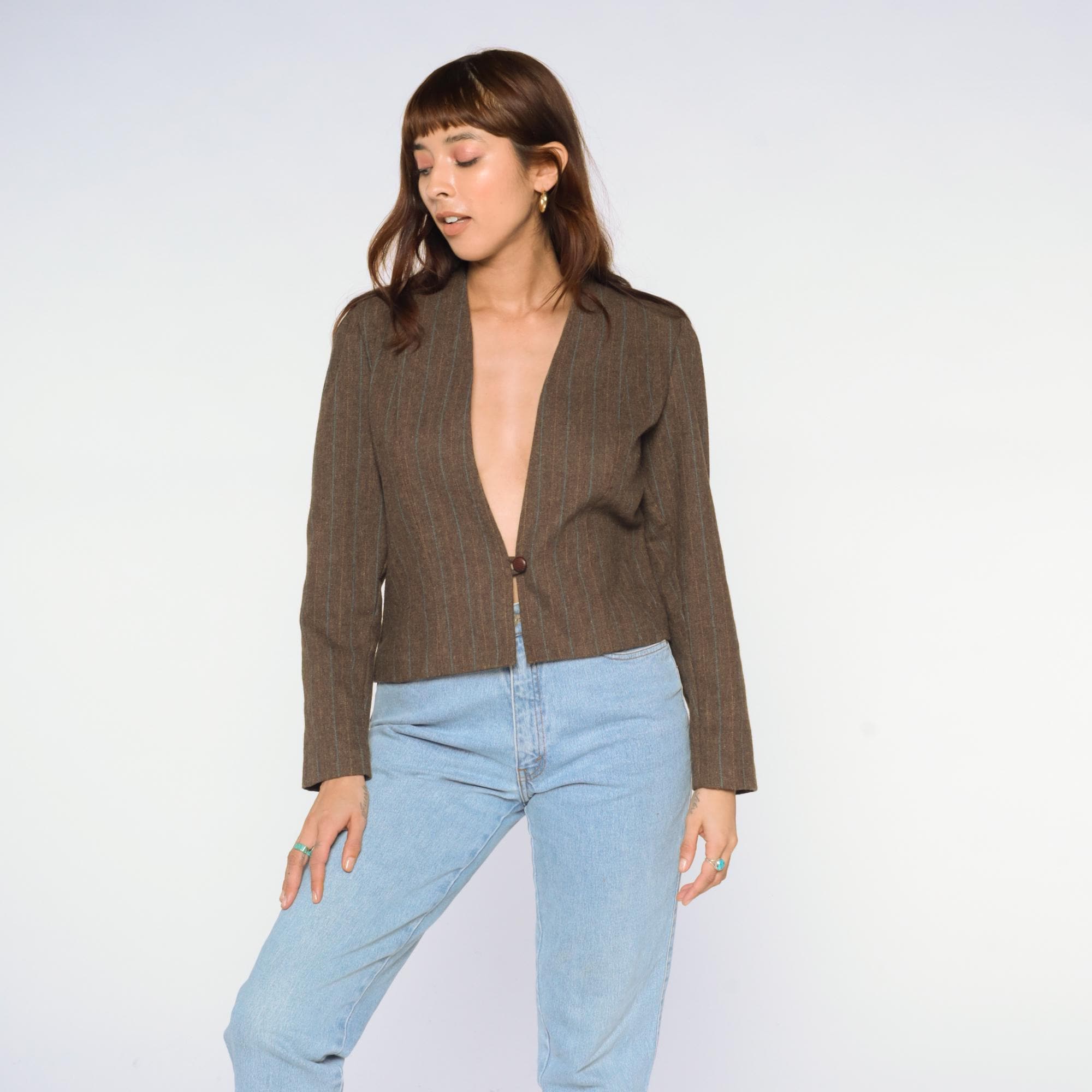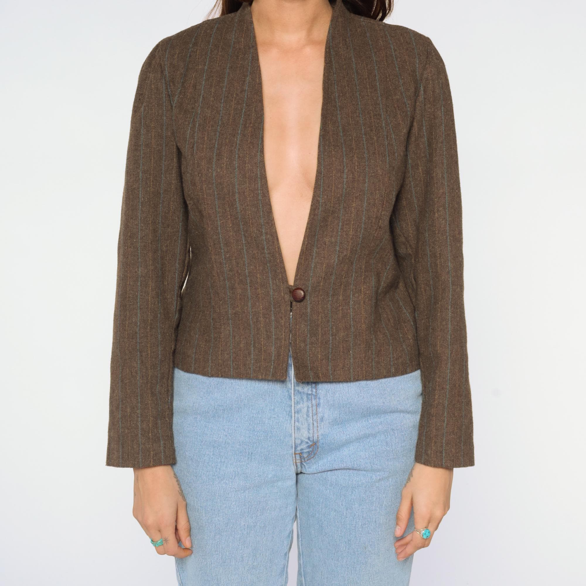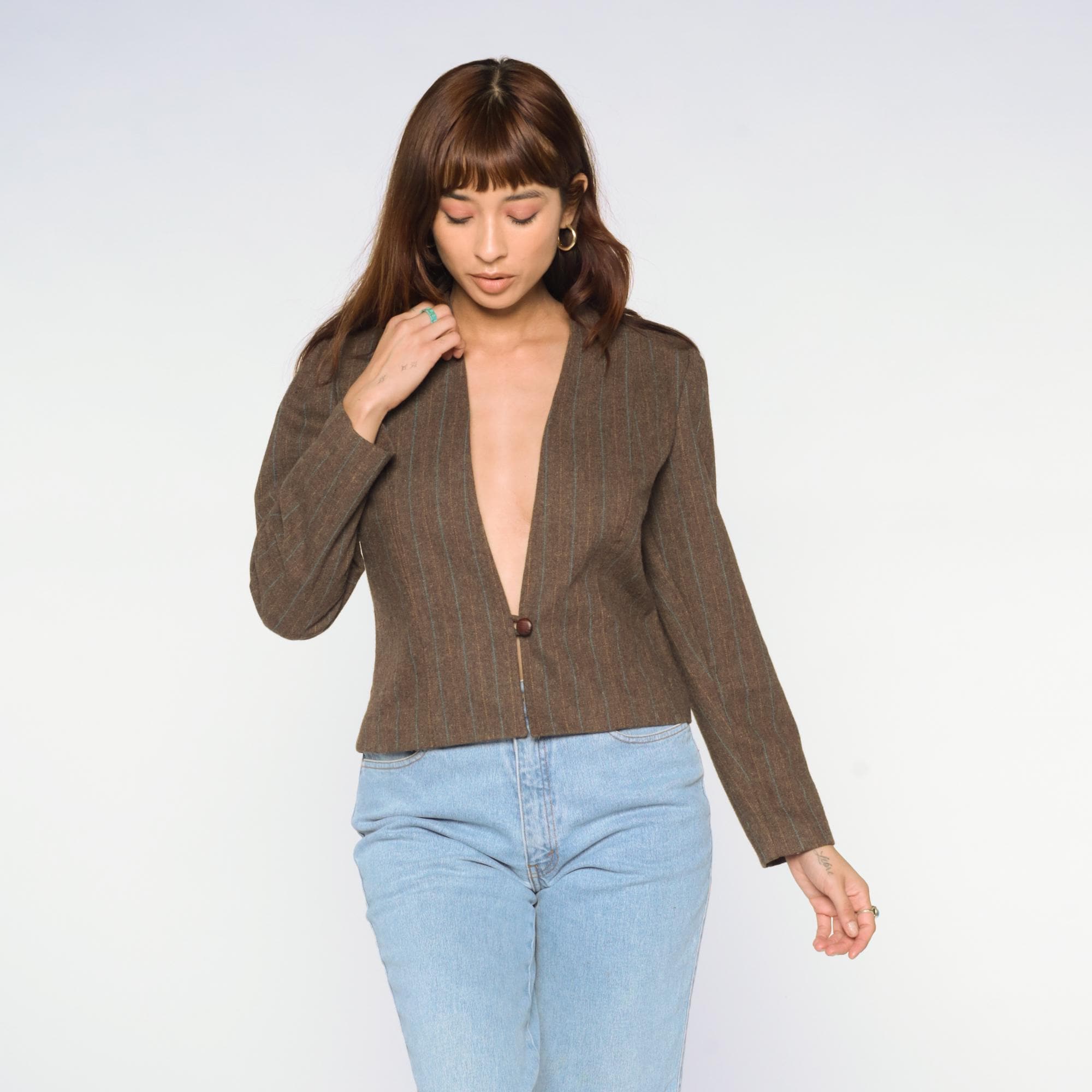 80s brown pinstripe blazer from That's Me! featuring single button closure with deep V-neckline. Vertical pinstripe pattern throughout with structured shoulders and tailored fit. Long sleeves with button cuffs.
