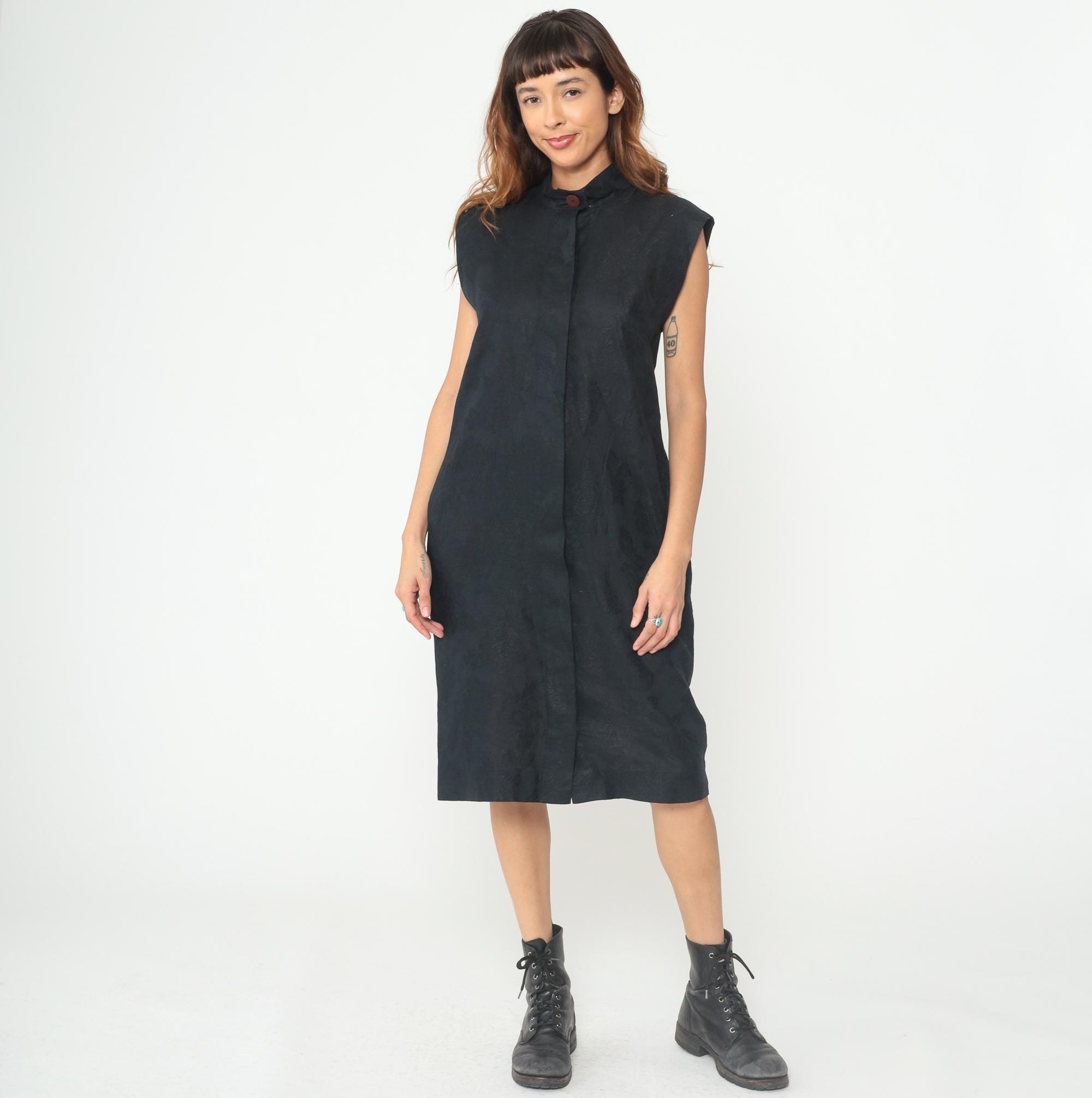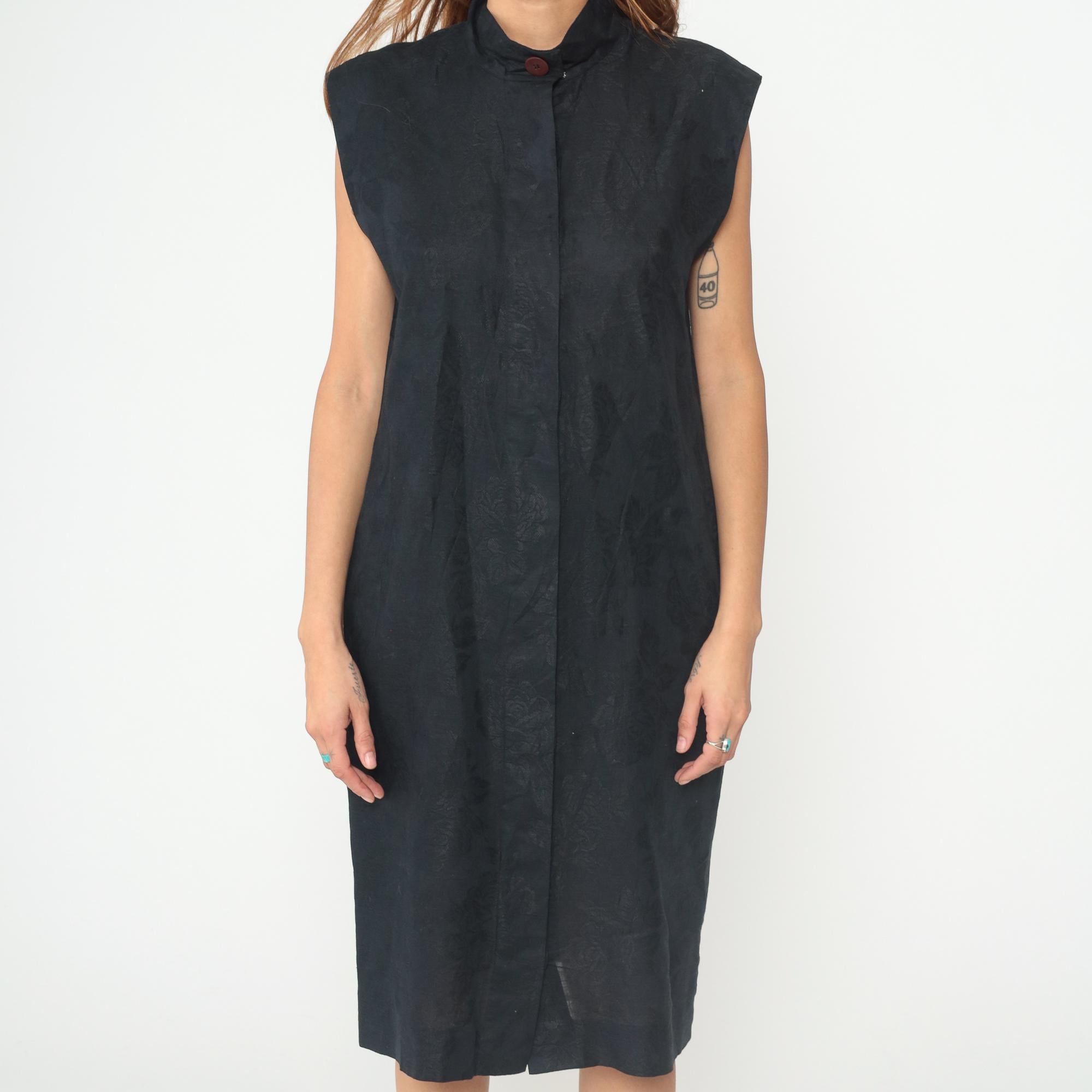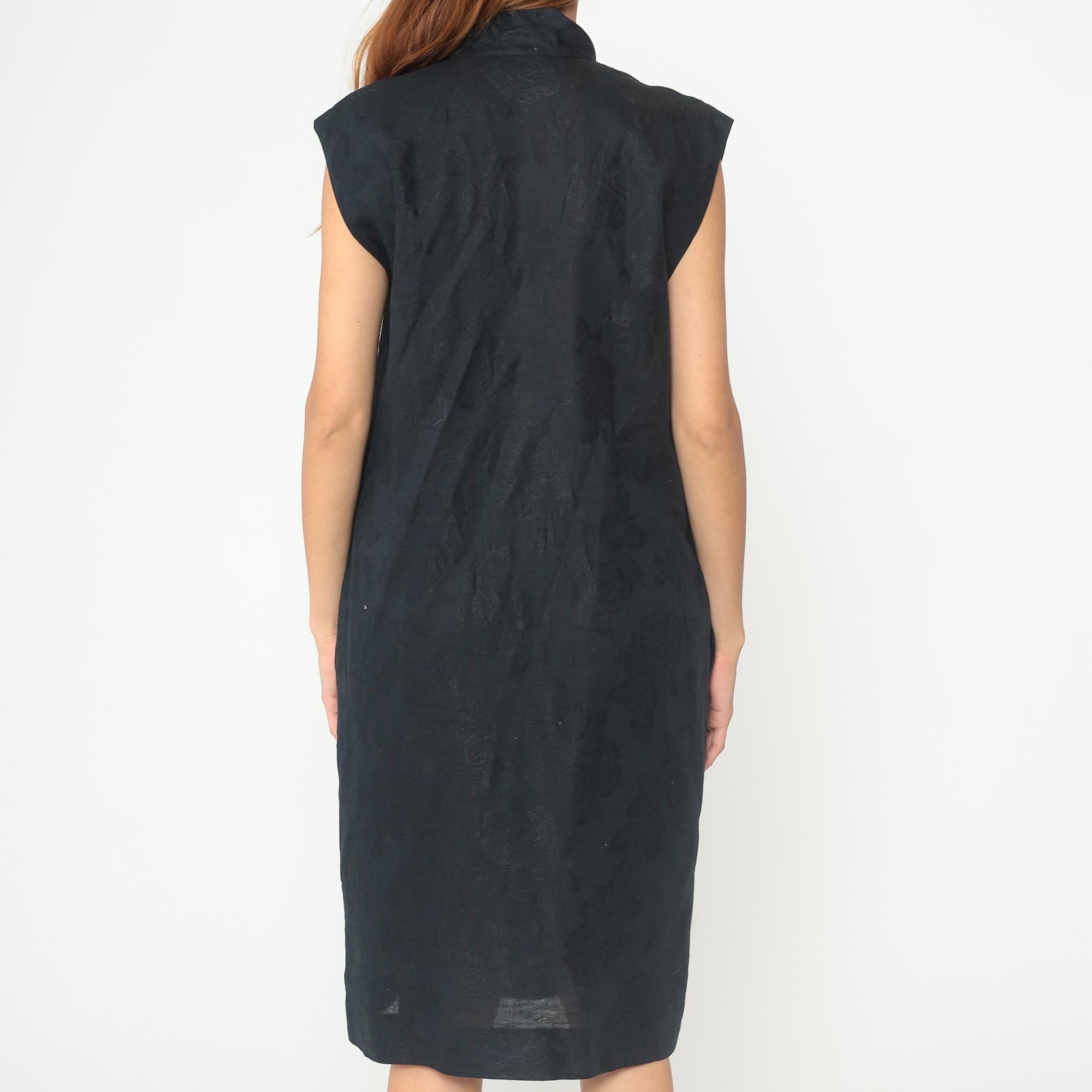Vintage 1990s black dress from Albert Nipon Boutique featuring a mandarin collar with single button closure at the neck. The dress has a sleeveless shift silhouette with extended shoulders, concealed button front placket running the length of the dress, and center front slit at hem. Made from a linen cotton blend with subtle textured floral jacquard pattern woven into the fabric. Midi length. Tagged size 12.