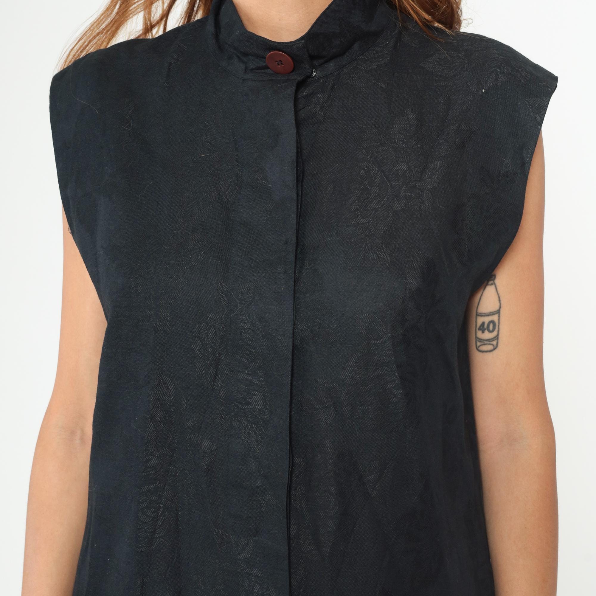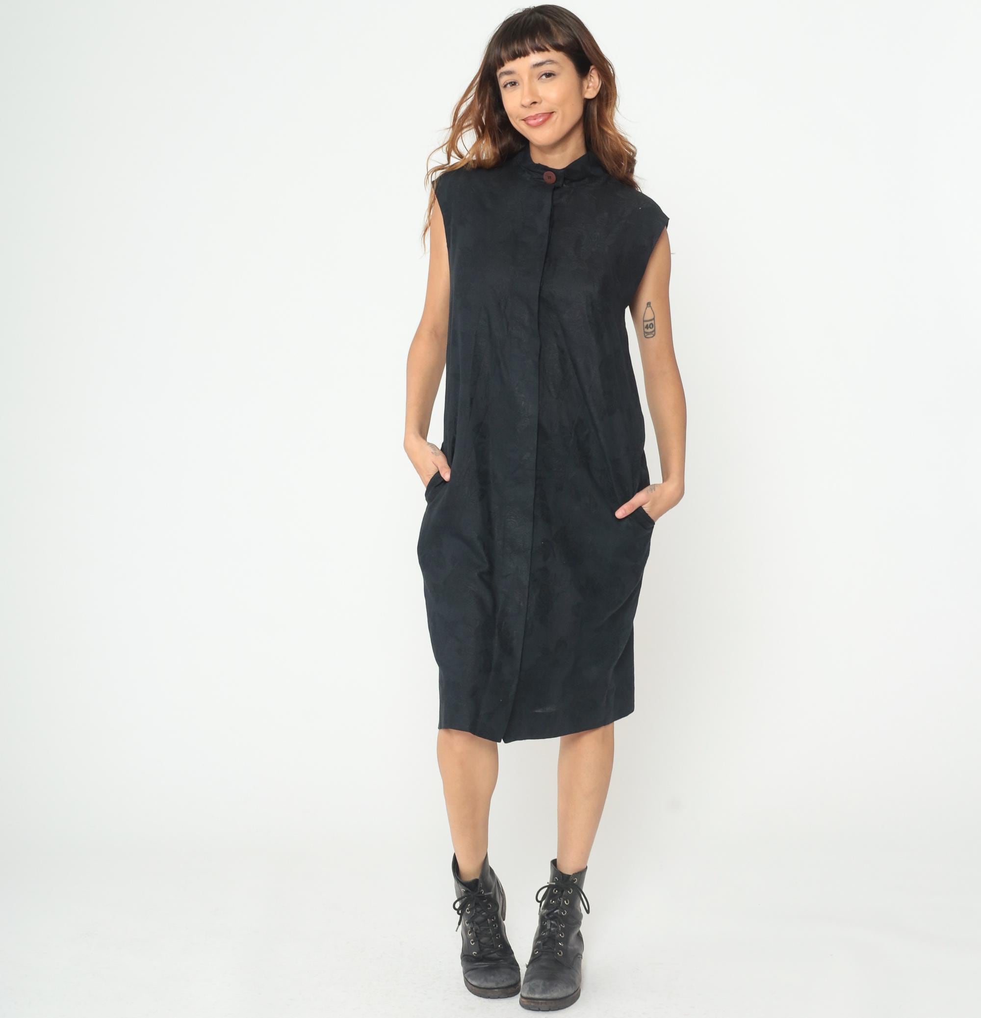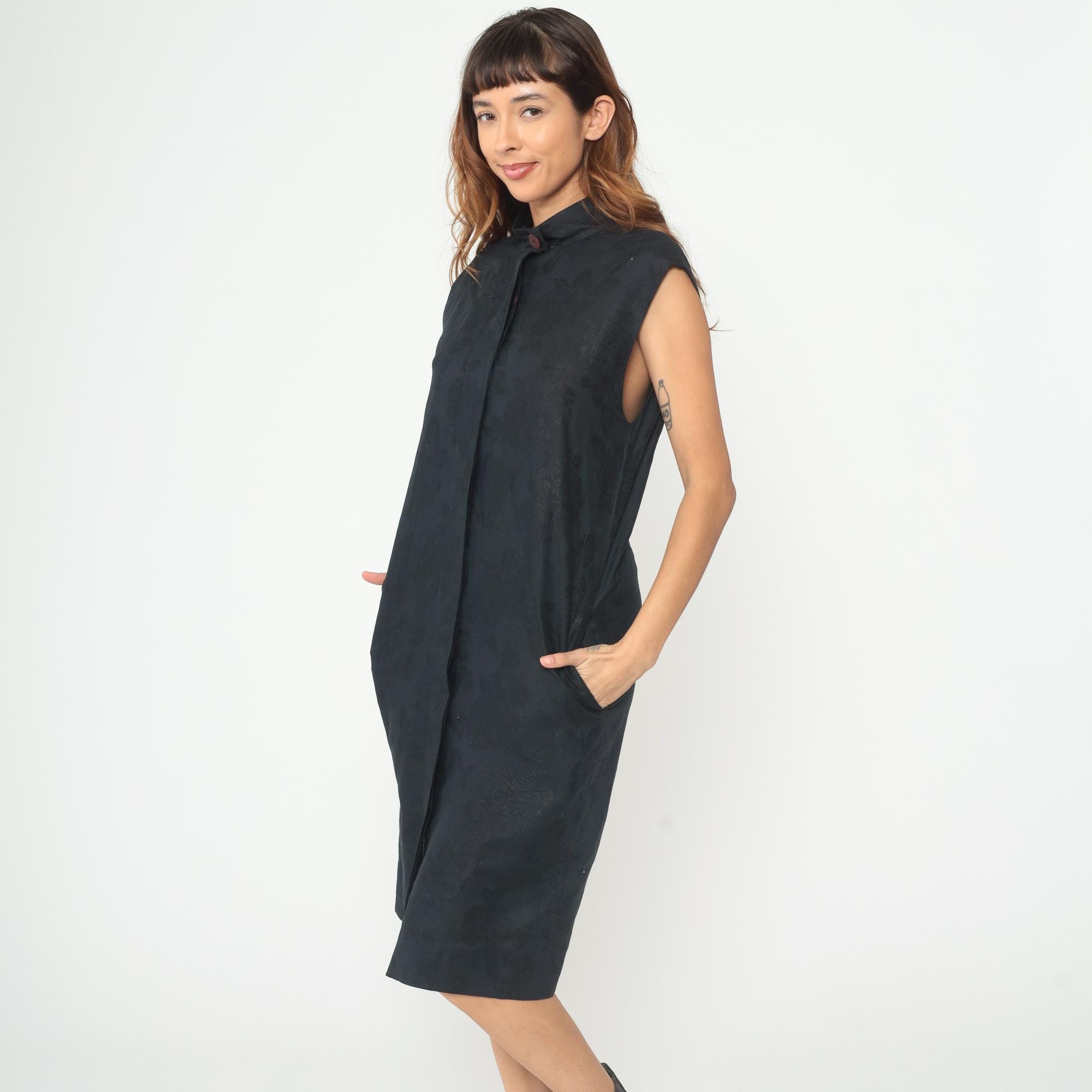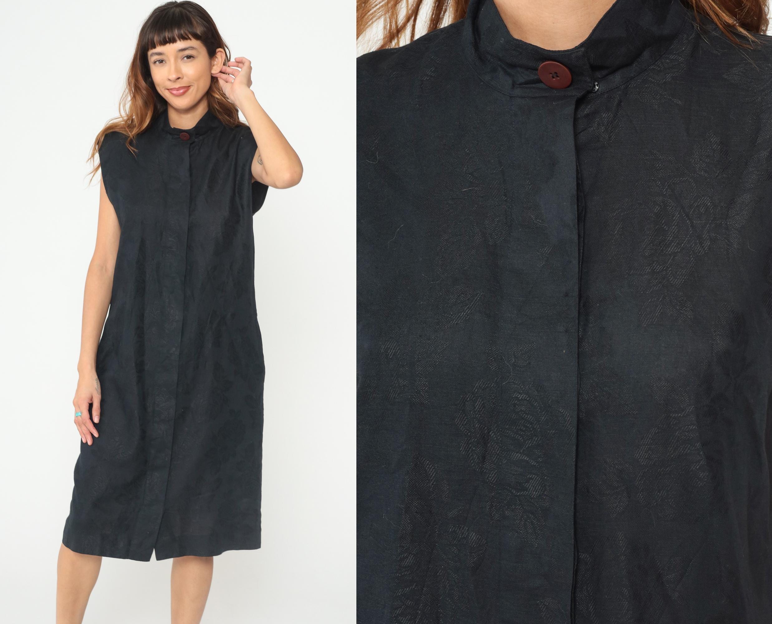 Vintage 1990s black dress from Albert Nipon Boutique featuring a mandarin collar with single button closure at the neck. The dress has a sleeveless shift silhouette with extended shoulders, concealed button front placket running the length of the dress, and center front slit at hem. Made from a linen cotton blend with subtle textured floral jacquard pattern woven into the fabric. Midi length. Tagged size 12.