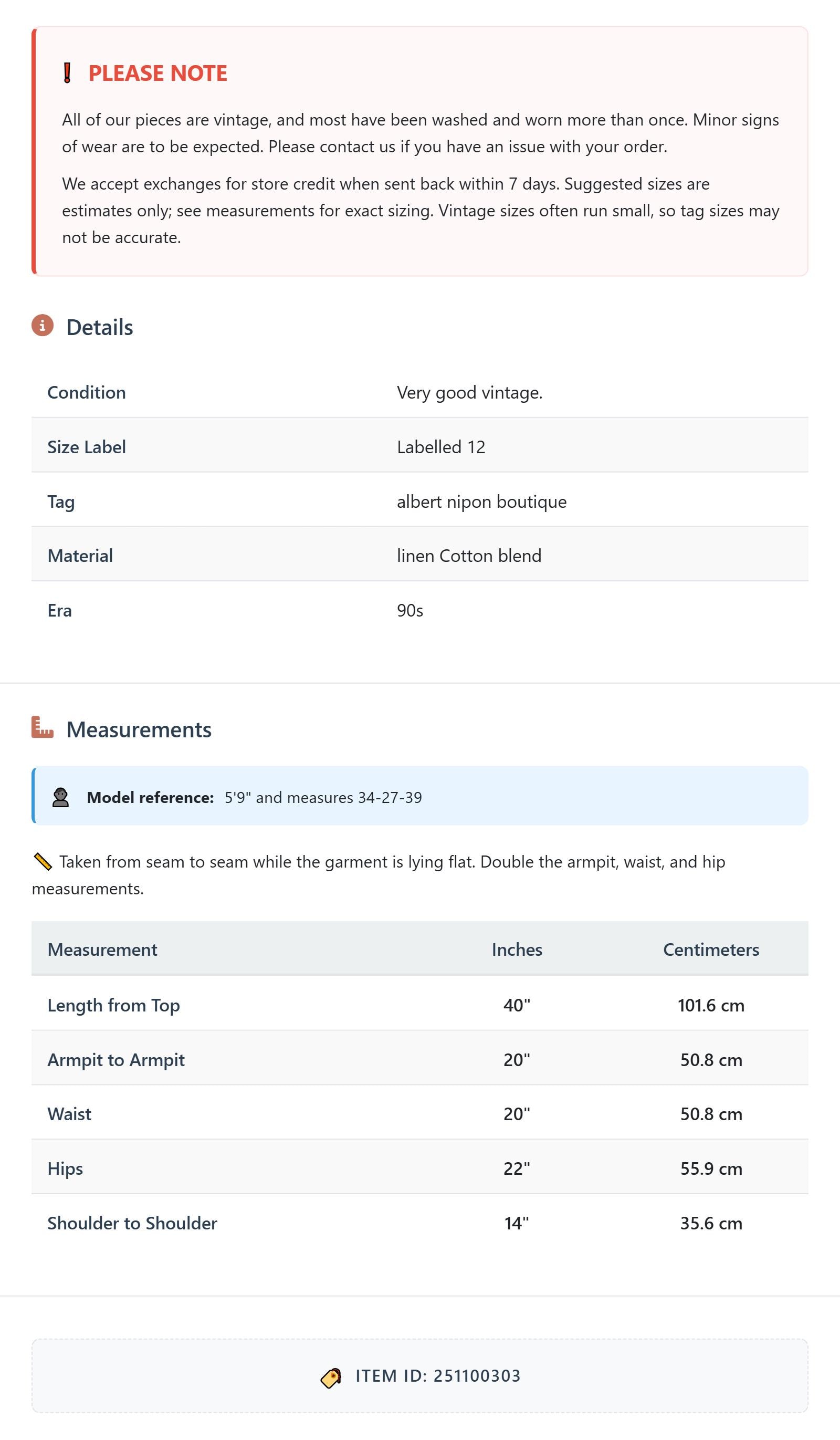 All of our pieces are vintage, and most have been washed and worn more than once. Minor signs of wear are to be expected. Please contact us if you have an issue with your order. We accept exchanges for store credit when sent back within 7 days.