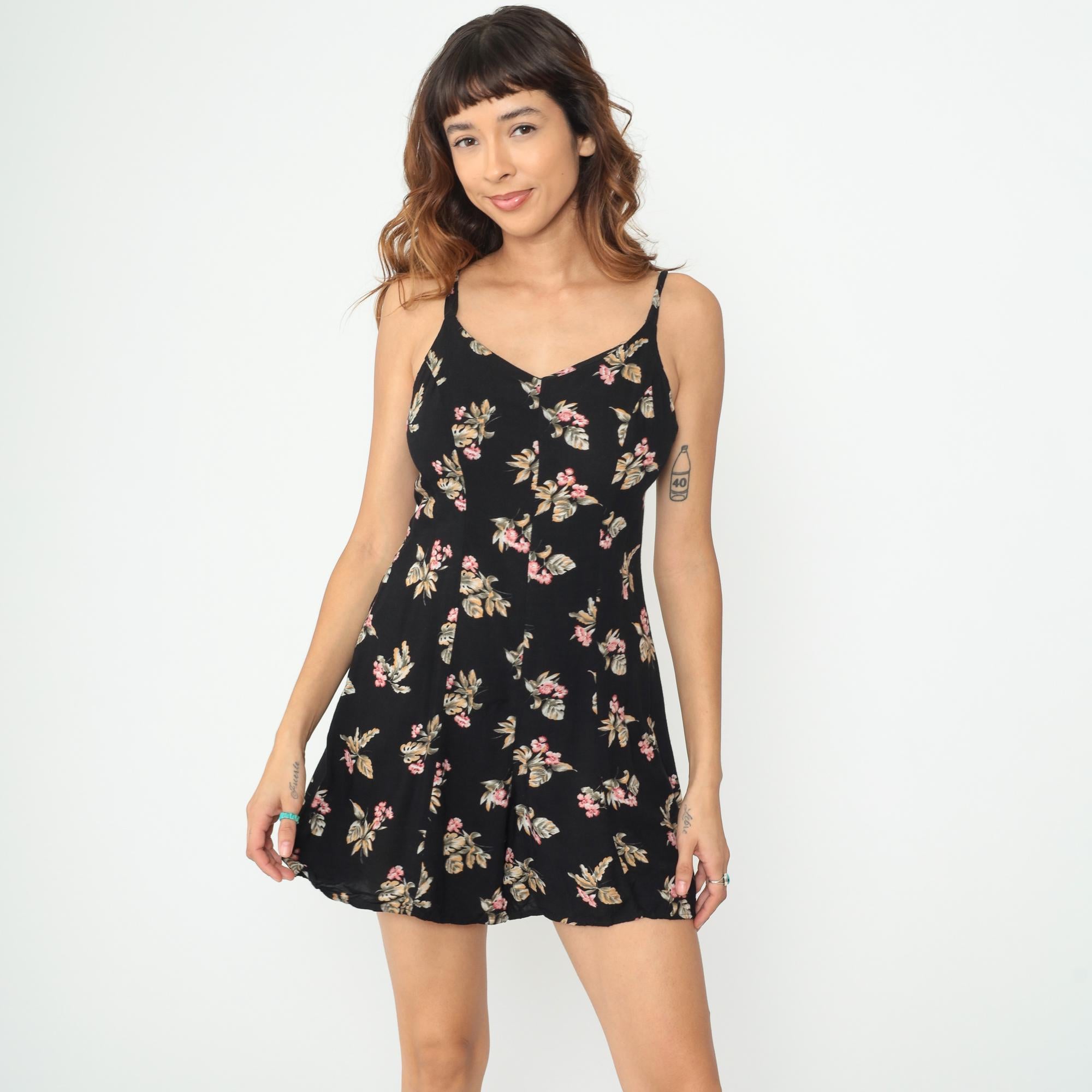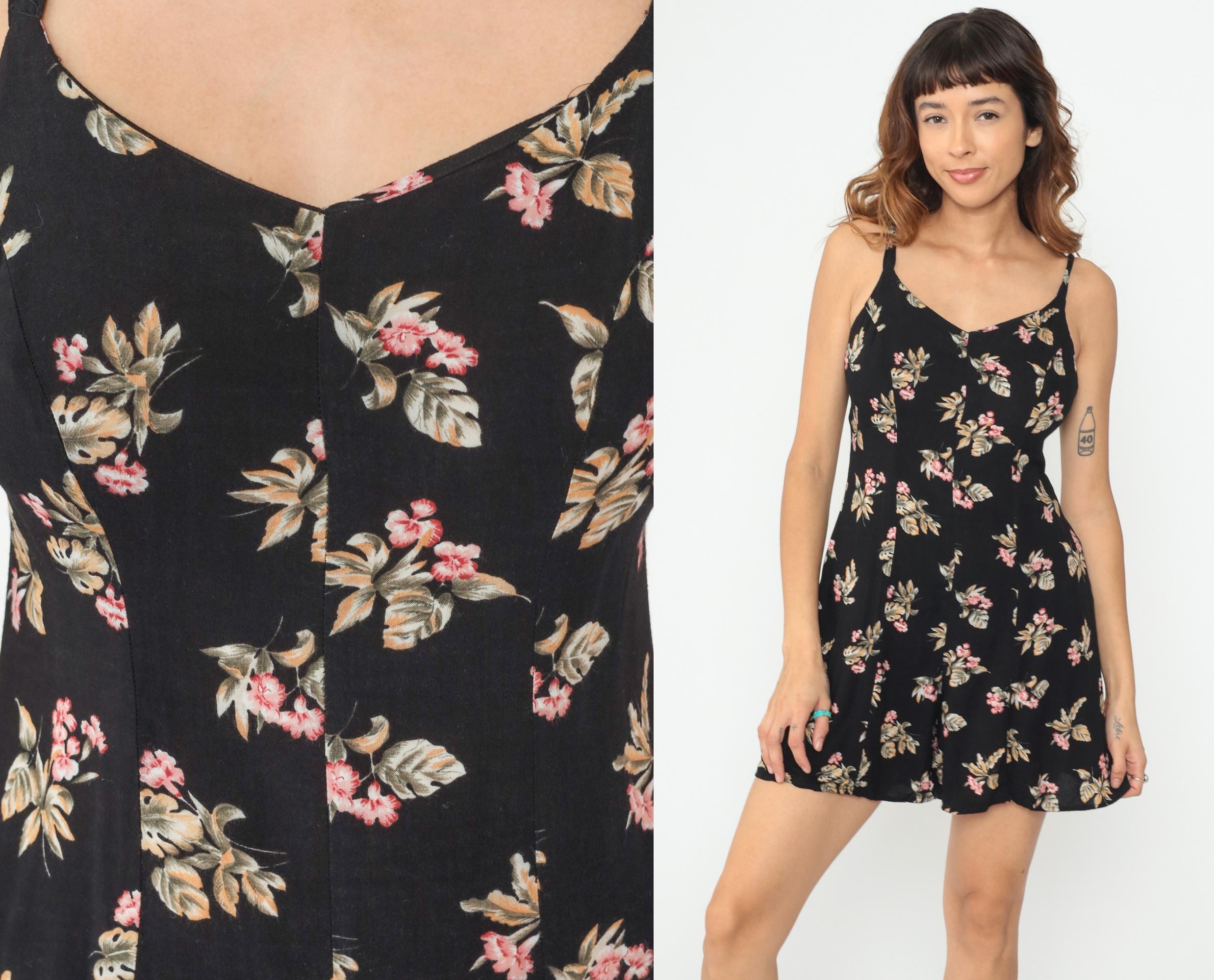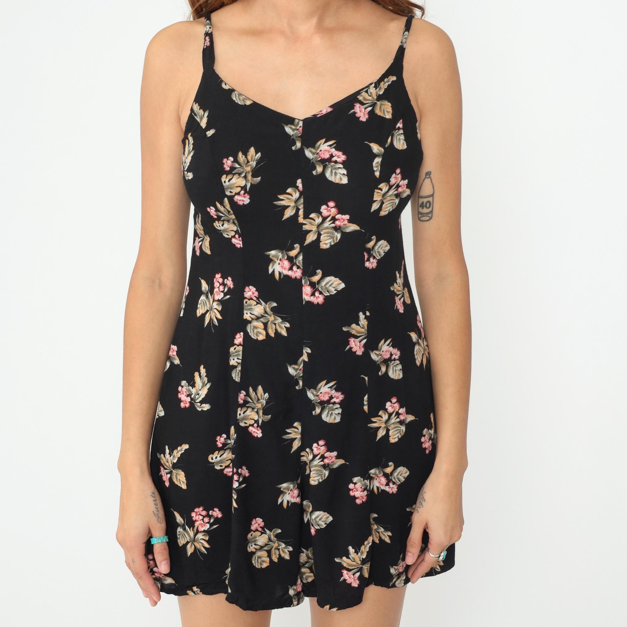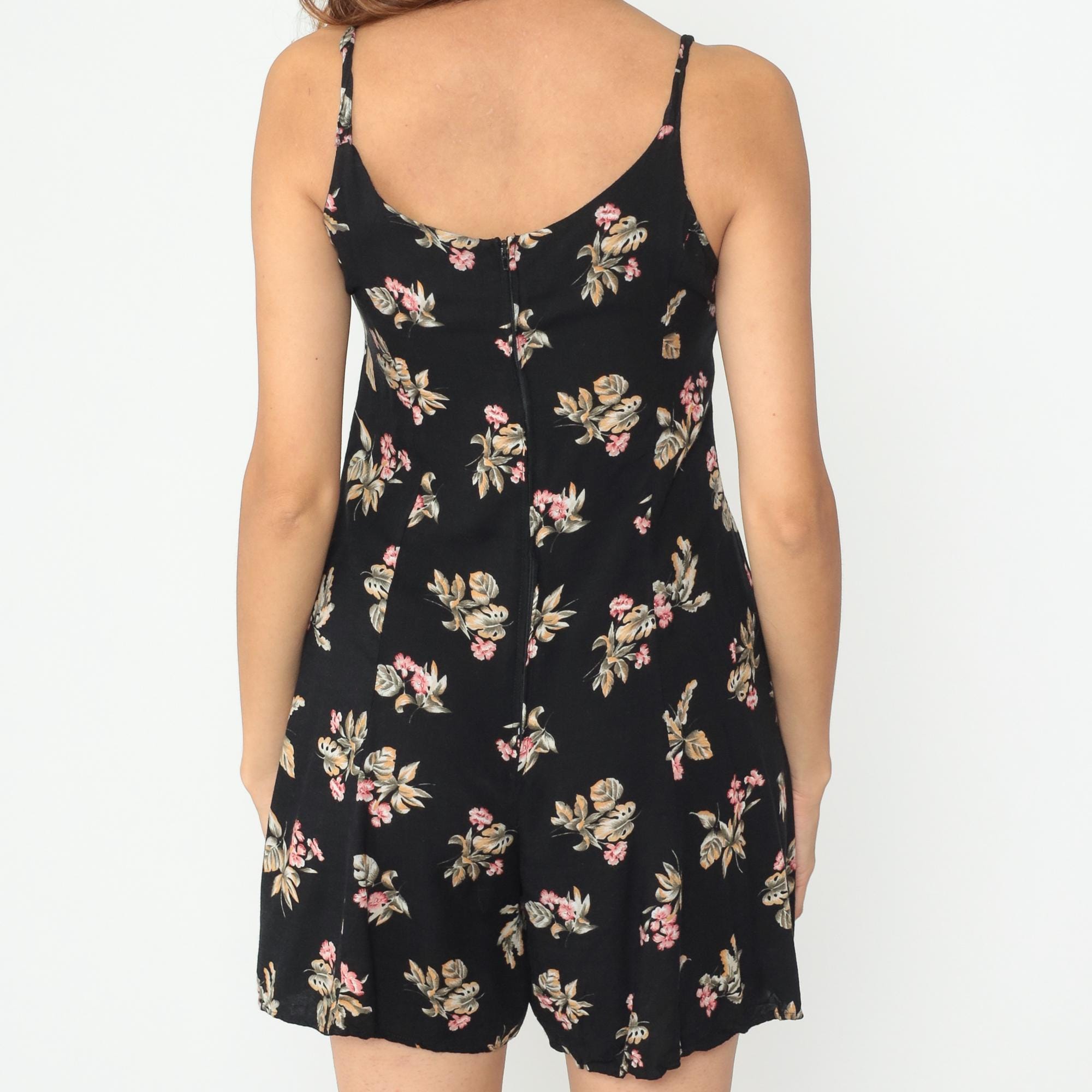 Vintage 90s romper dress in black with a floral print. Sleeveless with back zipper and wide legs.