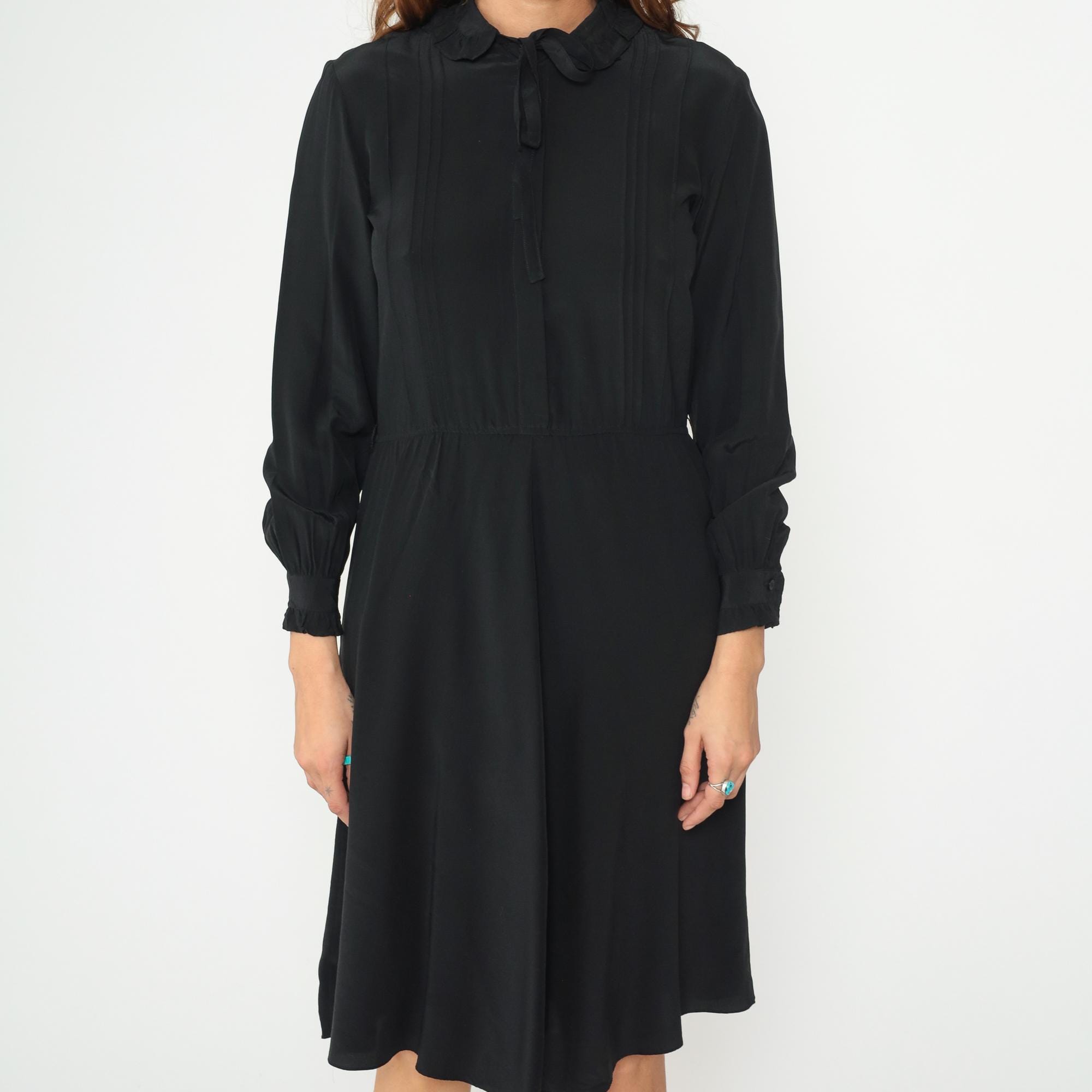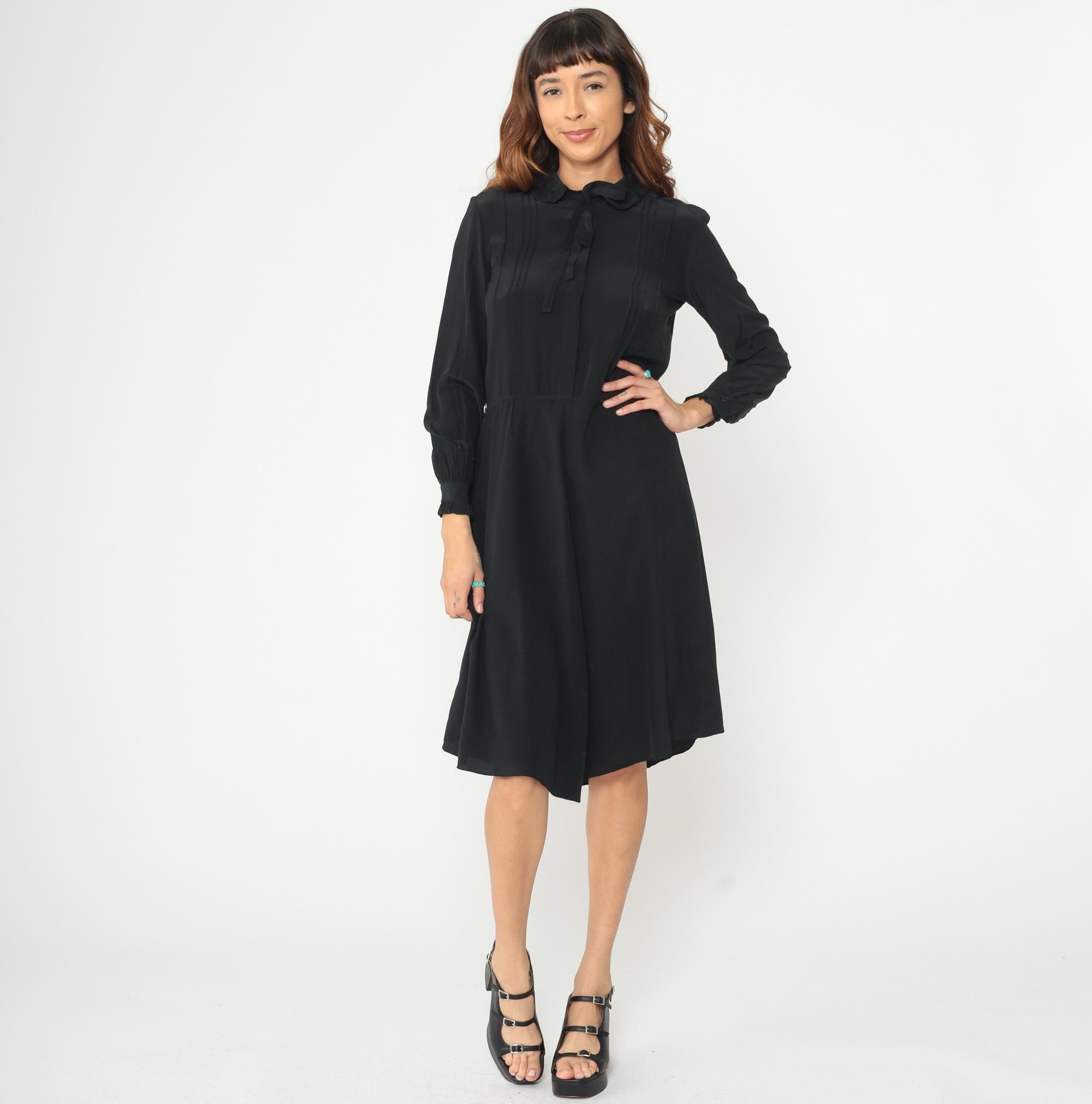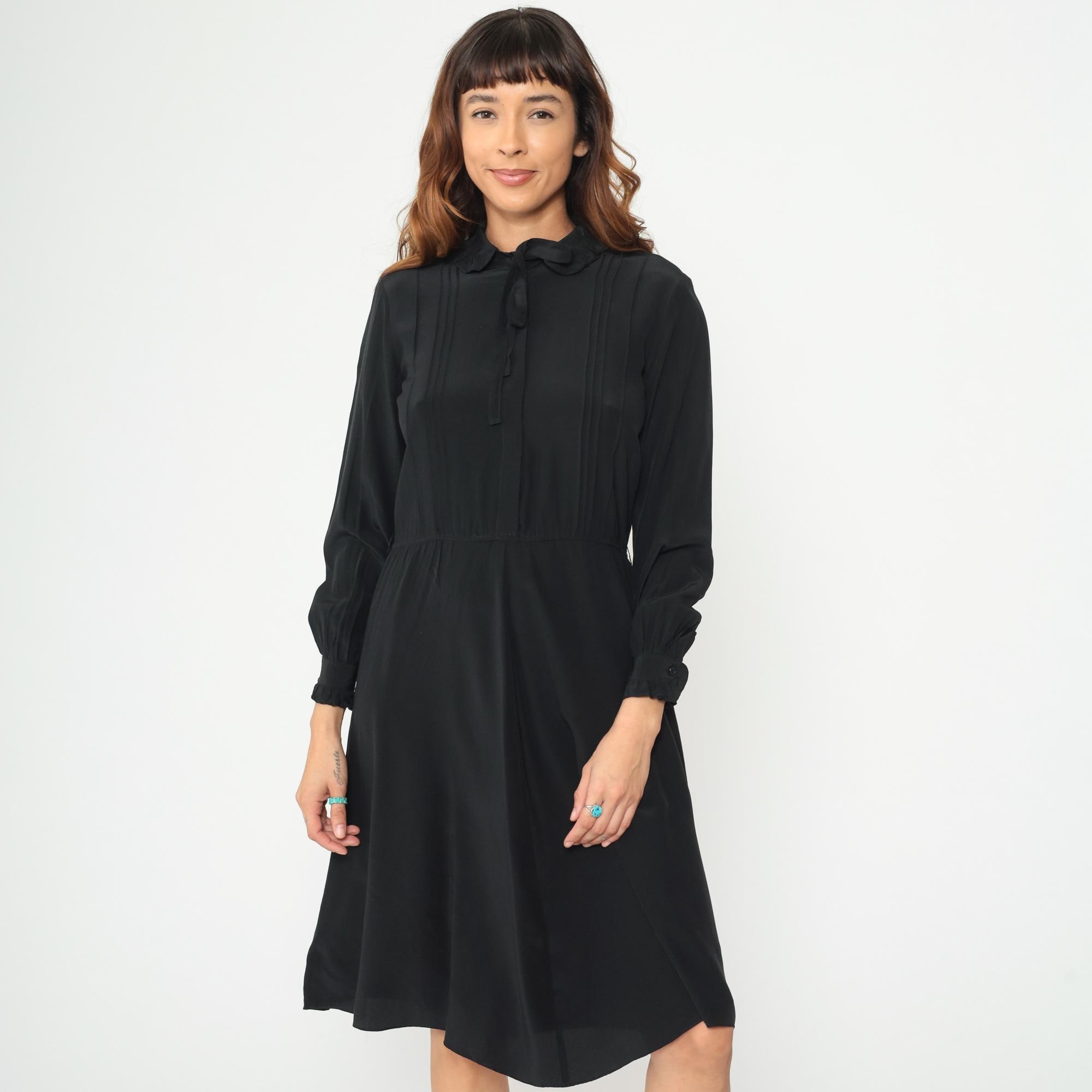 Vintage 1980s black dress from Silky Way featuring a pussy bow tie collar at the neckline. The dress has long sleeves with elastic cuffs, pintuck pleating detail on the bodice, and an elastic waistband. Midi length with a flowing A-line skirt. Made from silk.