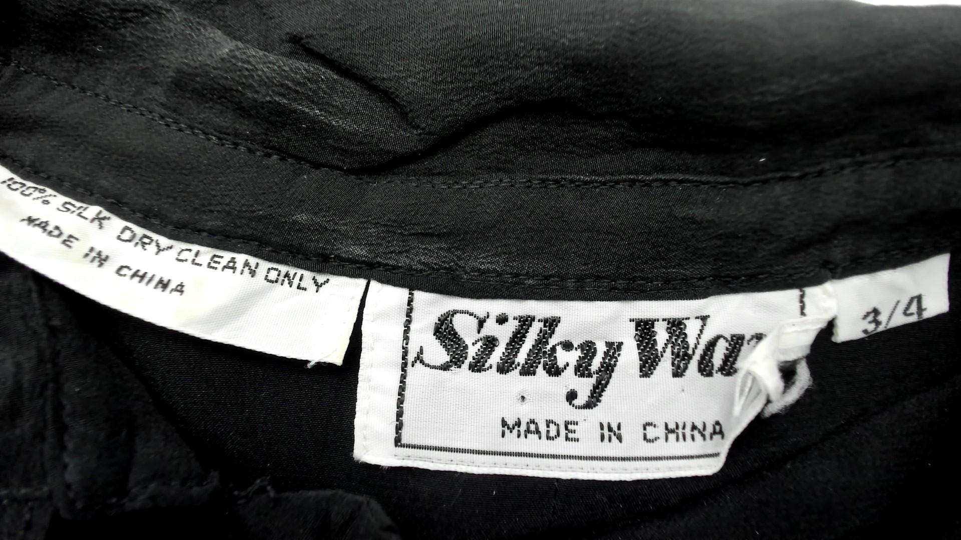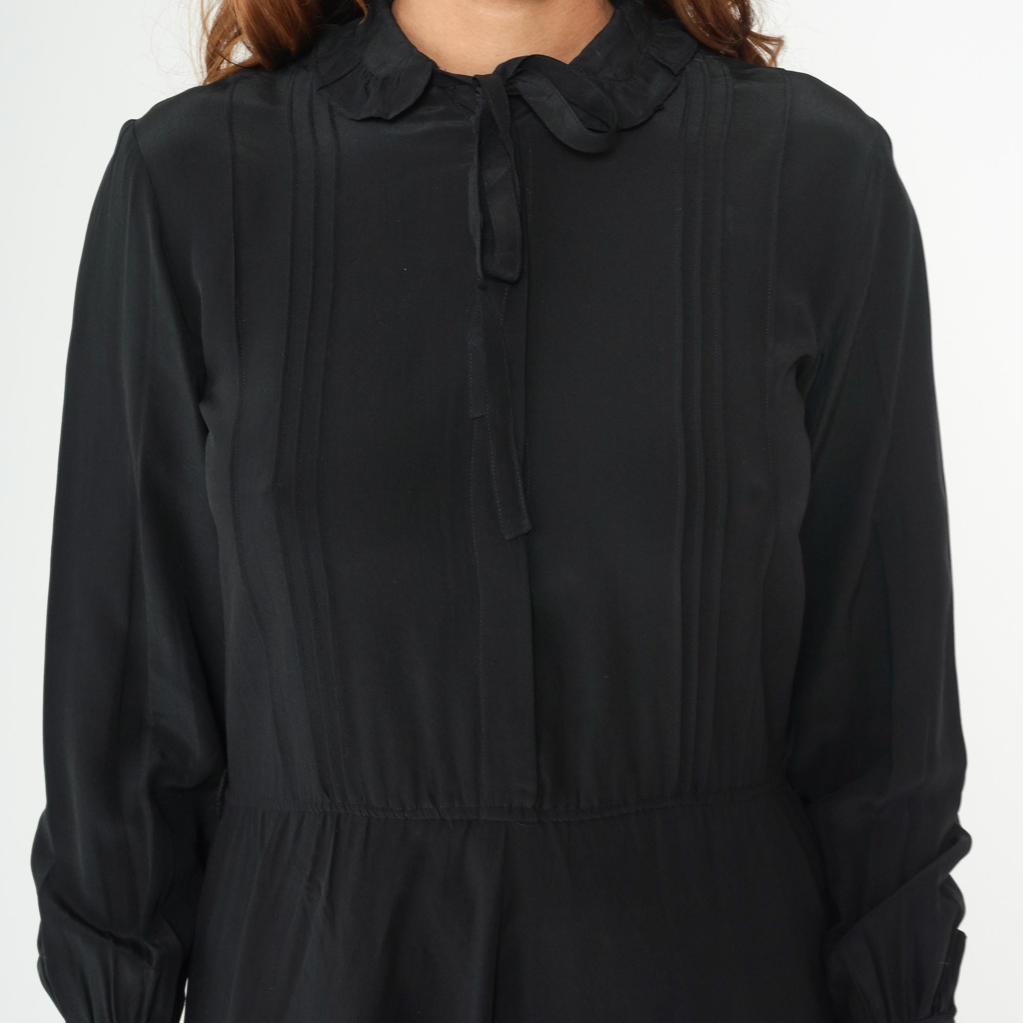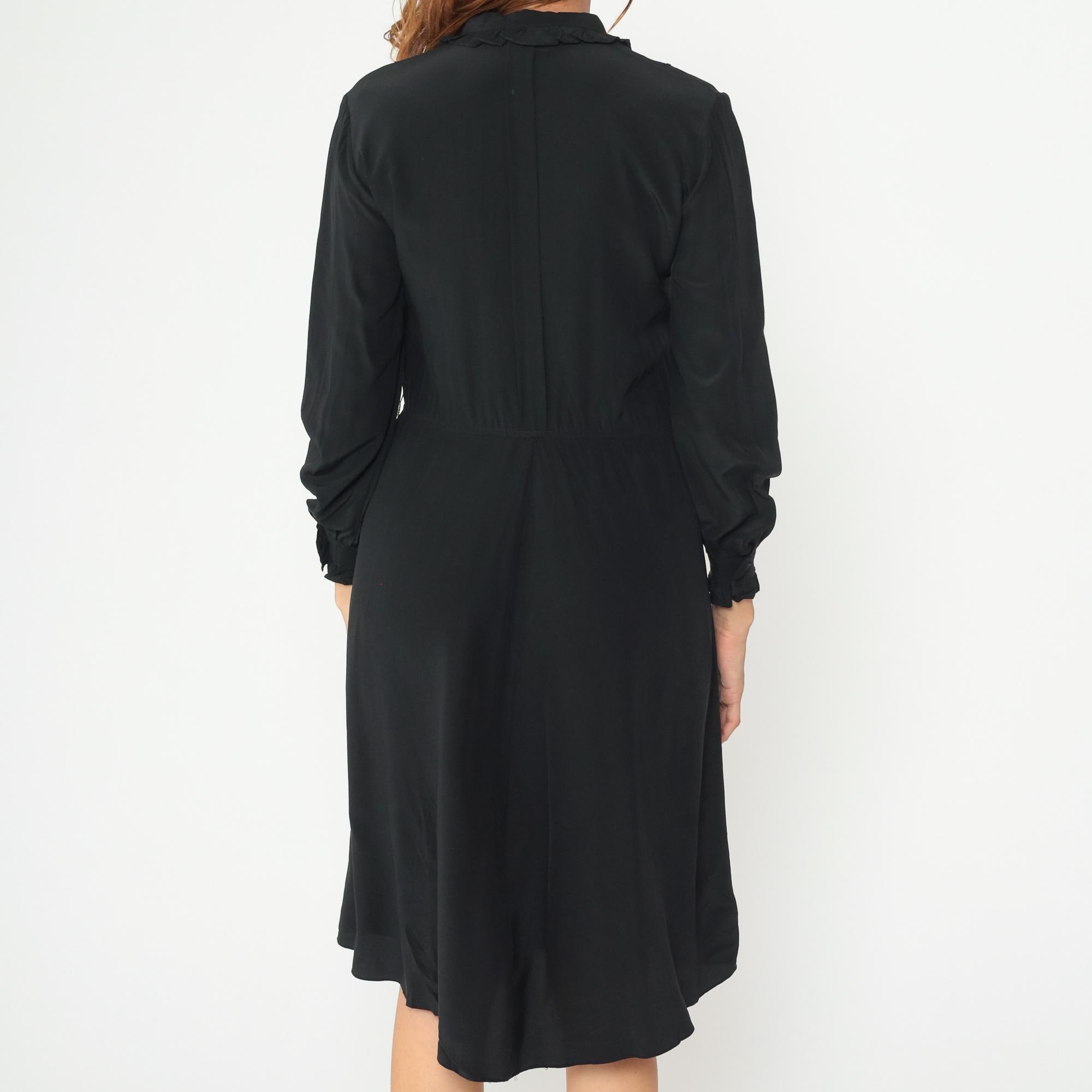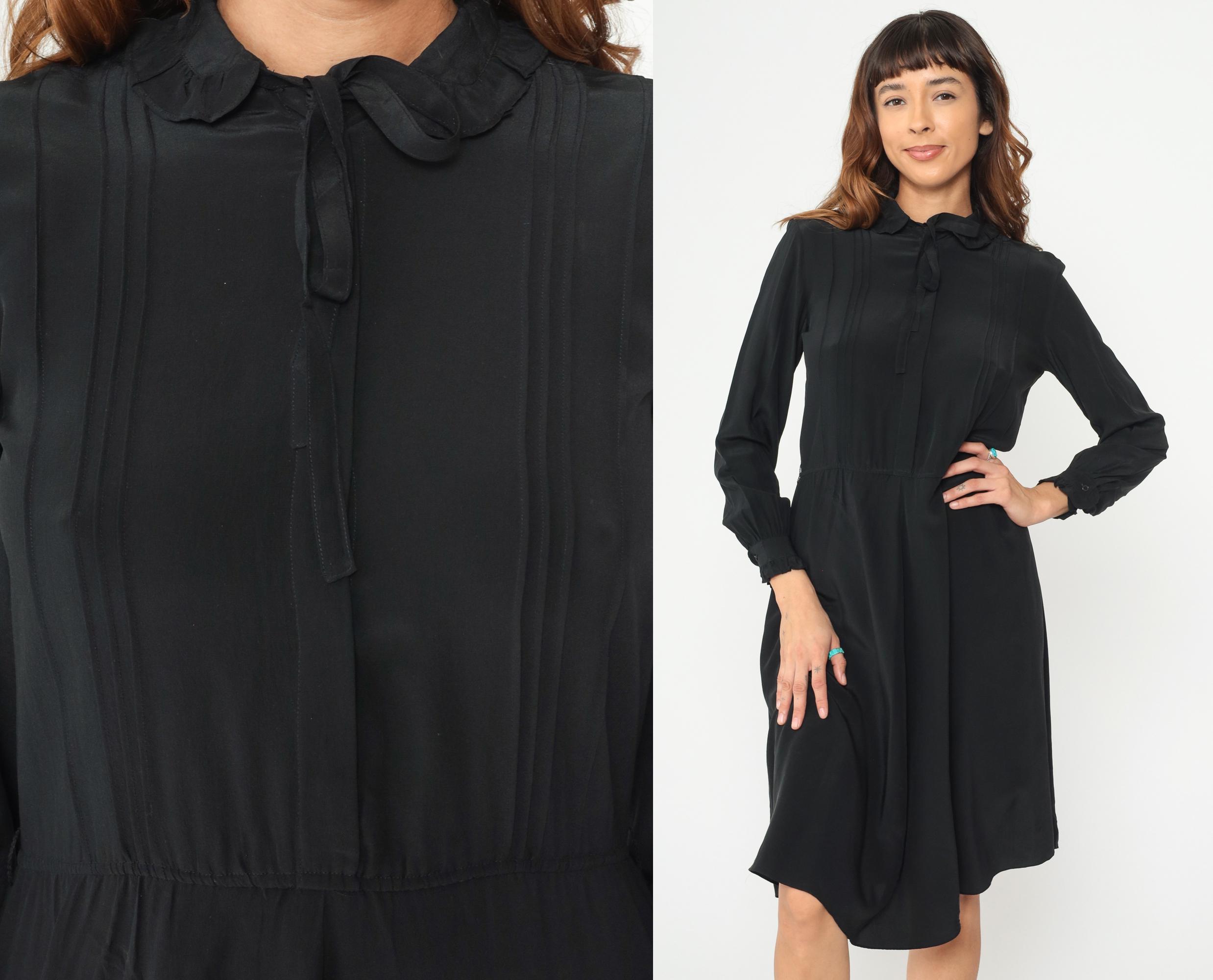 Vintage 1980s black dress from Silky Way featuring a pussy bow tie collar at the neckline. The dress has long sleeves with elastic cuffs, pintuck pleating detail on the bodice, and an elastic waistband. Midi length with a flowing A-line skirt. Made from silk.