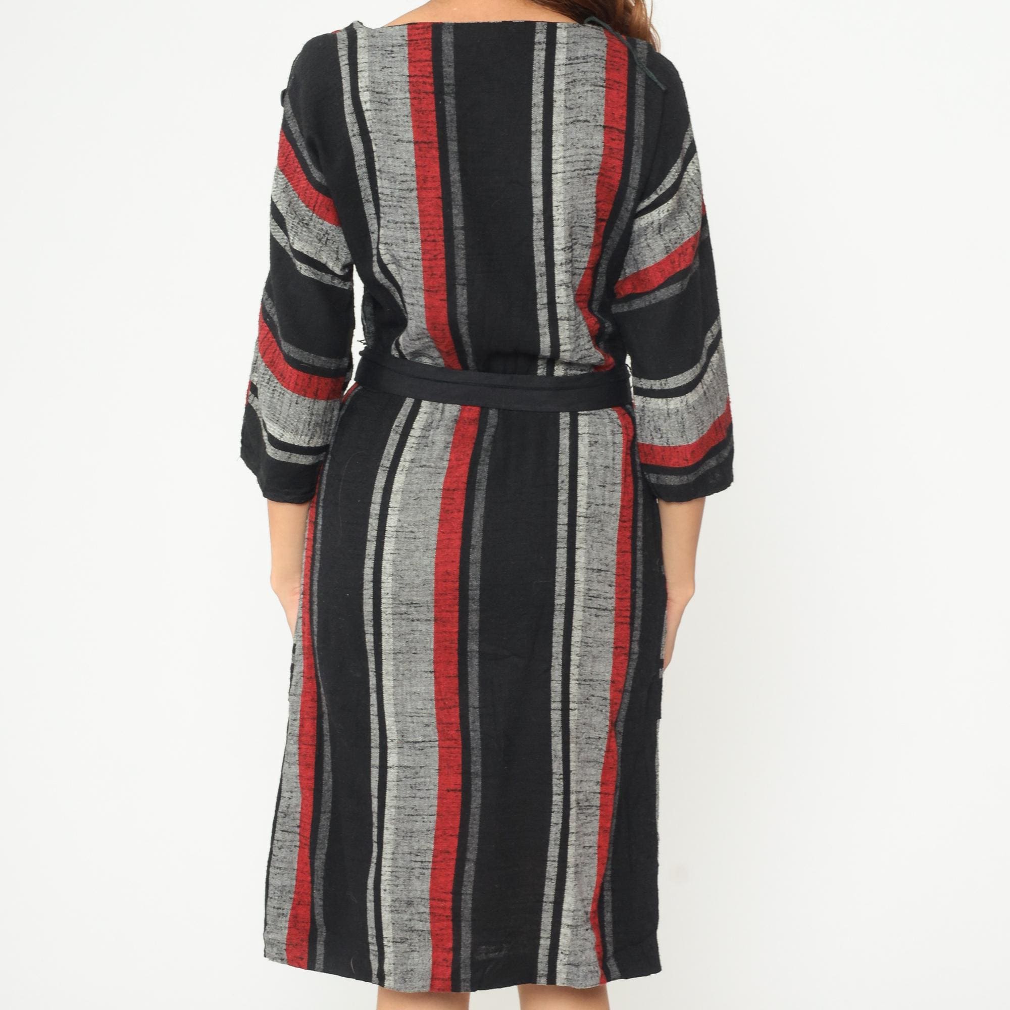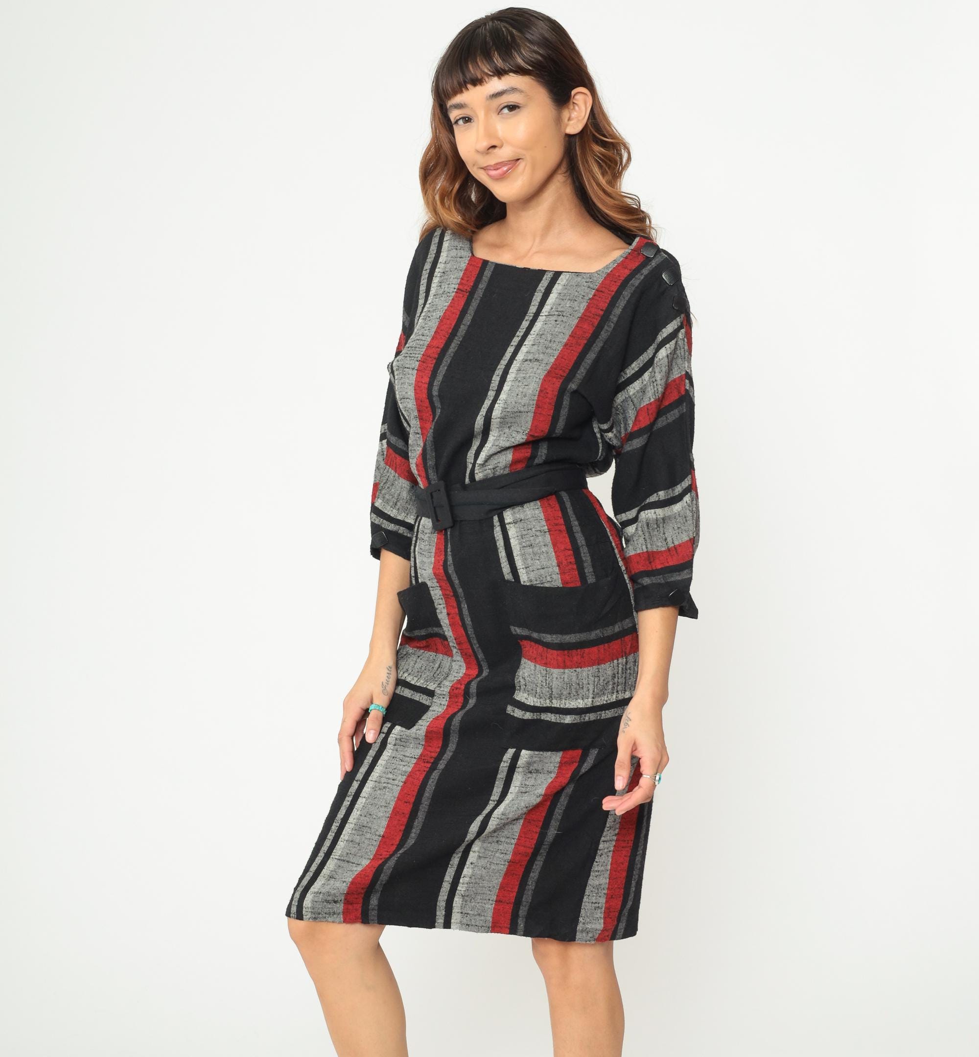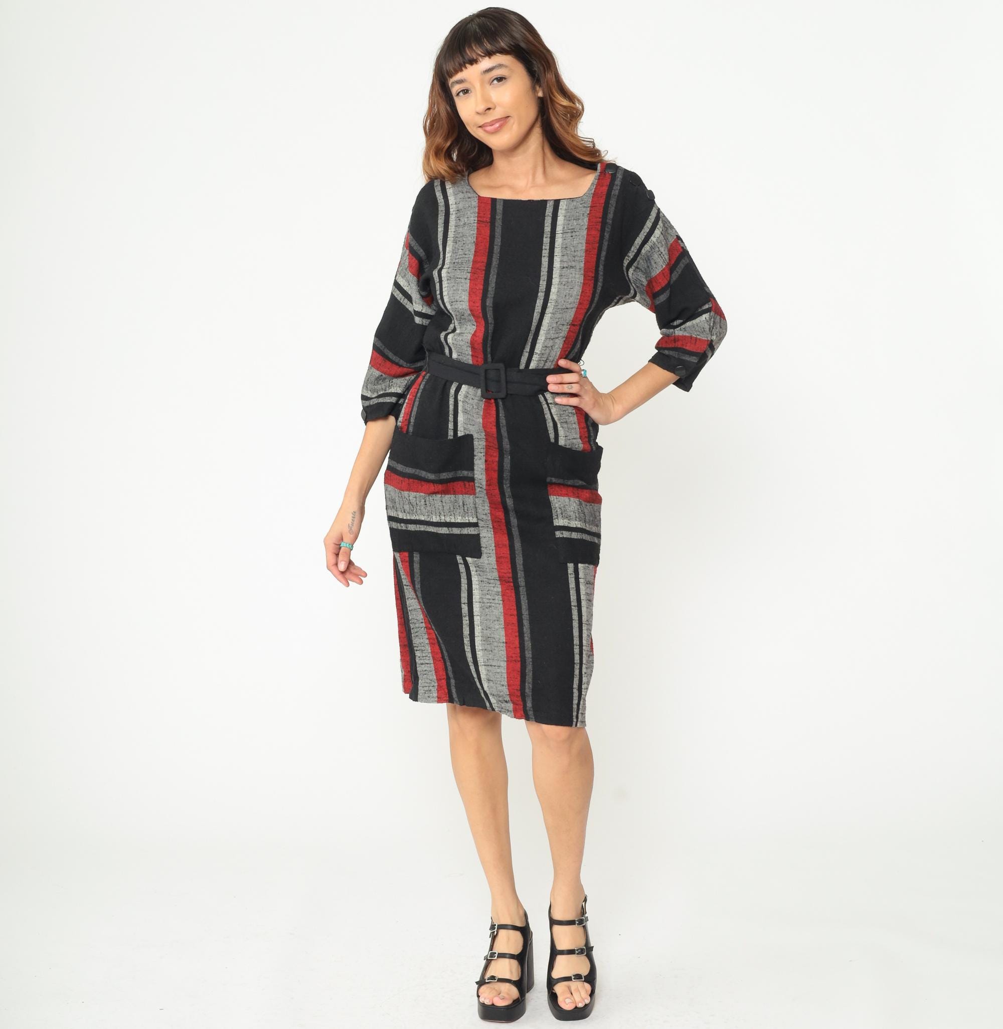 Vintage 1980s dress featuring bold vertical stripes in red, gray, and black. The dress has a square neckline, 3/4 length sleeves with elastic cuffs, and comes with a matching fabric belt with covered buckle closure. Midi length with side seam pockets.