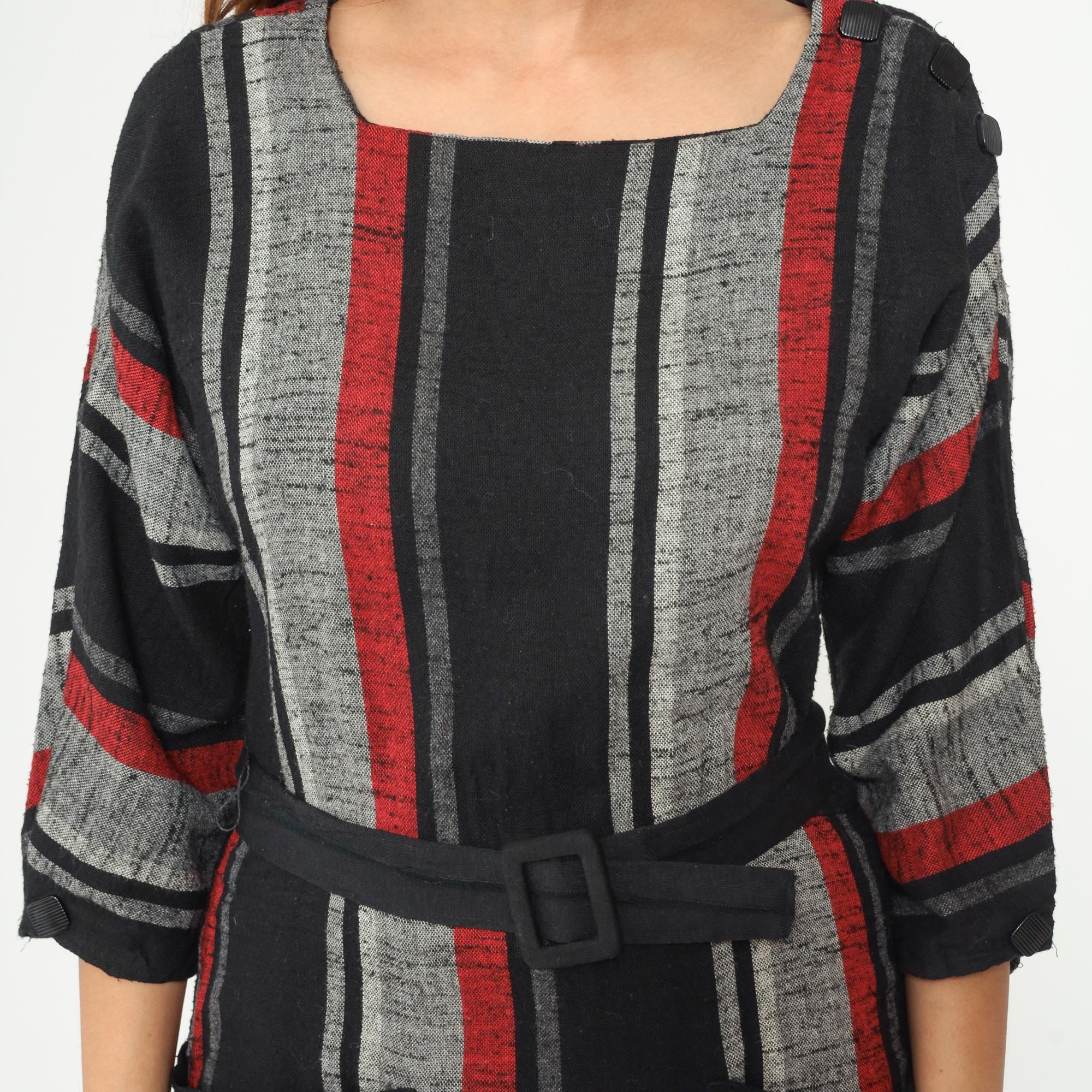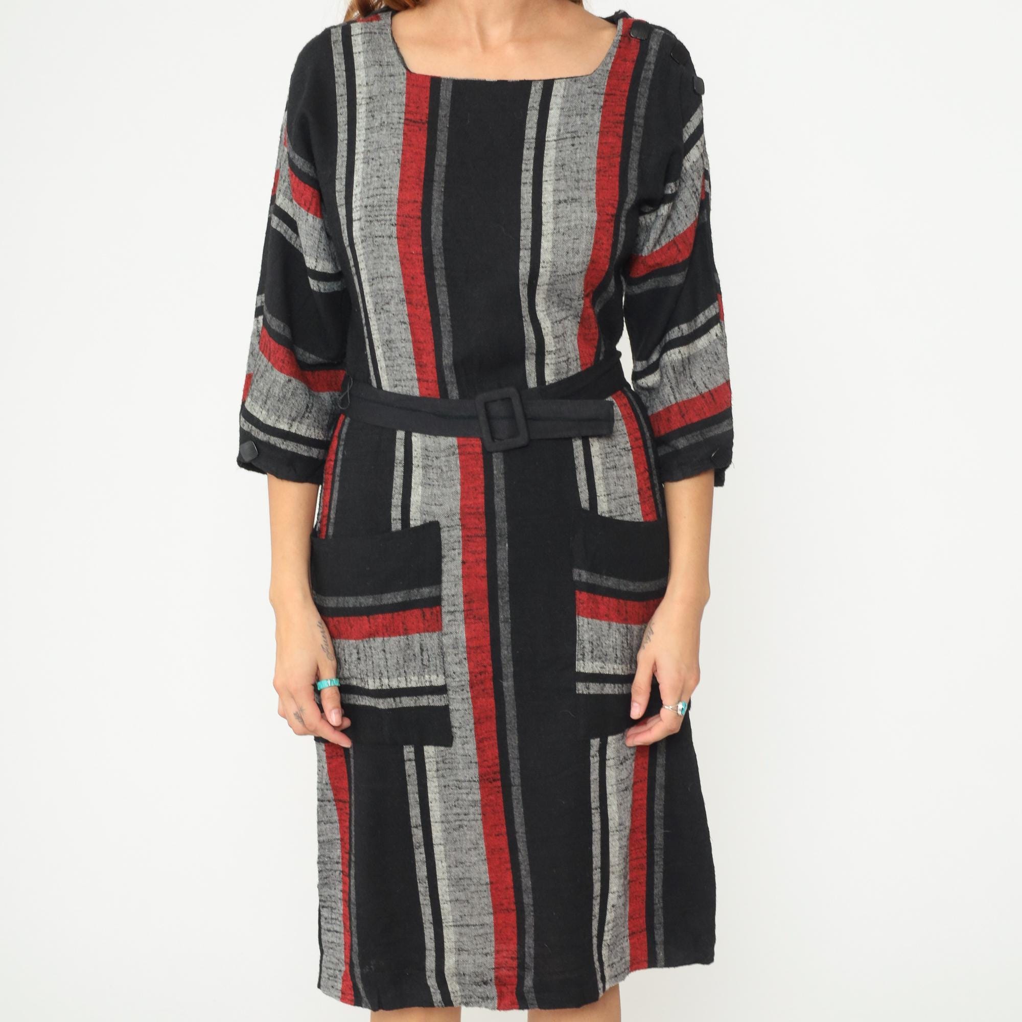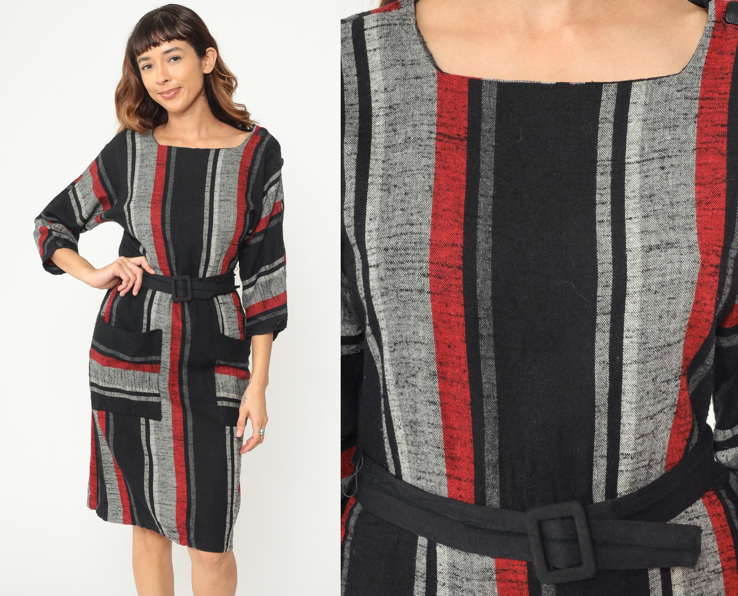 Vintage 1980s dress featuring bold vertical stripes in red, gray, and black. The dress has a square neckline, 3/4 length sleeves with elastic cuffs, and comes with a matching fabric belt with covered buckle closure. Midi length with side seam pockets.