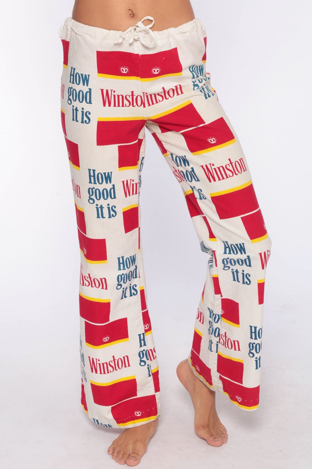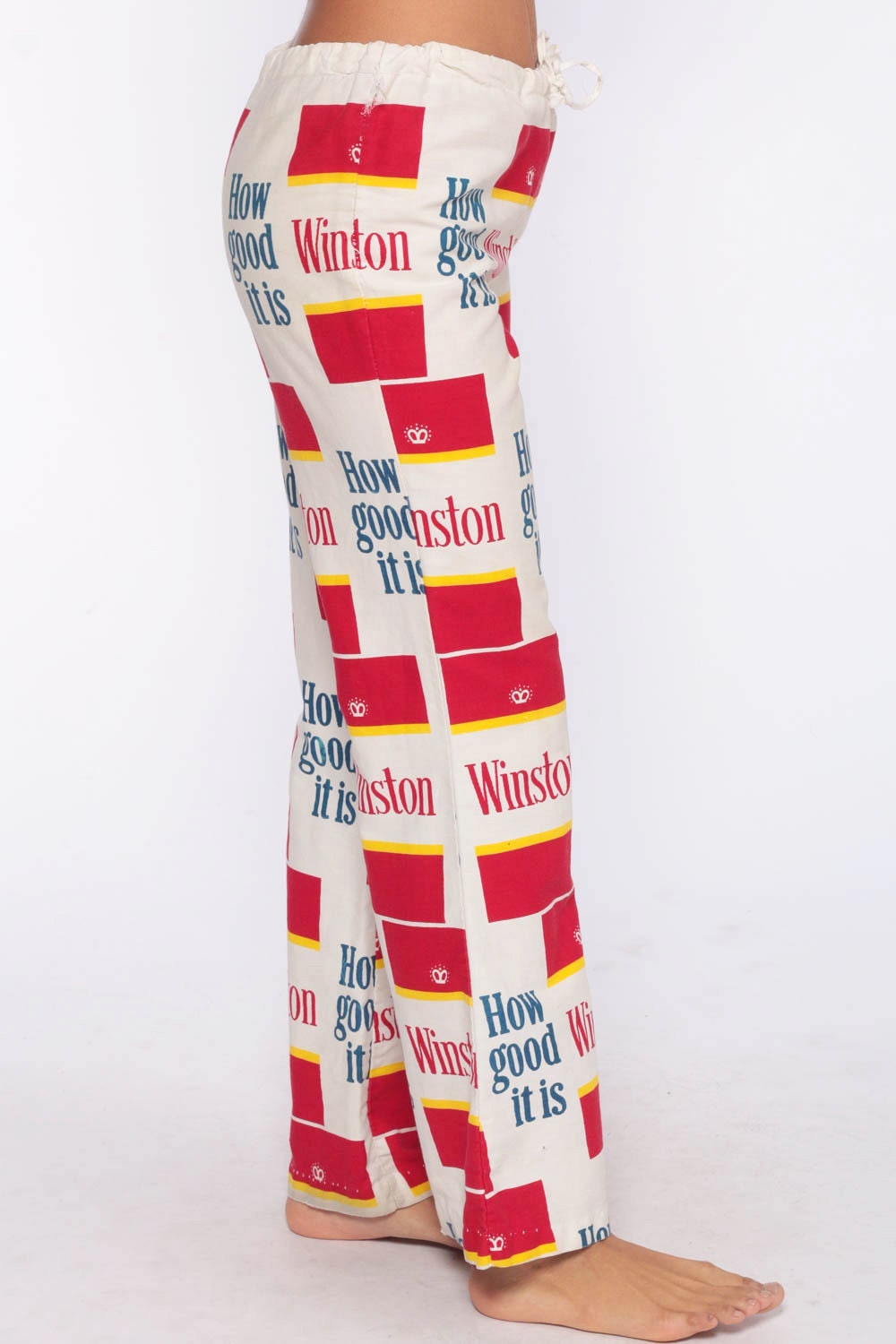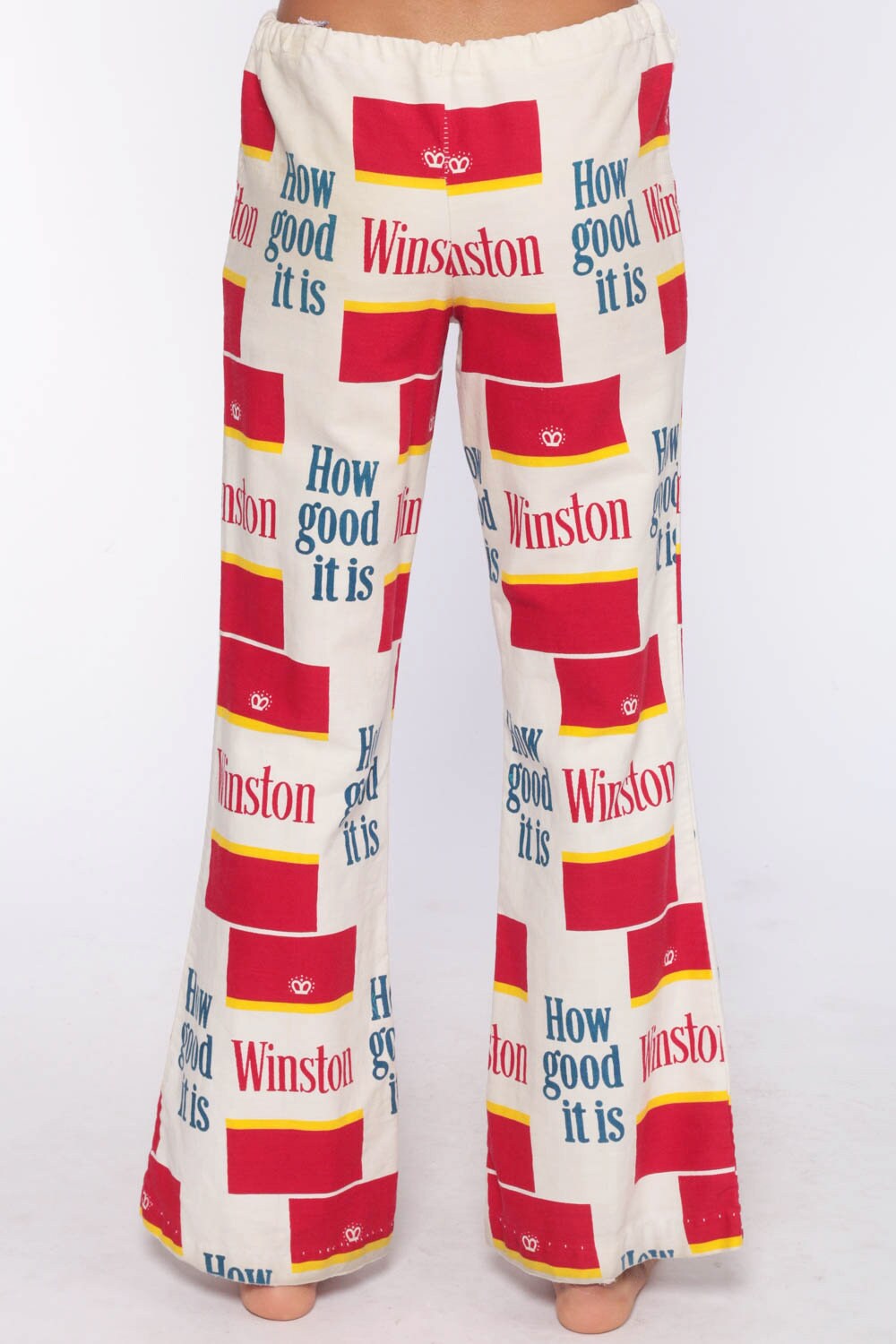 Vintage 70s pants by Winston cigarettes with a block print and "How good it is" written all over. High waisted with wide bell bottoms and a drawstring waist.