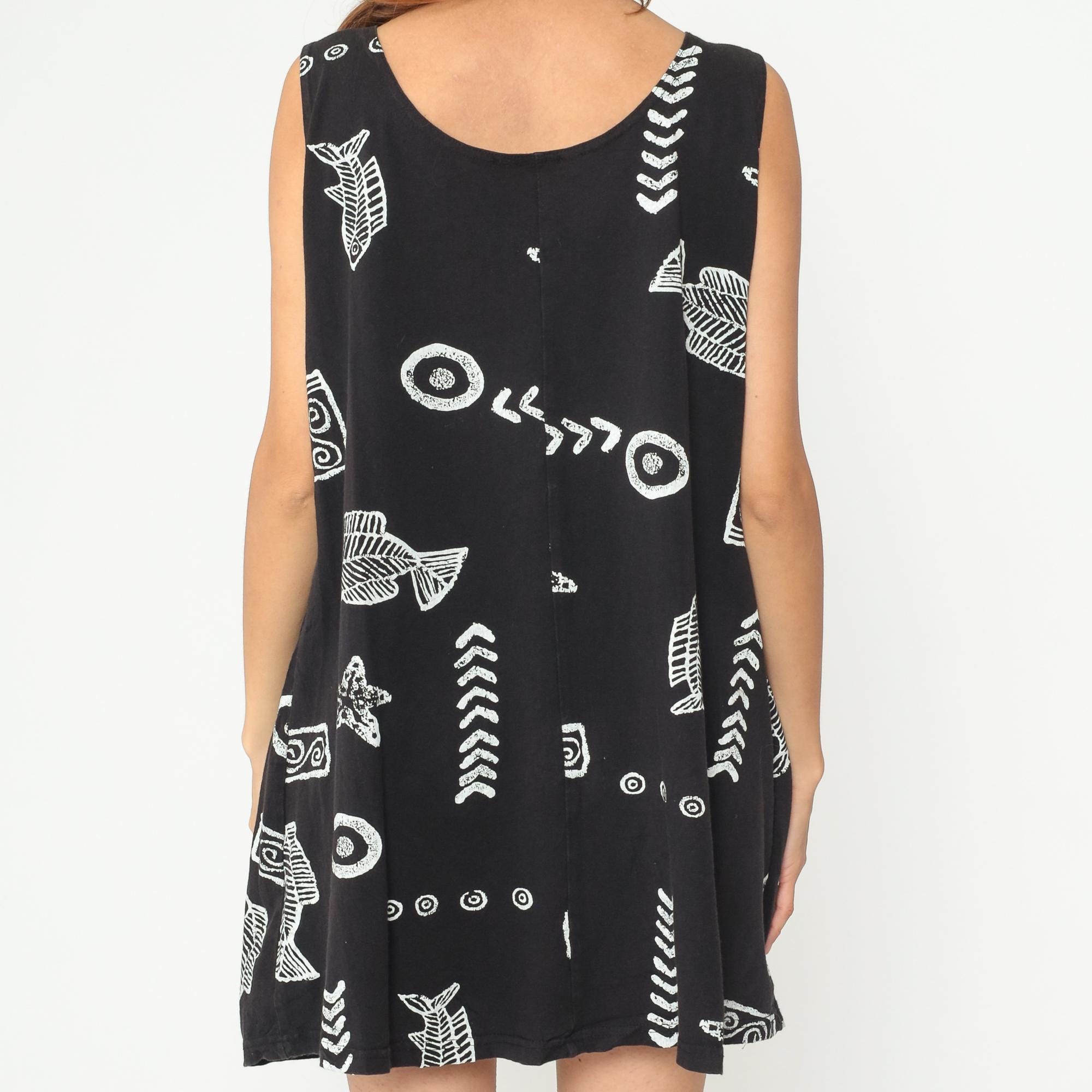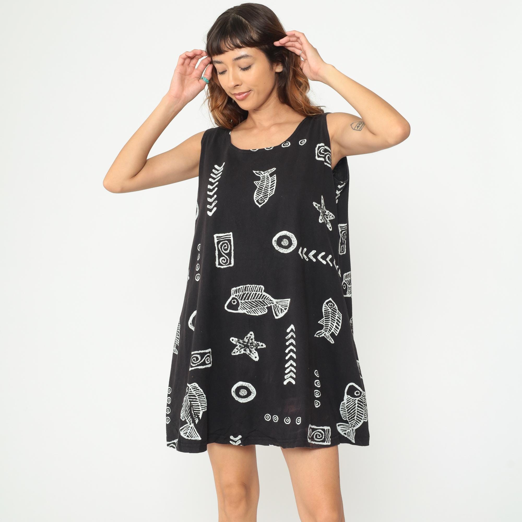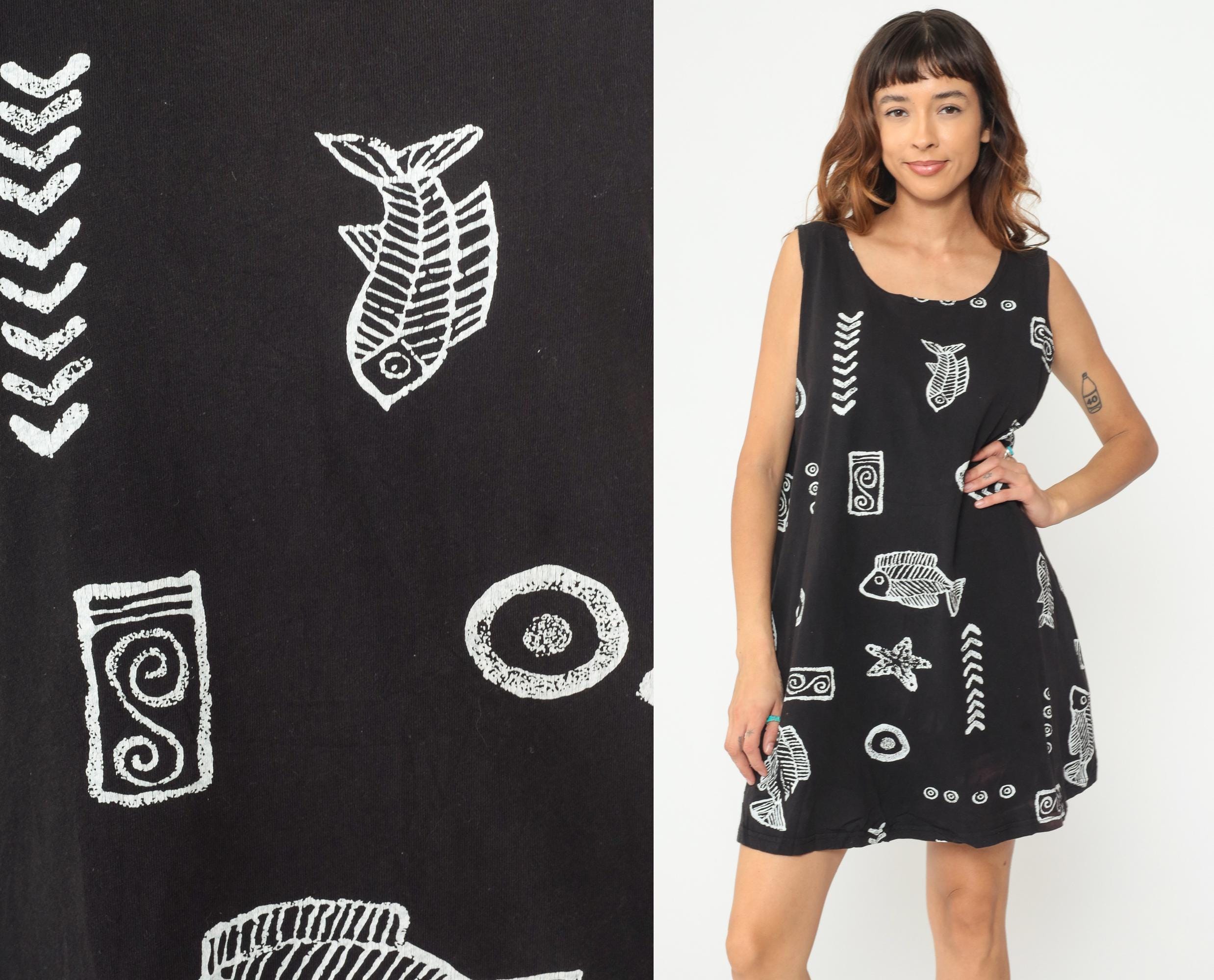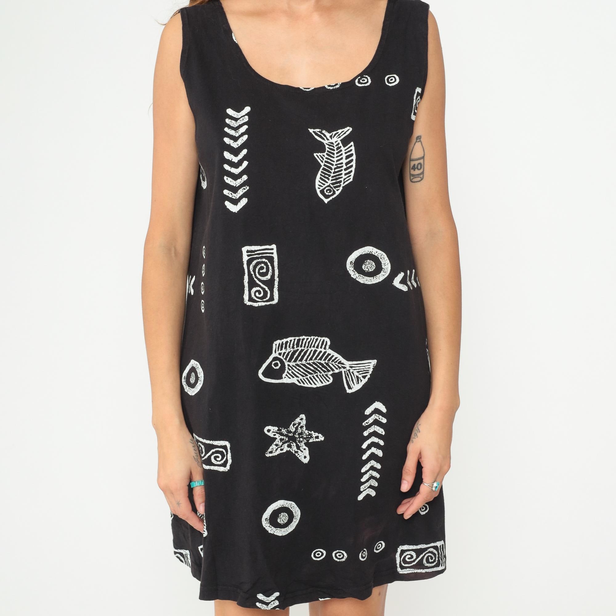 Vintage y2k dress in black with a fish, starfish, and petroglyph print. Sleeveless, mini length.