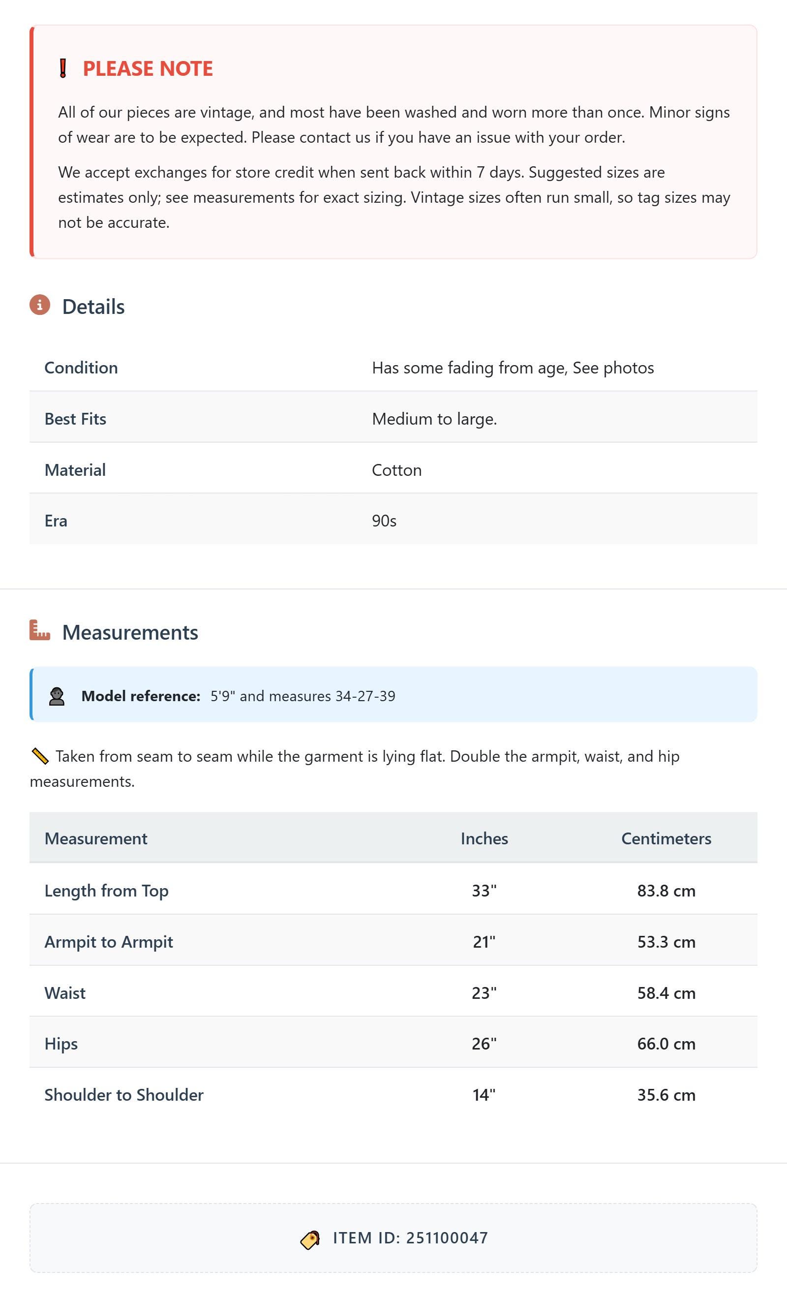 Suggested sizes are estimates only; see measurements for exact sizing. Vintage sizes often run small, so tag sizes may not be accurate.