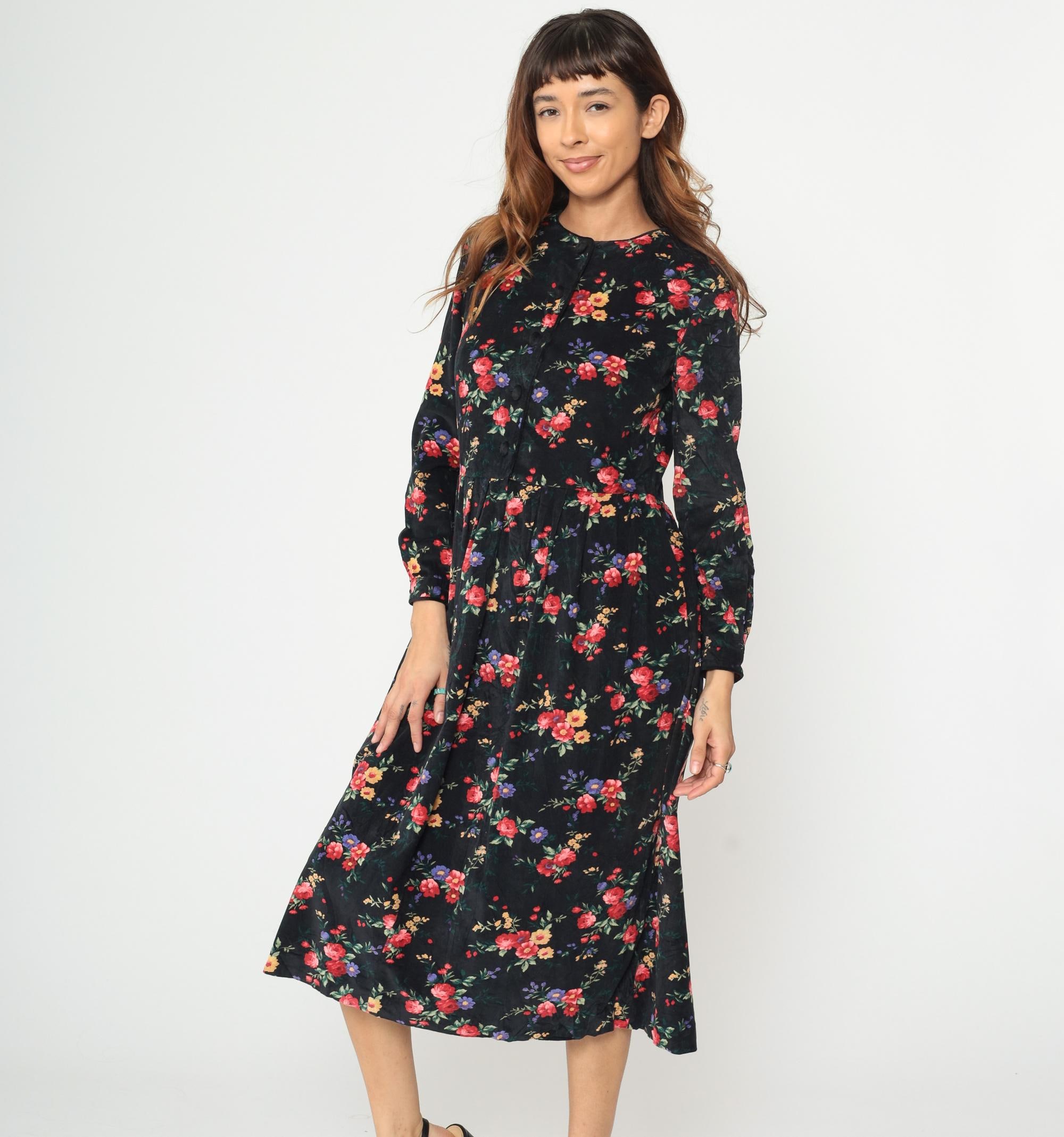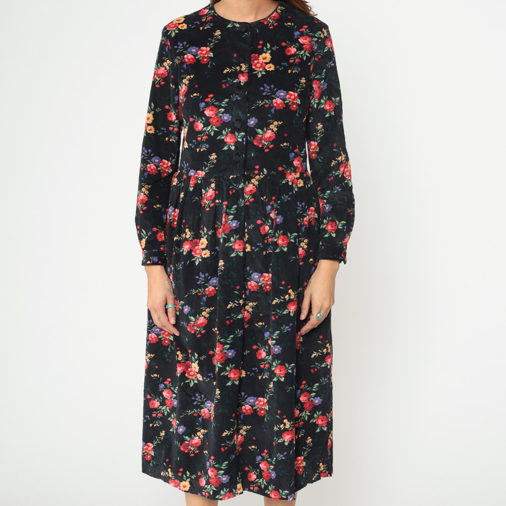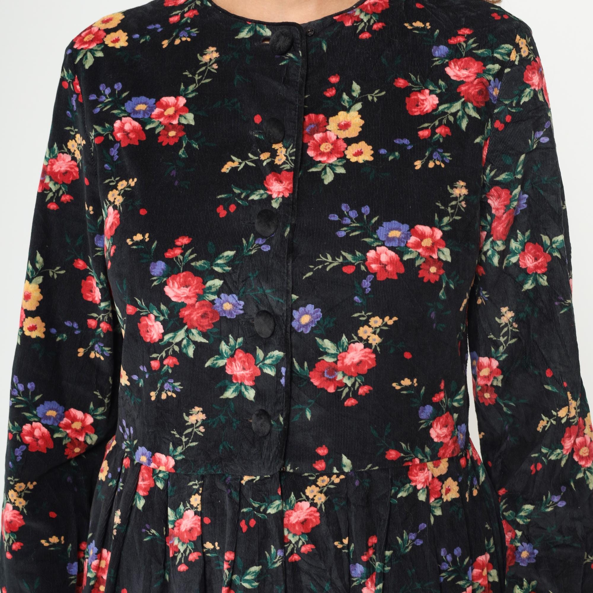 Black floral midi dress from Talbots, made in cotton corduroy. Red, pink, blue, yellow, and green flowers scattered across the fabric. Round neckline with button closures down the front bodice. Long sleeves with button cuffs. Gathered waist creates a full A-line skirt. Tagged size 6p, labeled Talbots.