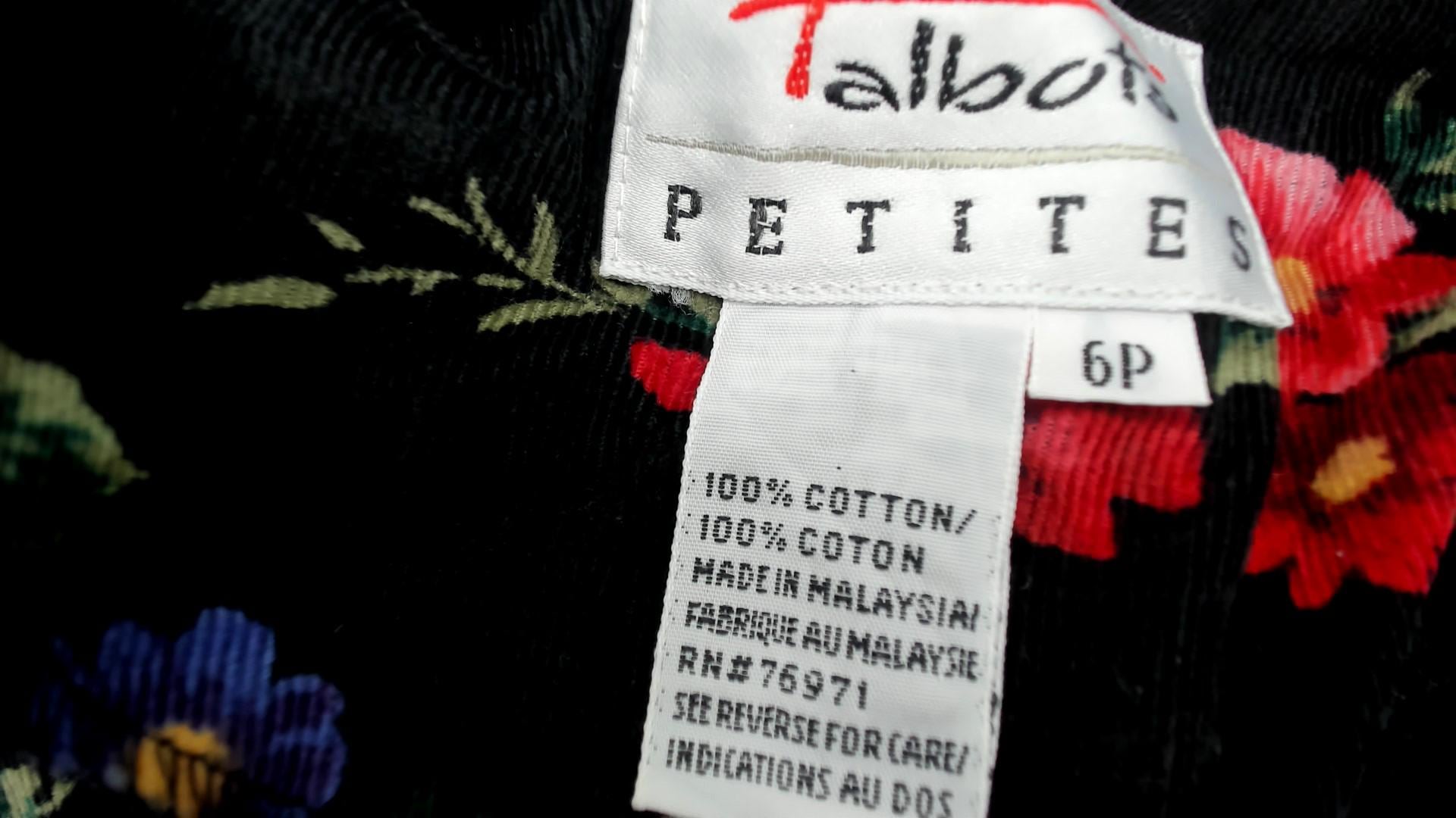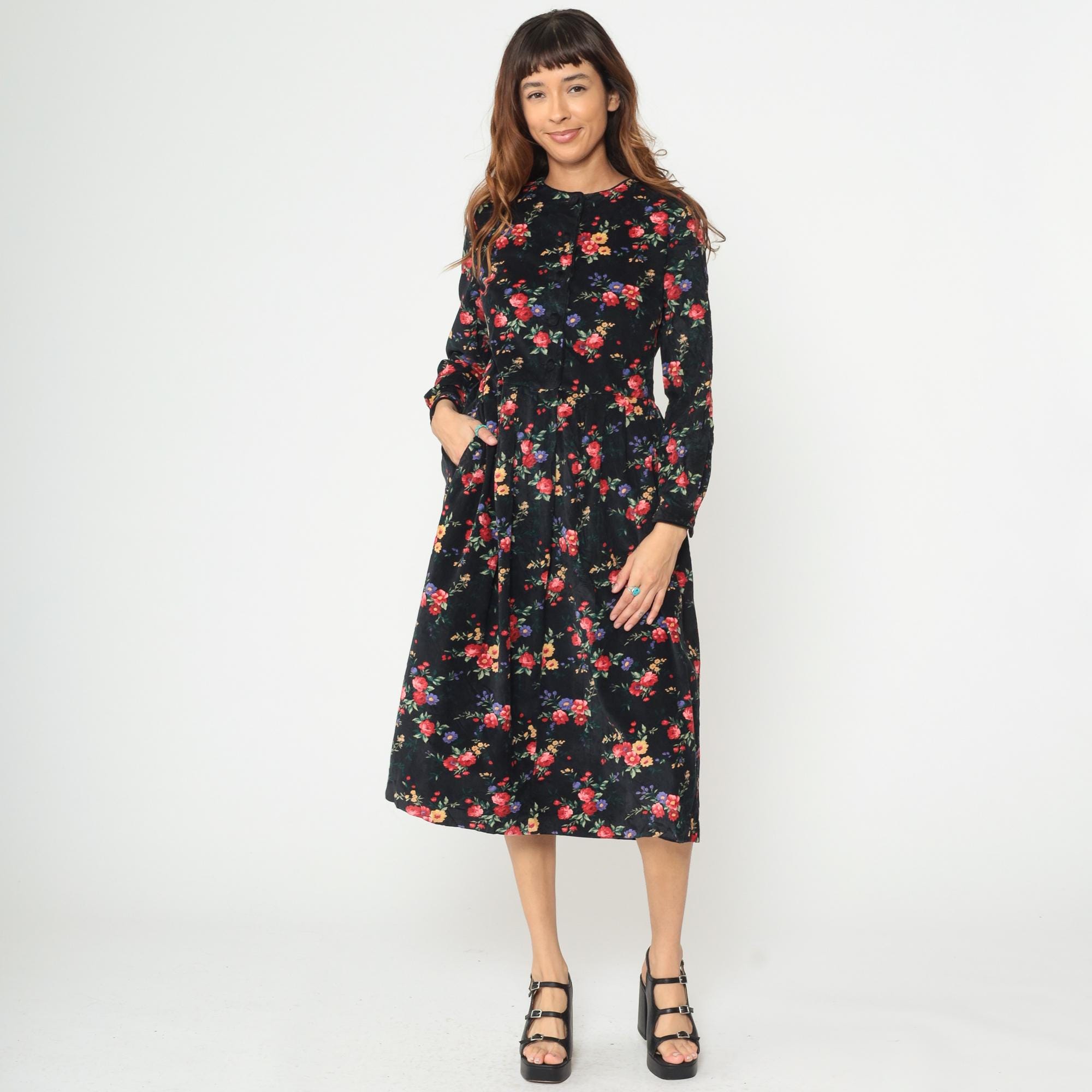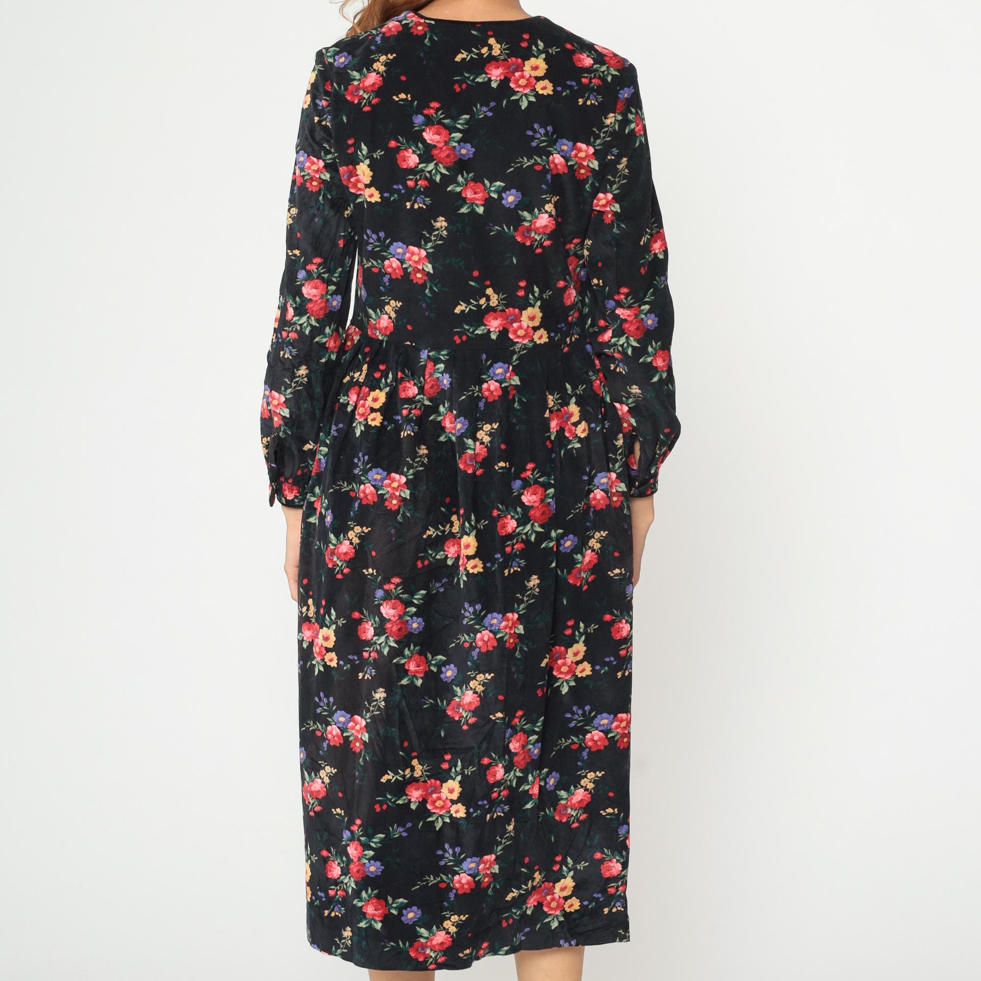 Black floral midi dress from Talbots, made in cotton corduroy. Red, pink, blue, yellow, and green flowers scattered across the fabric. Round neckline with button closures down the front bodice. Long sleeves with button cuffs. Gathered waist creates a full A-line skirt. Tagged size 6p, labeled Talbots.