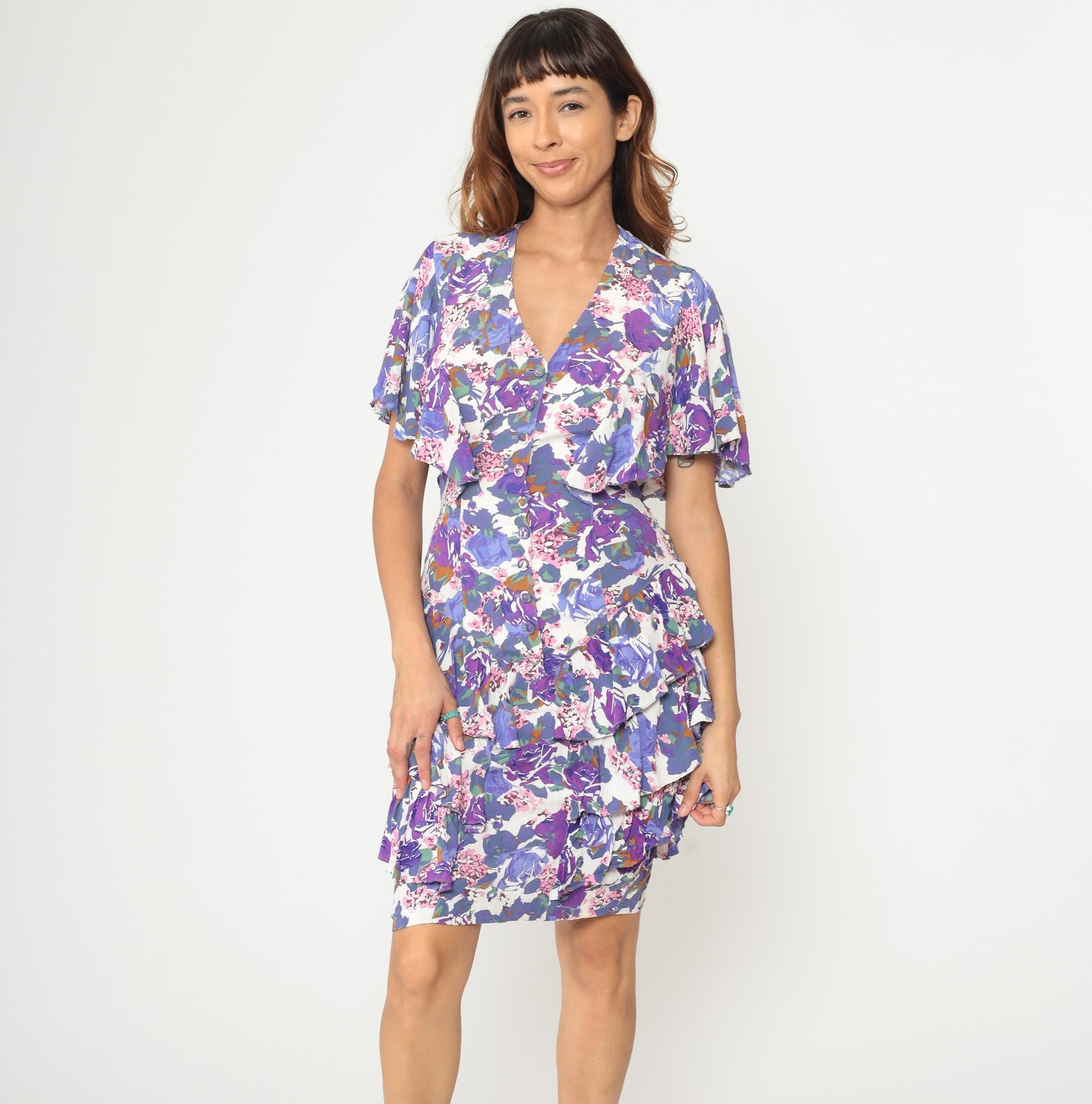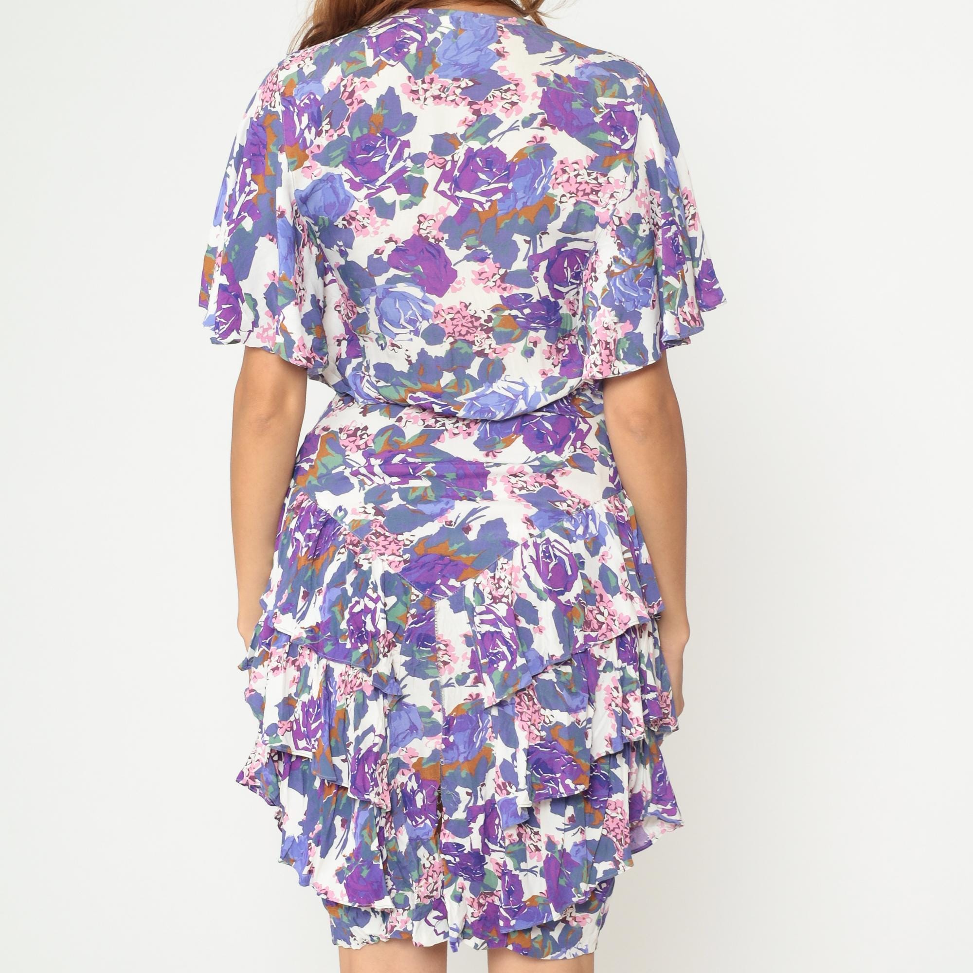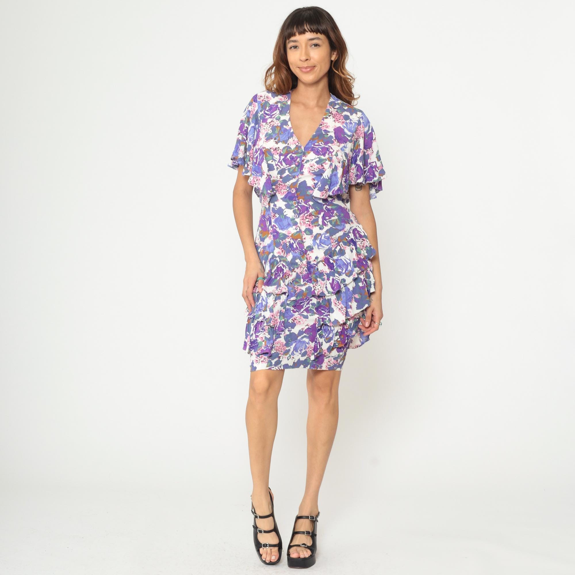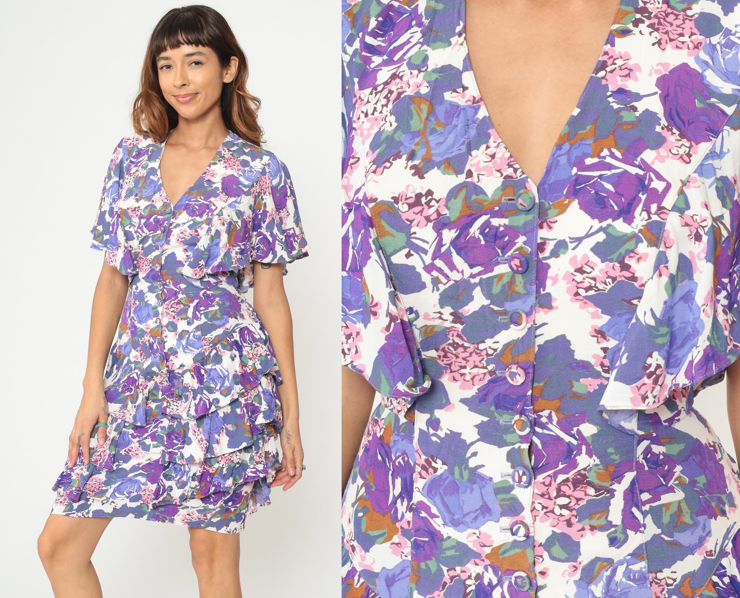 90s floral mini dress from Barbara Barbara in rayon. Purple, pink, blue, and white watercolor-style floral print. V-neckline with button-front bodice. Flutter sleeves. Fitted waist. Tiered ruffle hem. Unlined. Tagged size 4.