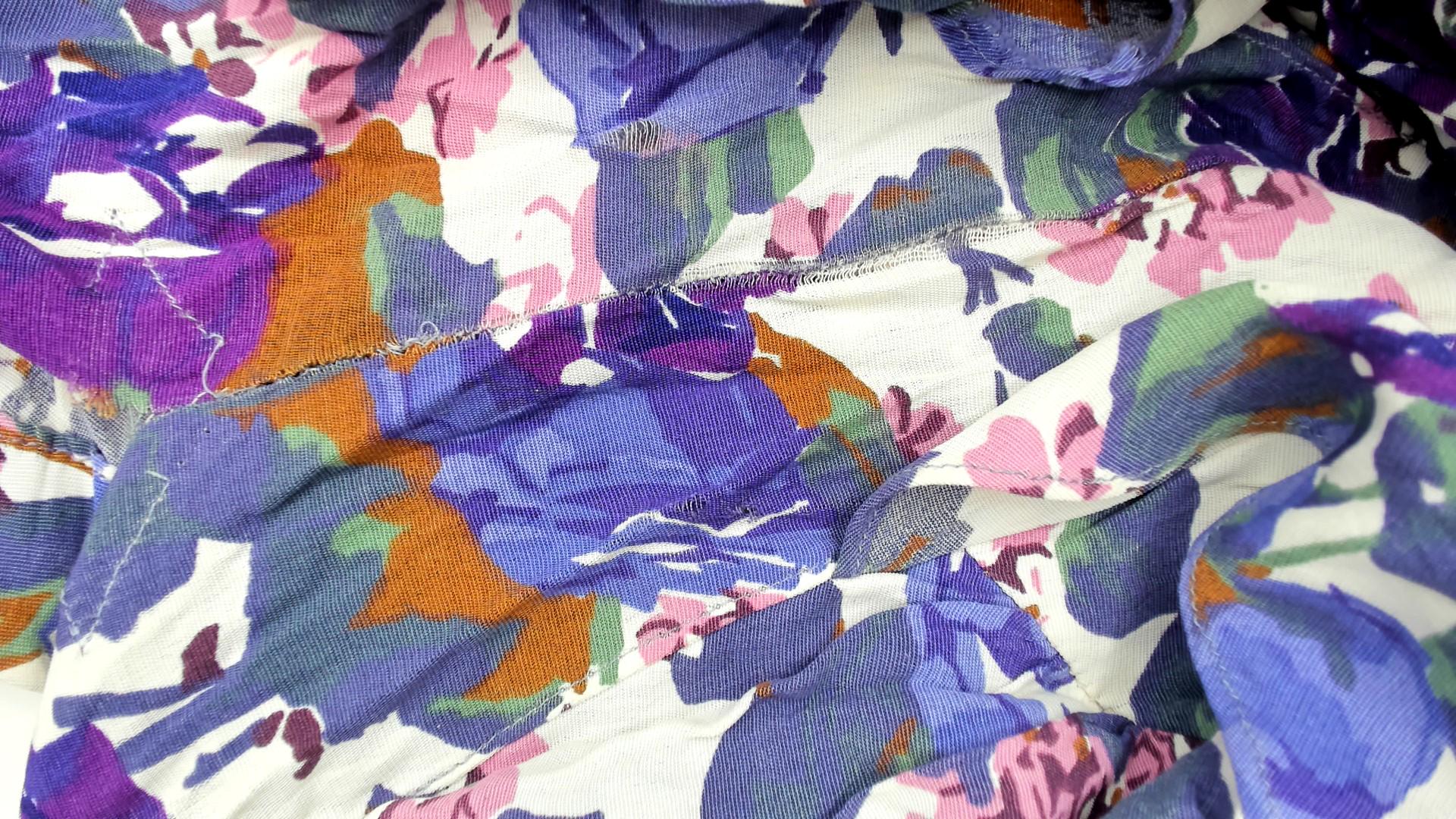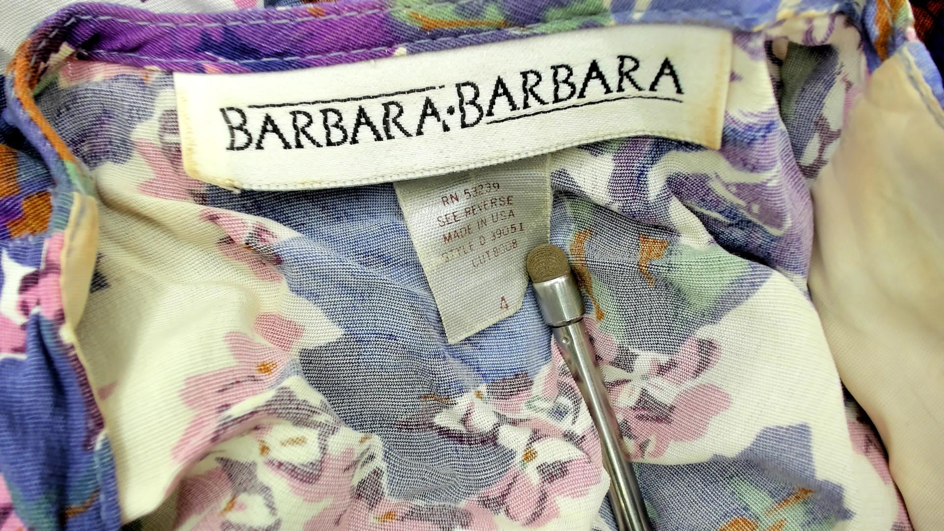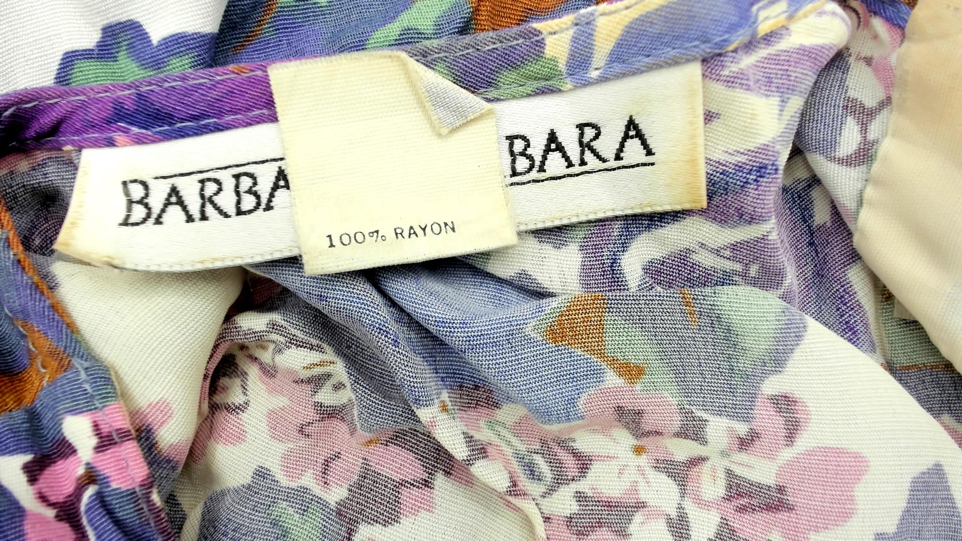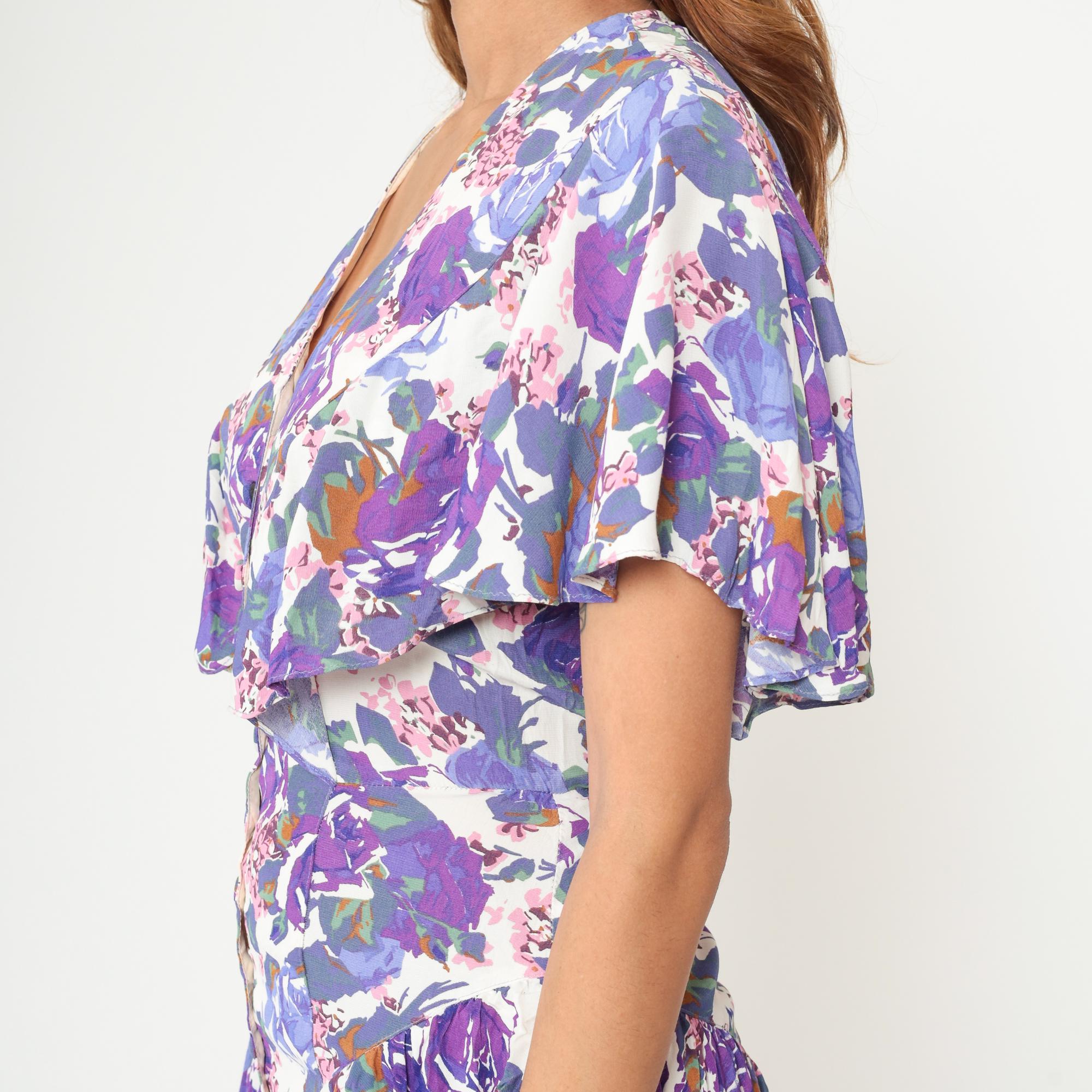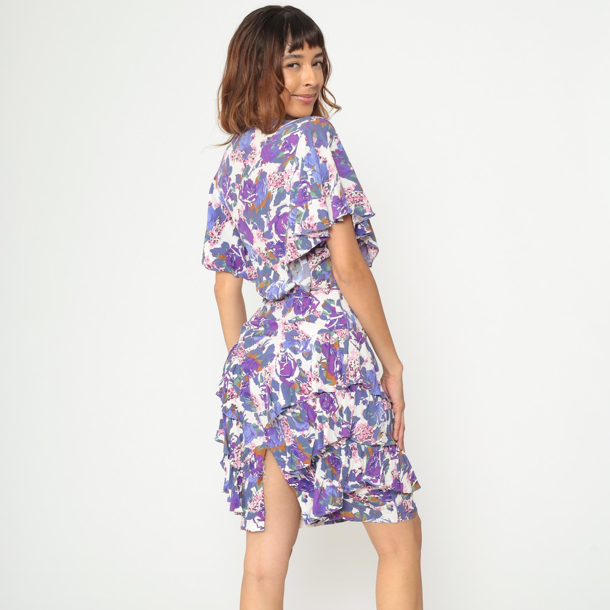 90s floral mini dress from Barbara Barbara in rayon. Purple, pink, blue, and white watercolor-style floral print. V-neckline with button-front bodice. Flutter sleeves. Fitted waist. Tiered ruffle hem. Unlined. Tagged size 4.