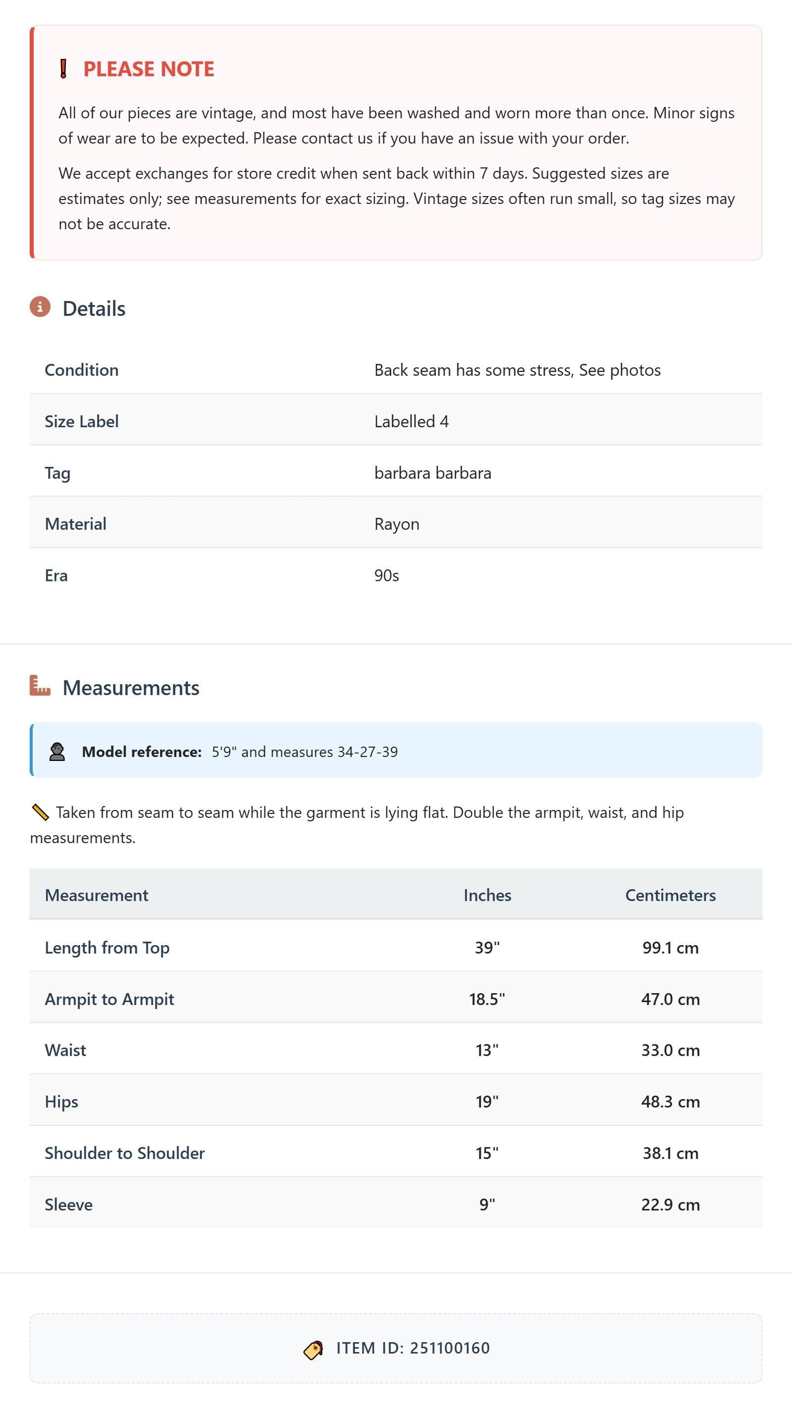 All of our pieces are vintage, and most have been washed and worn more than once. Minor signs of wear are to be expected. Please contact us if you have an issue with your order. We accept exchanges for store credit when sent back within 7 days.