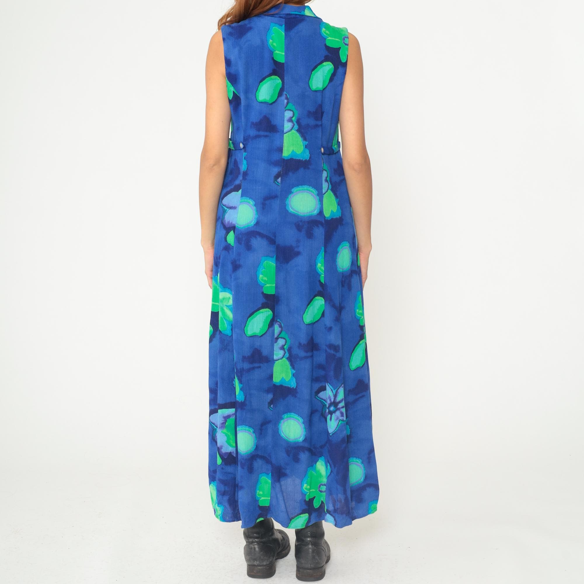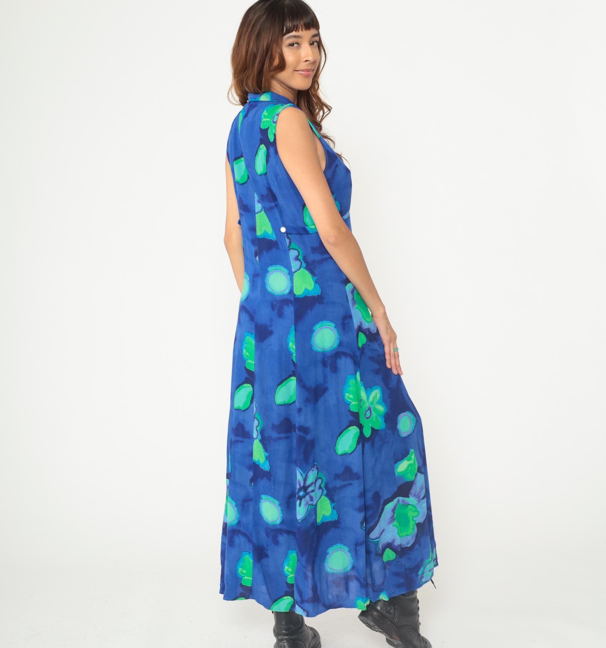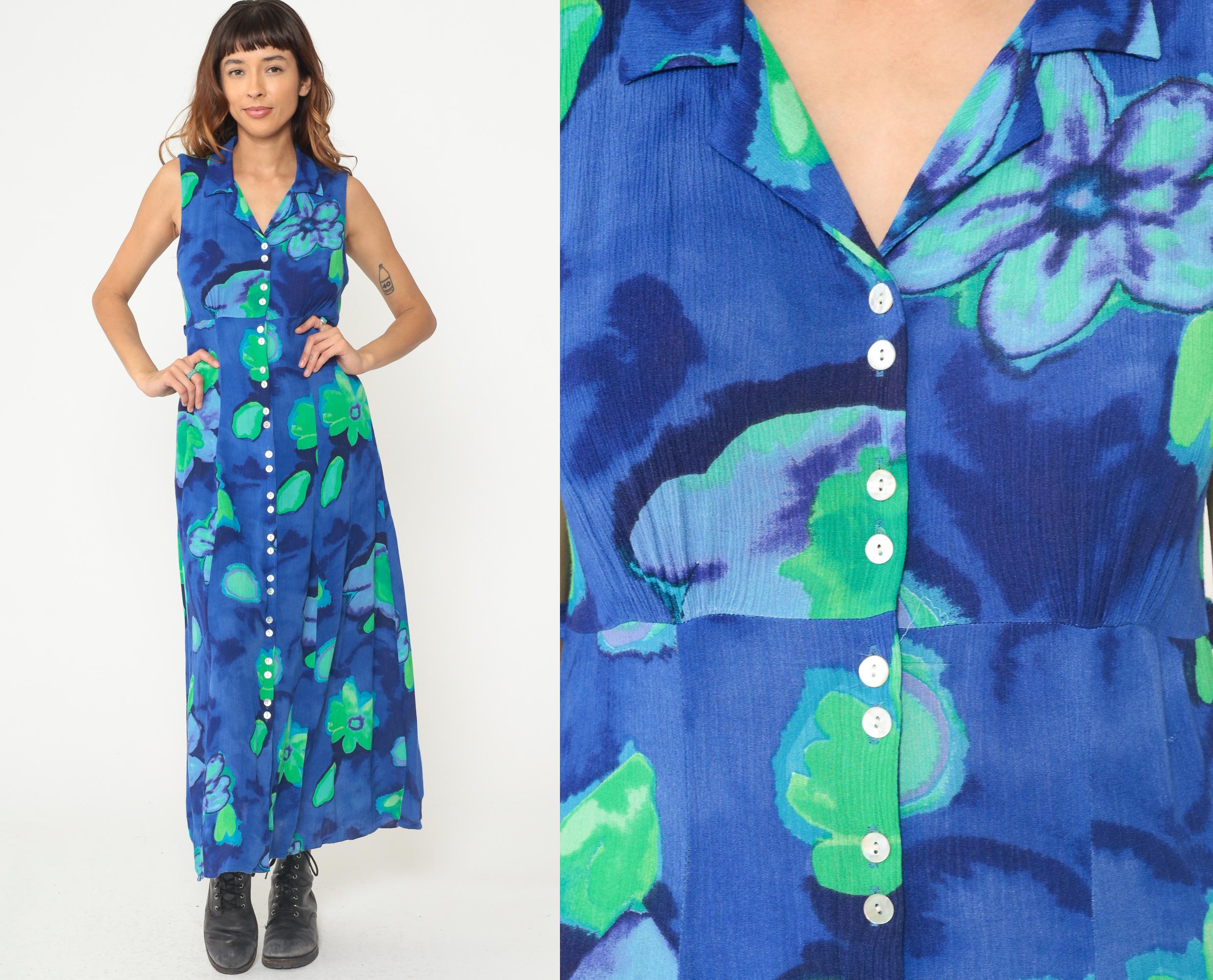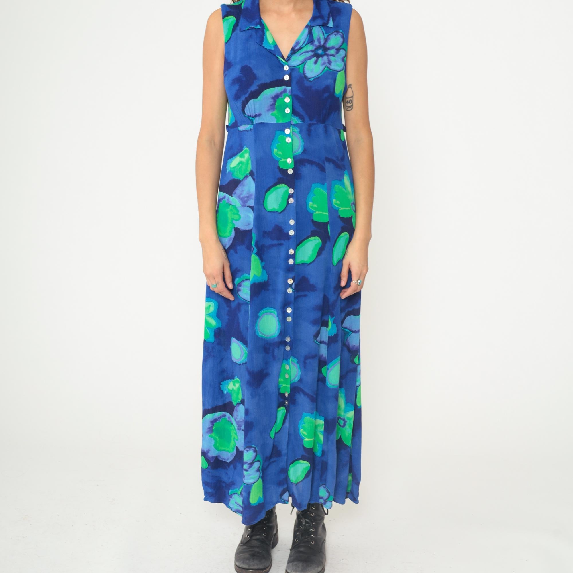 90s blue and green floral maxi dress in rayon. Abstract watercolor-style floral print. Collared neckline with V-neck button-front bodice. Sleeveless. Empire waist. Full-length A-line skirt. Unlined. Tagged size 8.