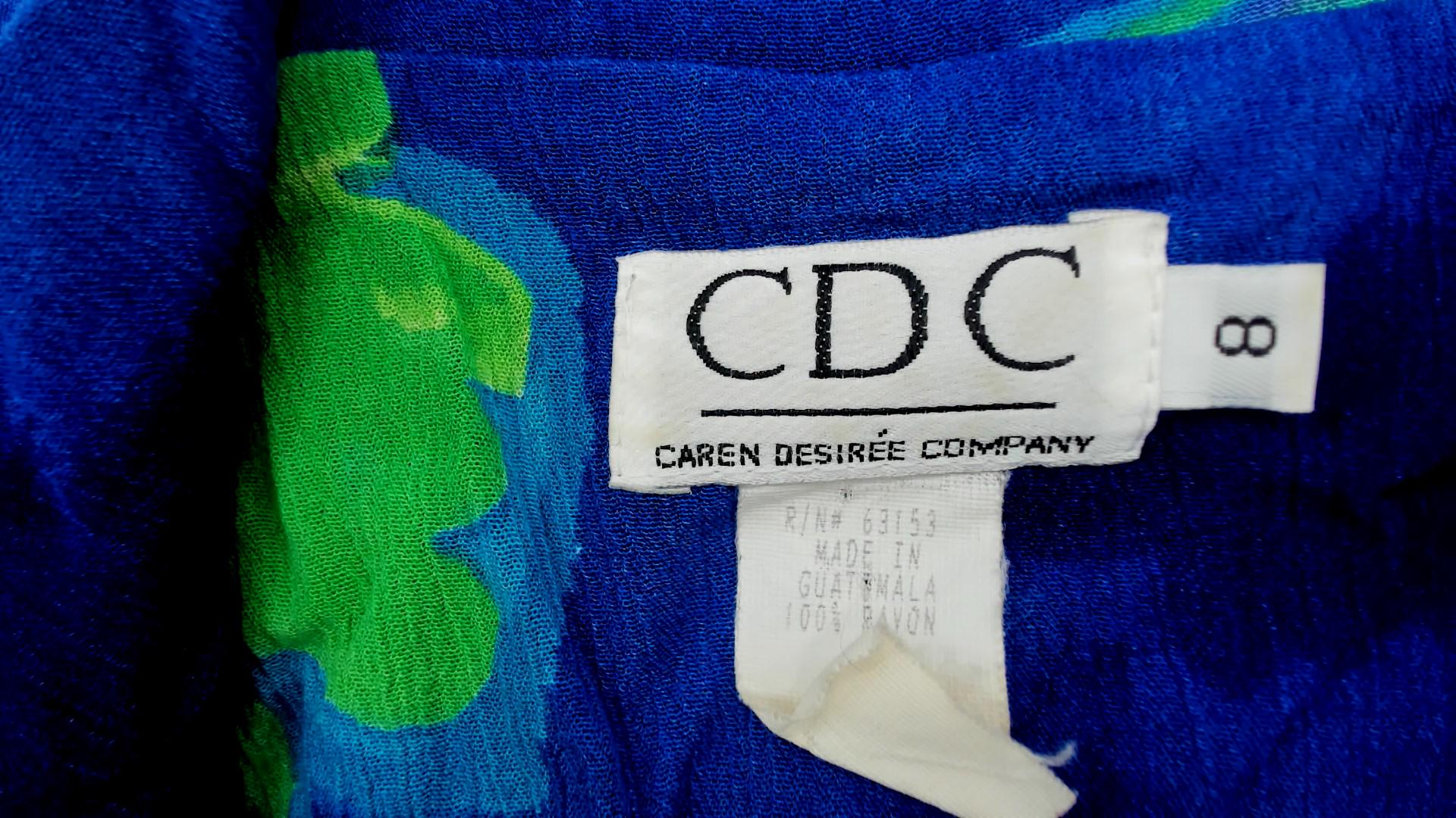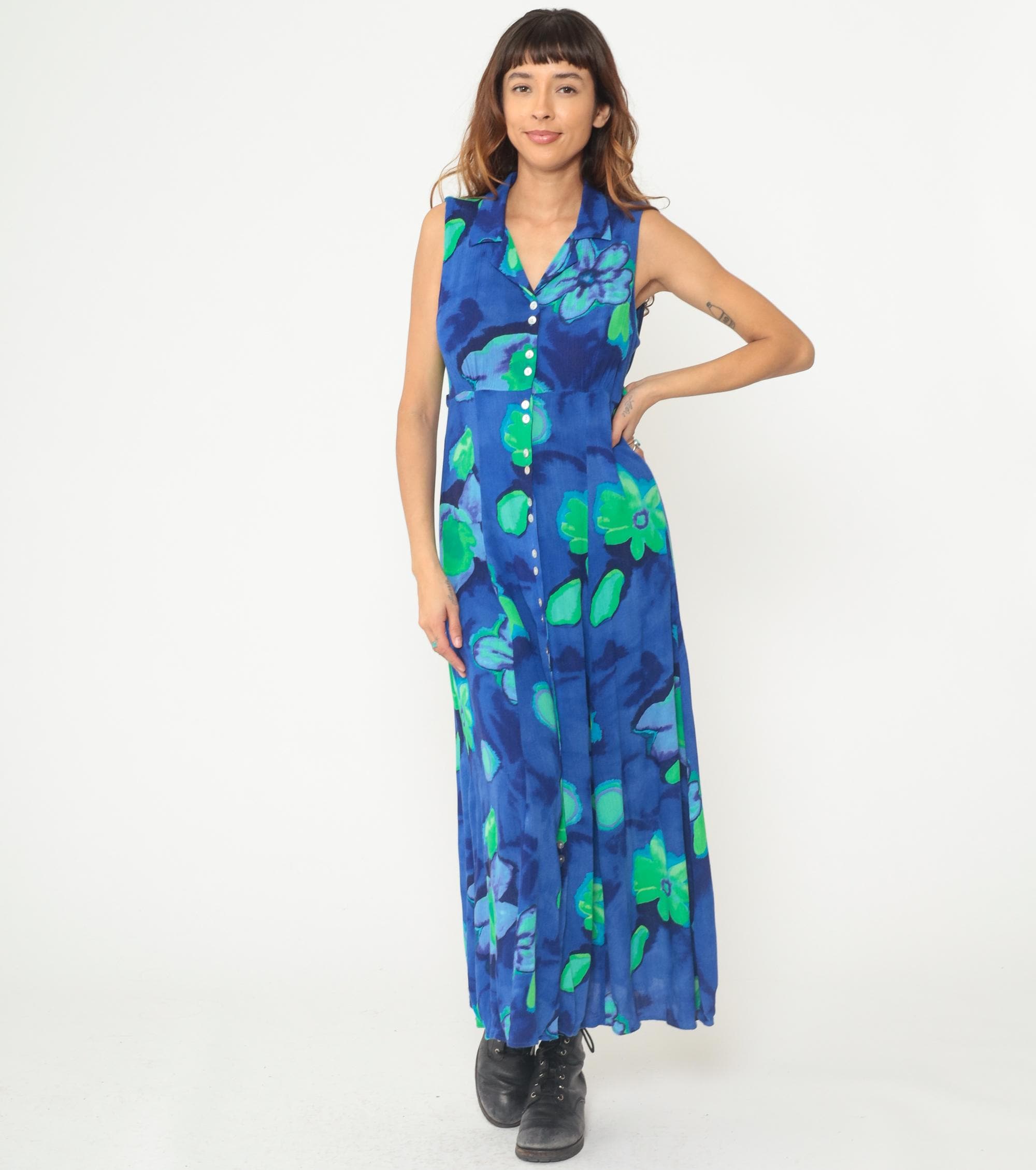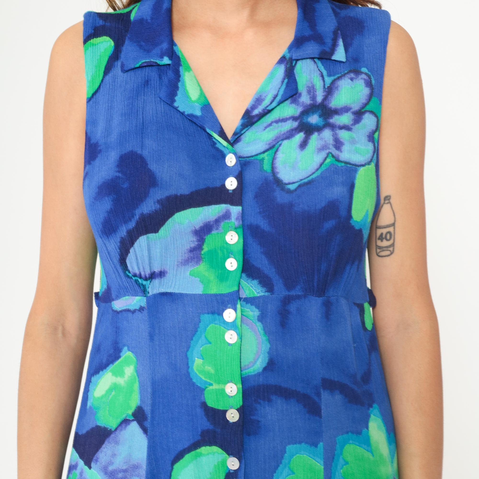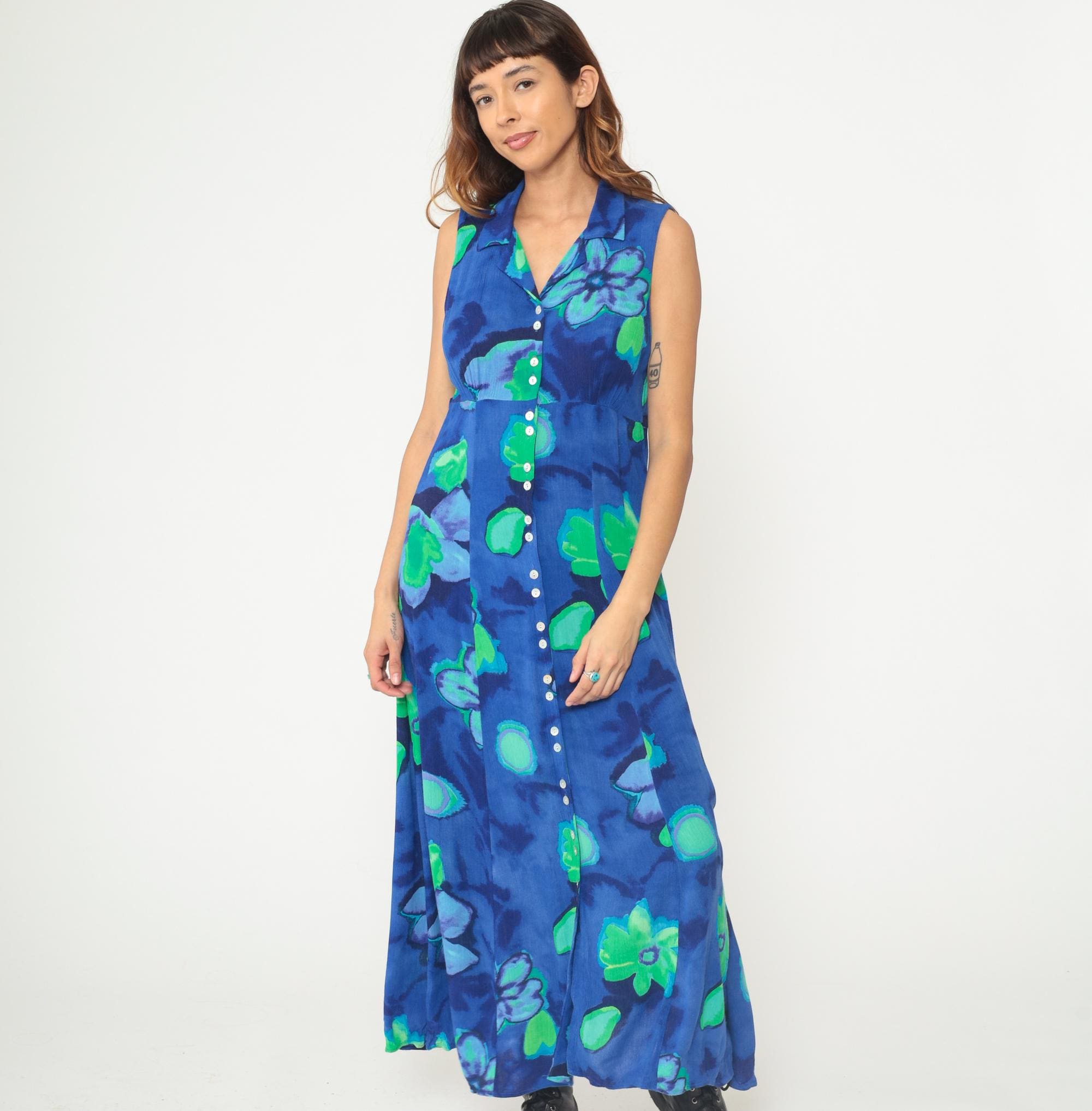 90s blue and green floral maxi dress in rayon. Abstract watercolor-style floral print. Collared neckline with V-neck button-front bodice. Sleeveless. Empire waist. Full-length A-line skirt. Unlined. Tagged size 8.