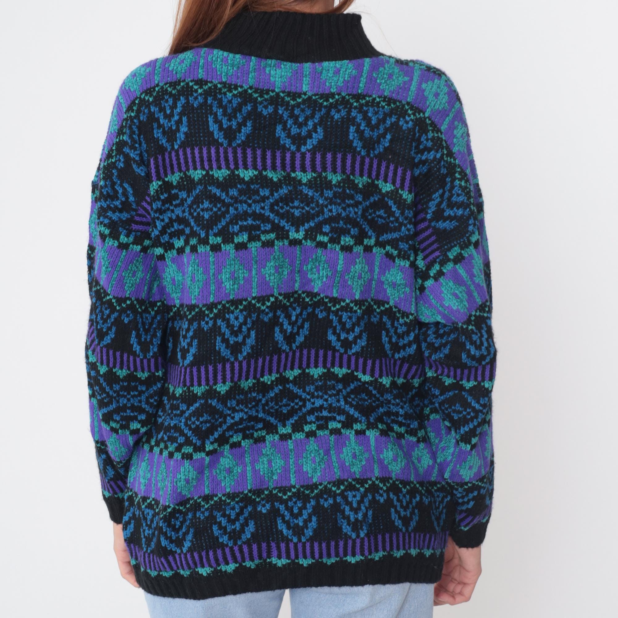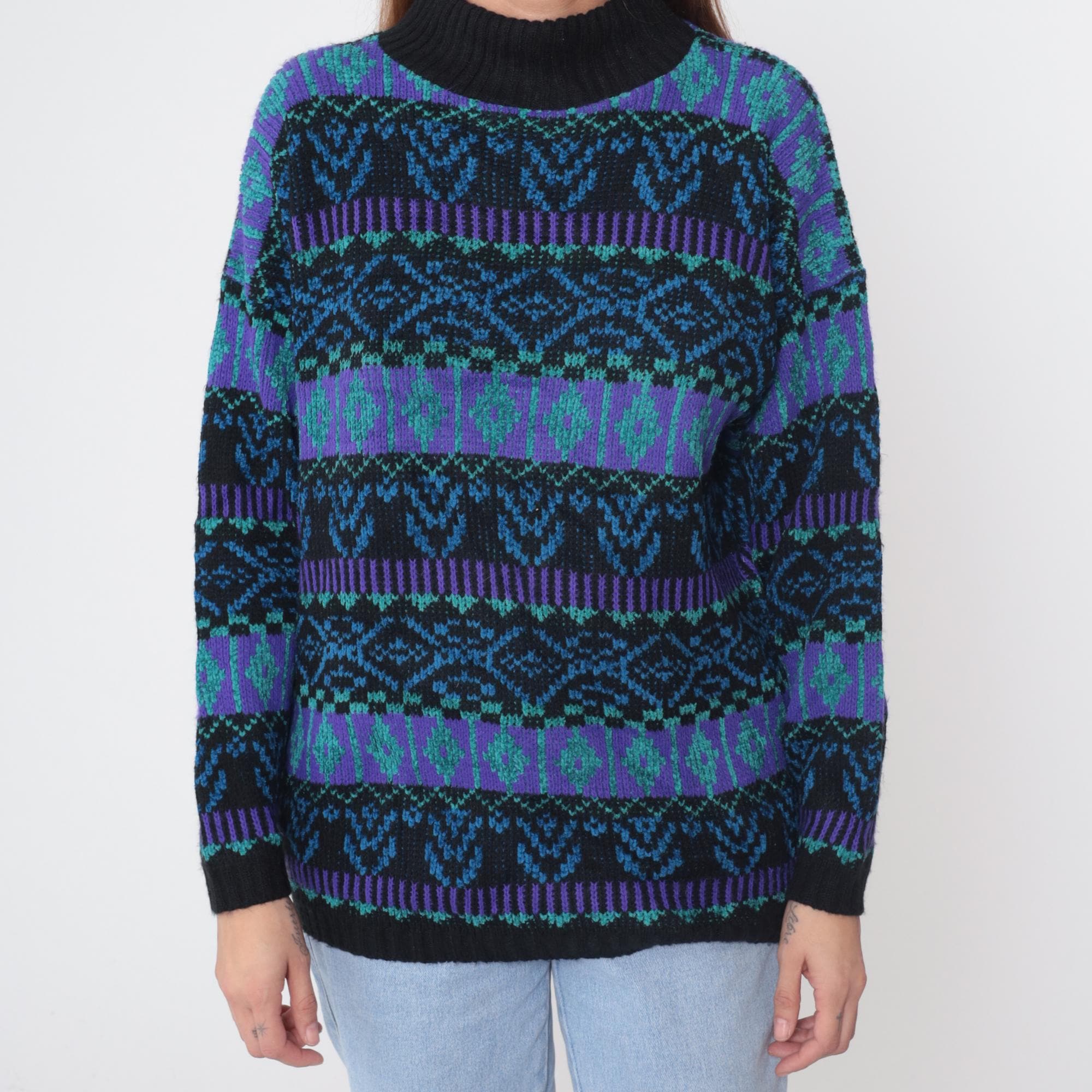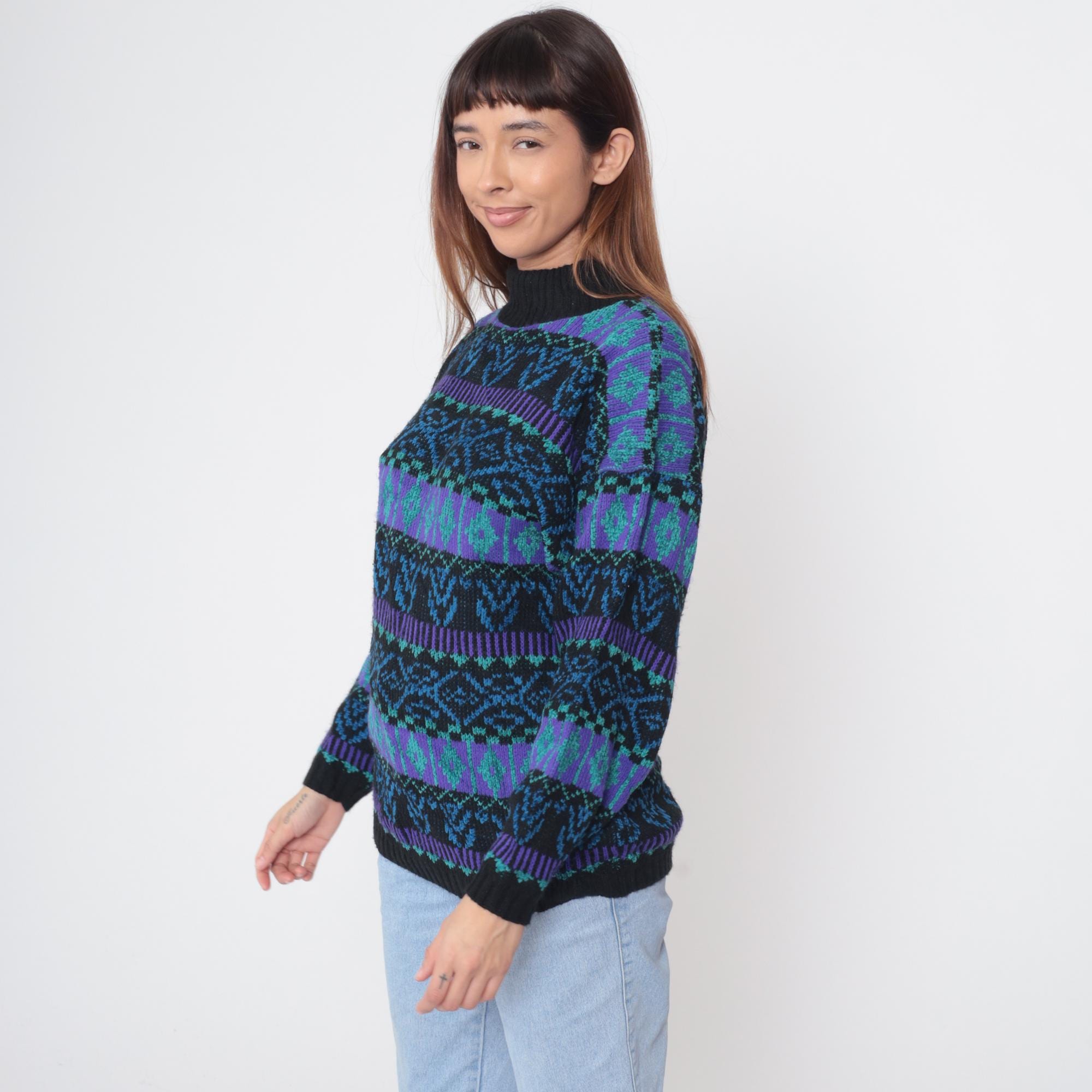 90s fair isle sweater by In Resource. Mock neck design with geometric Nordic pattern in purple, teal, blue, and black. Long sleeves with ribbed cuffs and hem. Traditional fair isle knit pattern repeats across the body in horizontal bands.