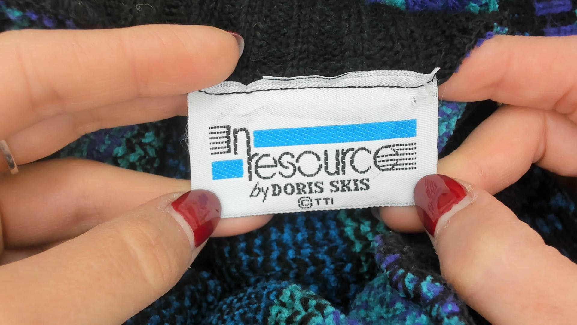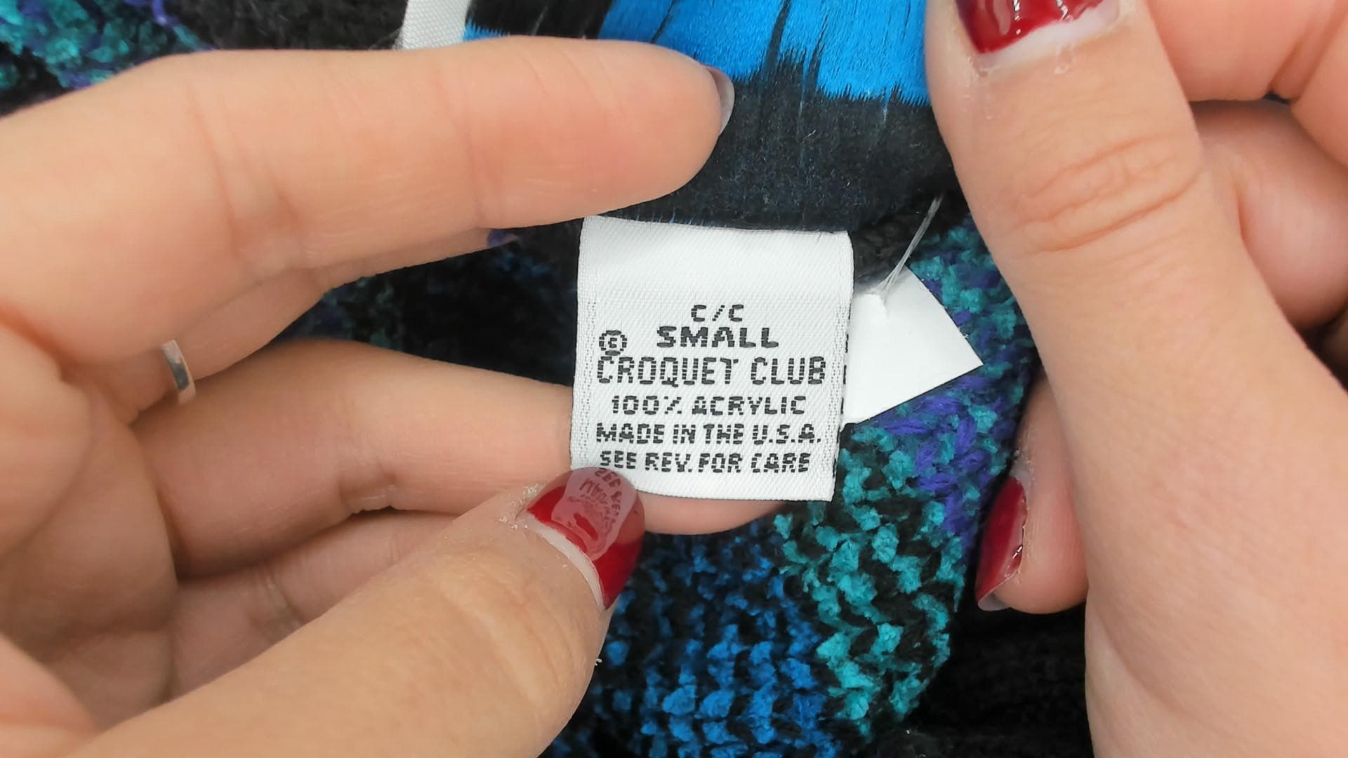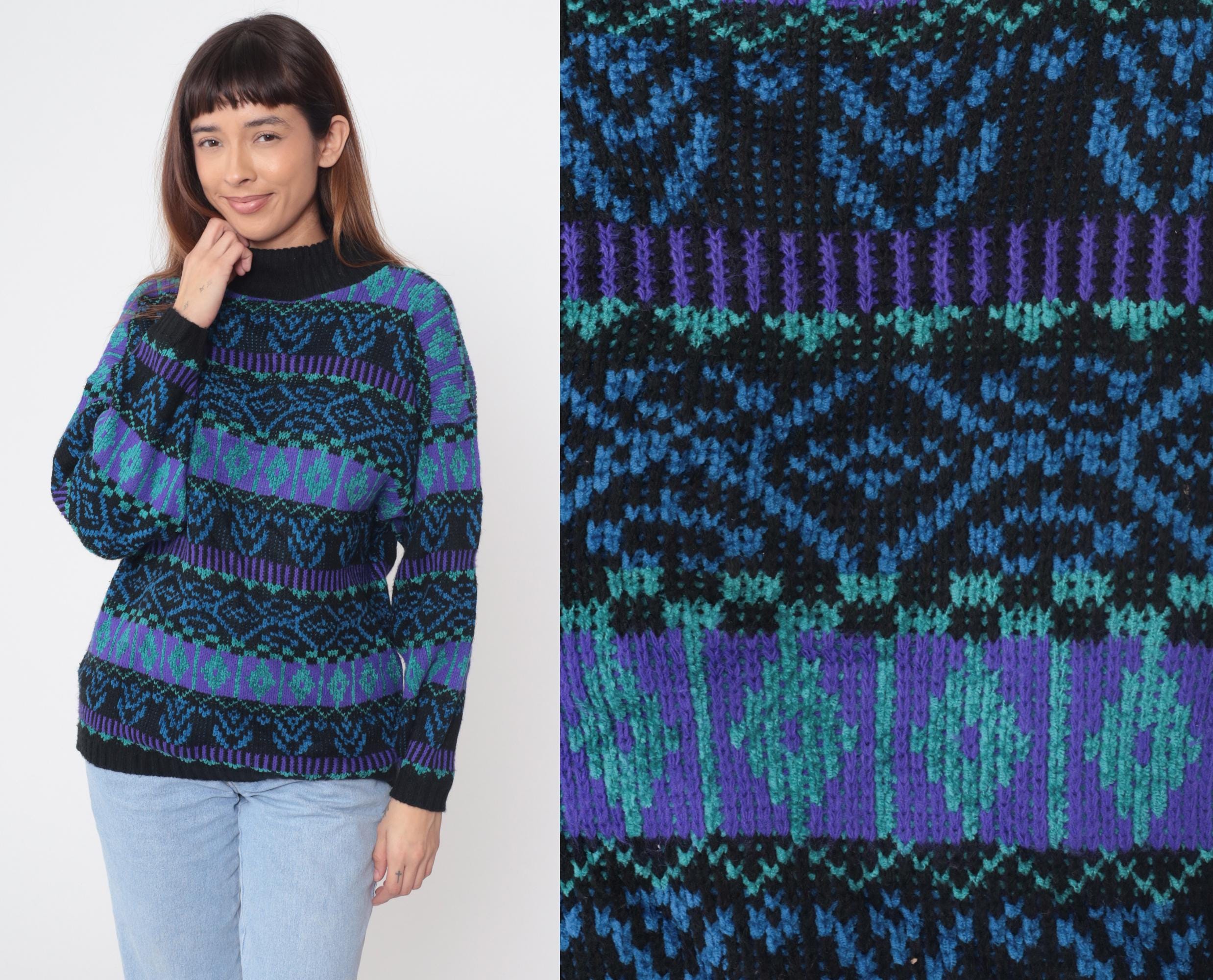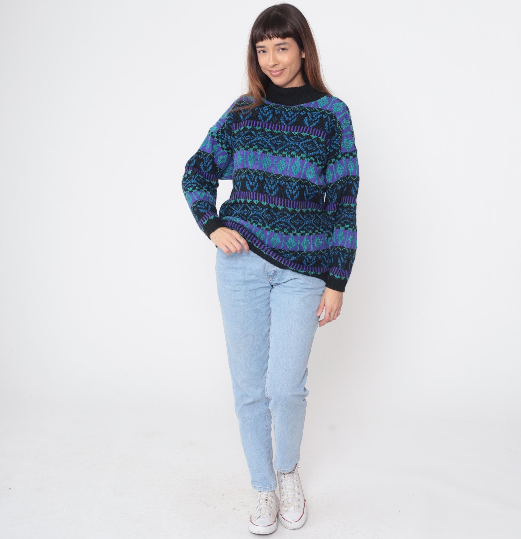 90s fair isle sweater by In Resource. Mock neck design with geometric Nordic pattern in purple, teal, blue, and black. Long sleeves with ribbed cuffs and hem. Traditional fair isle knit pattern repeats across the body in horizontal bands.
