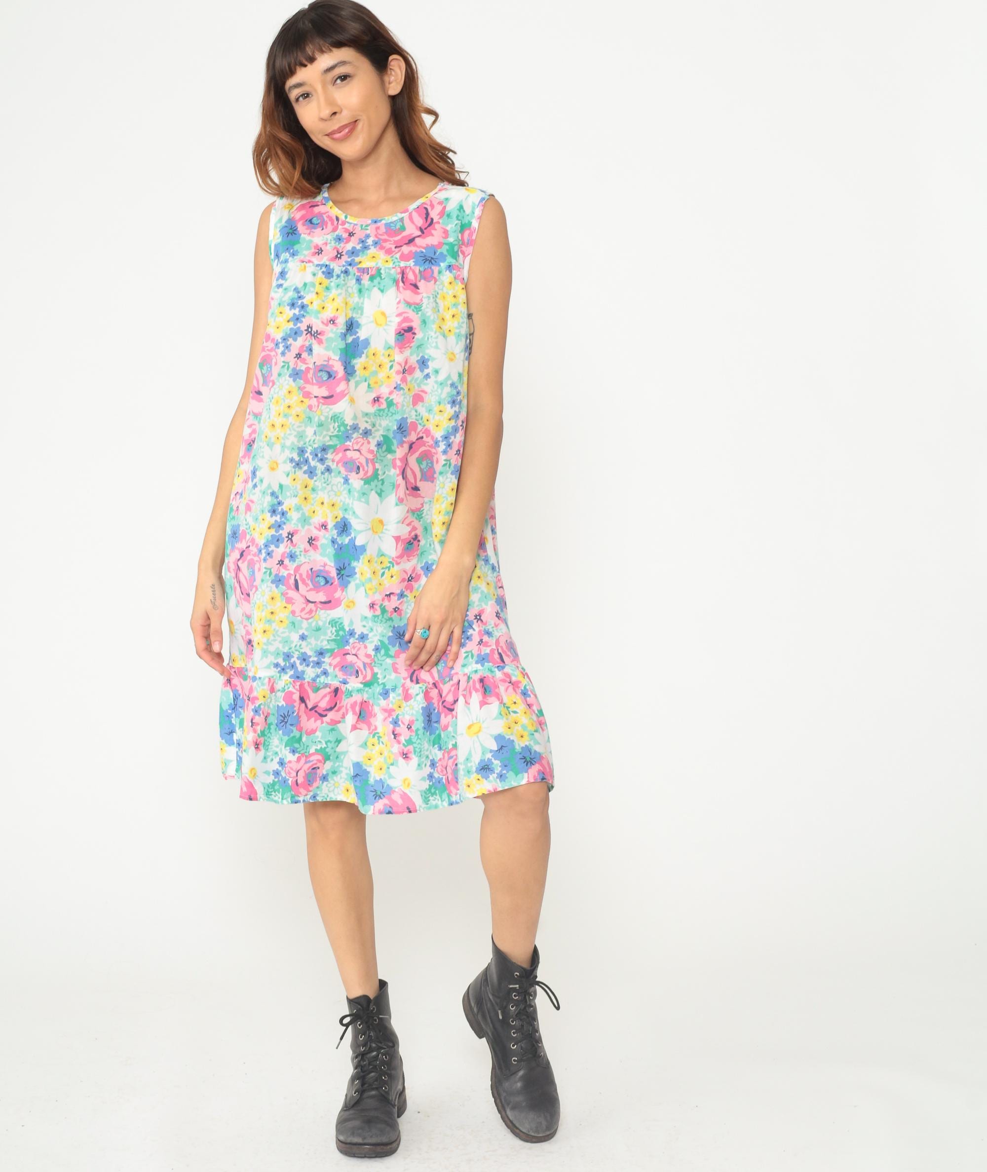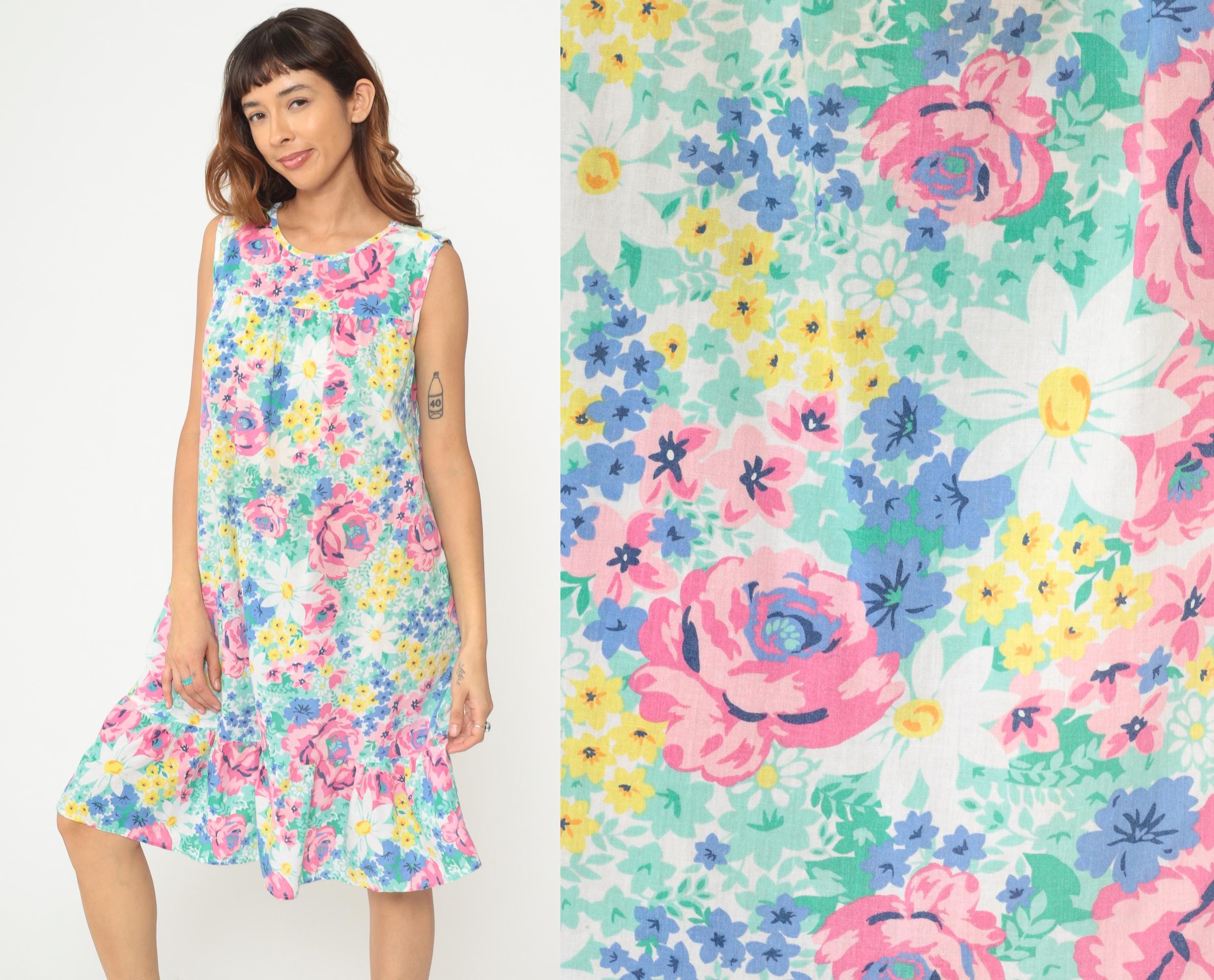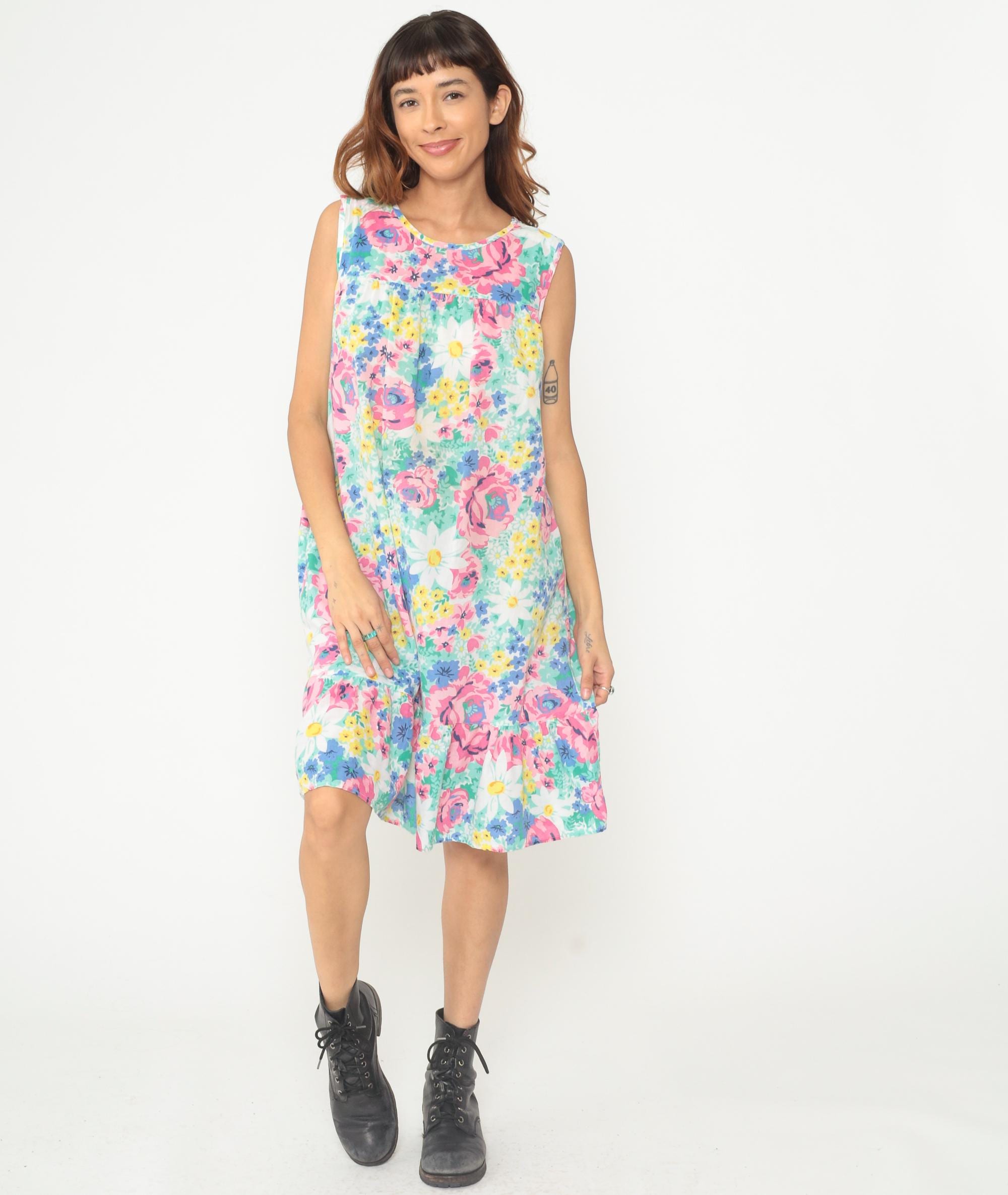 90s floral midi dress from Anthony Richards in cotton. Pink, yellow, blue, turquoise, and white watercolor floral print. Crew neckline. Sleeveless. Drop waist.