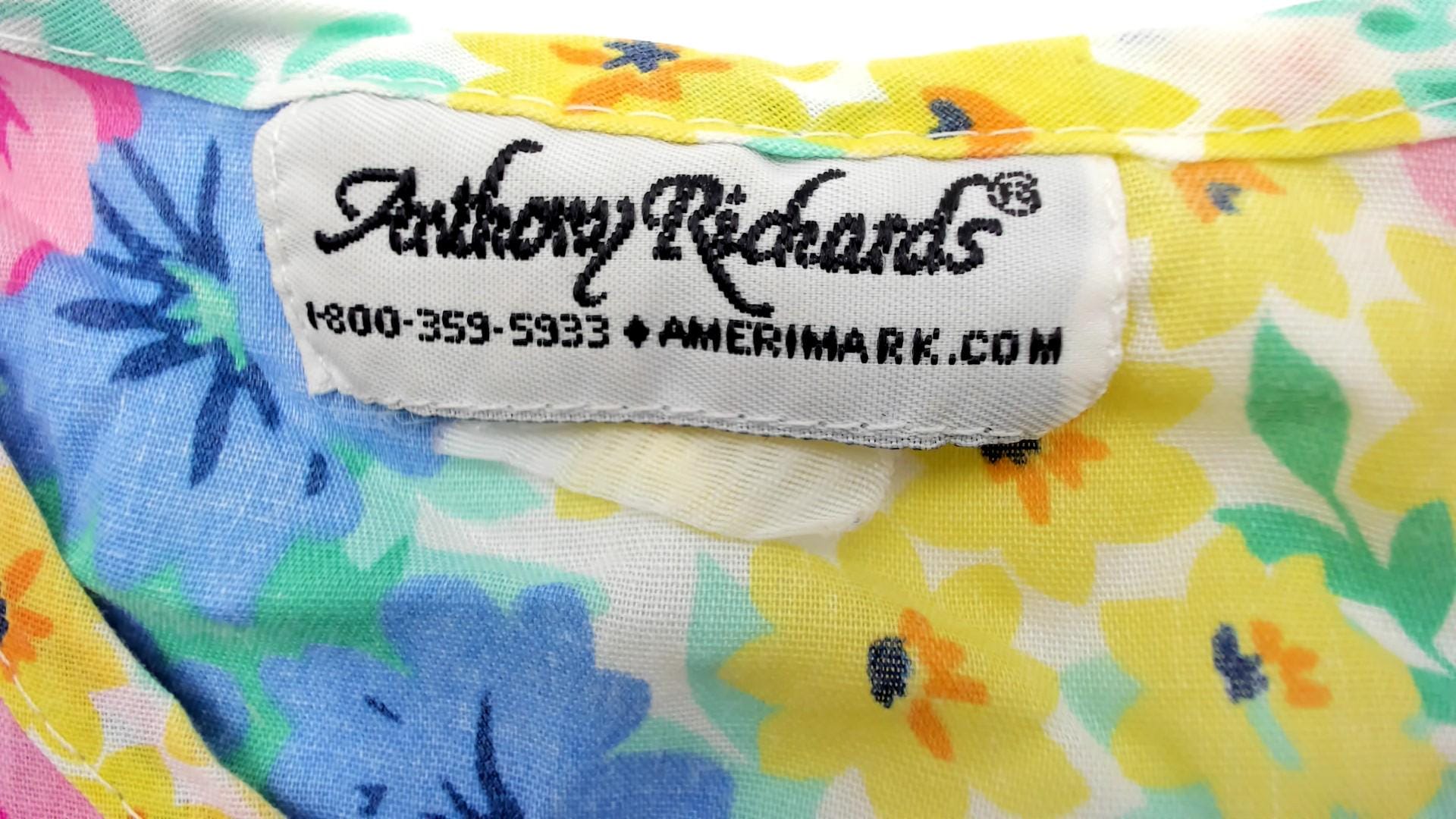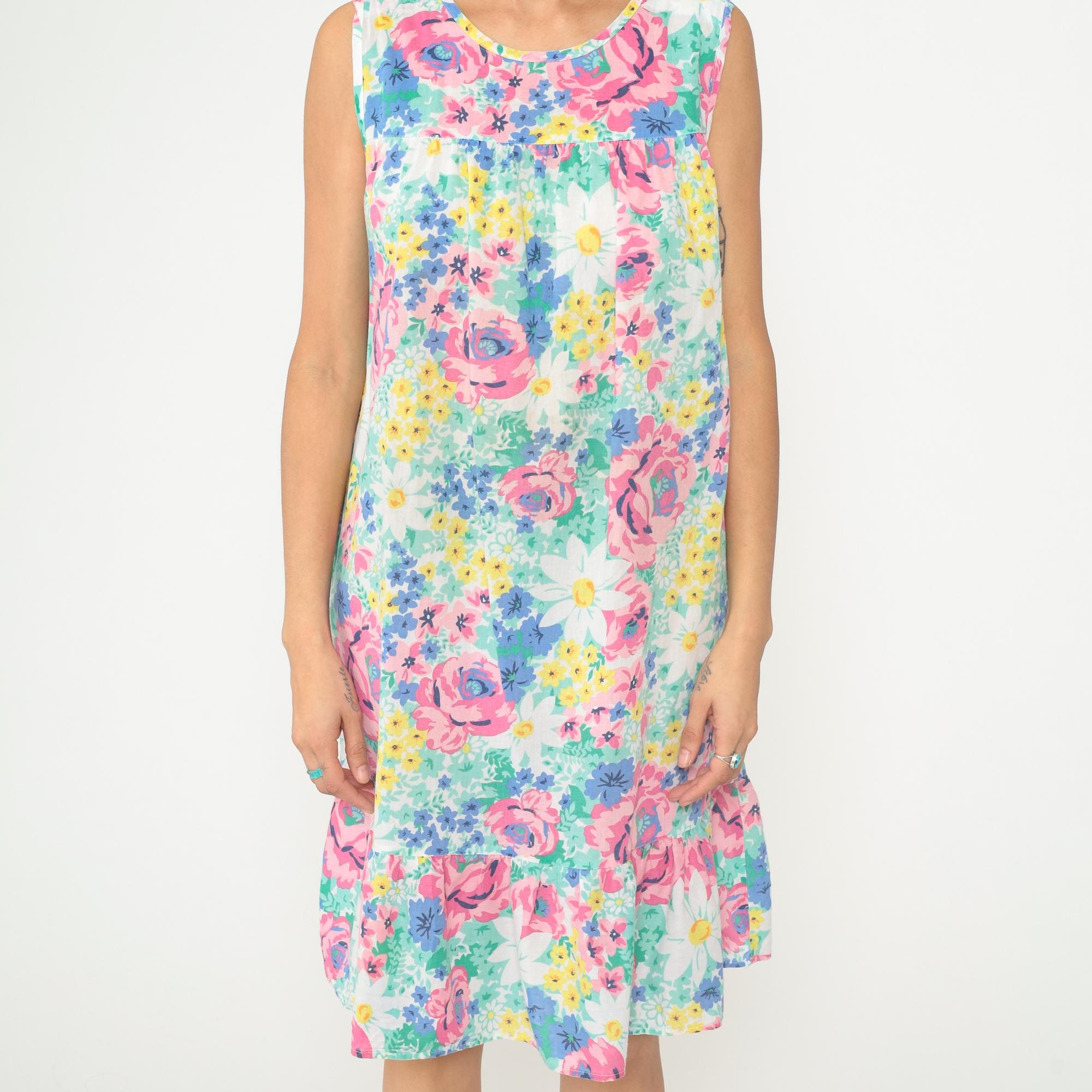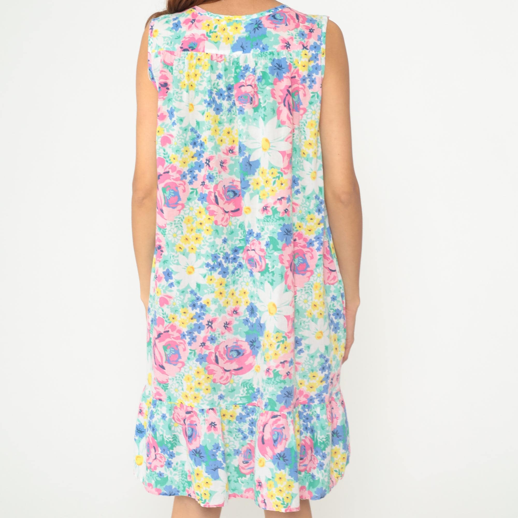 90s floral midi dress from Anthony Richards in cotton. Pink, yellow, blue, turquoise, and white watercolor floral print. Crew neckline. Sleeveless. Drop waist.