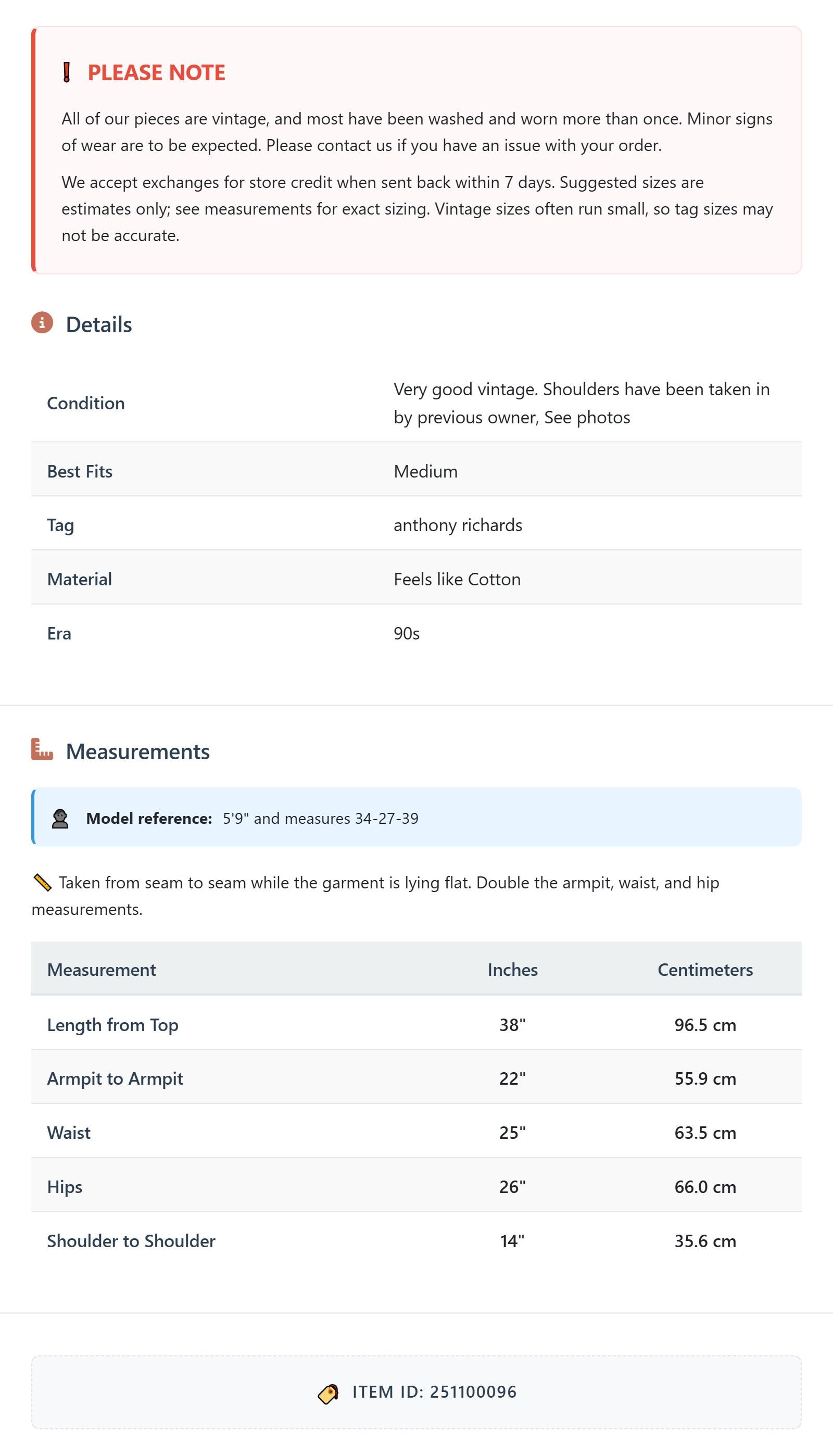 Suggested sizes are estimates only; see measurements for exact sizing. Vintage sizes often run small, so tag sizes may not be accurate.