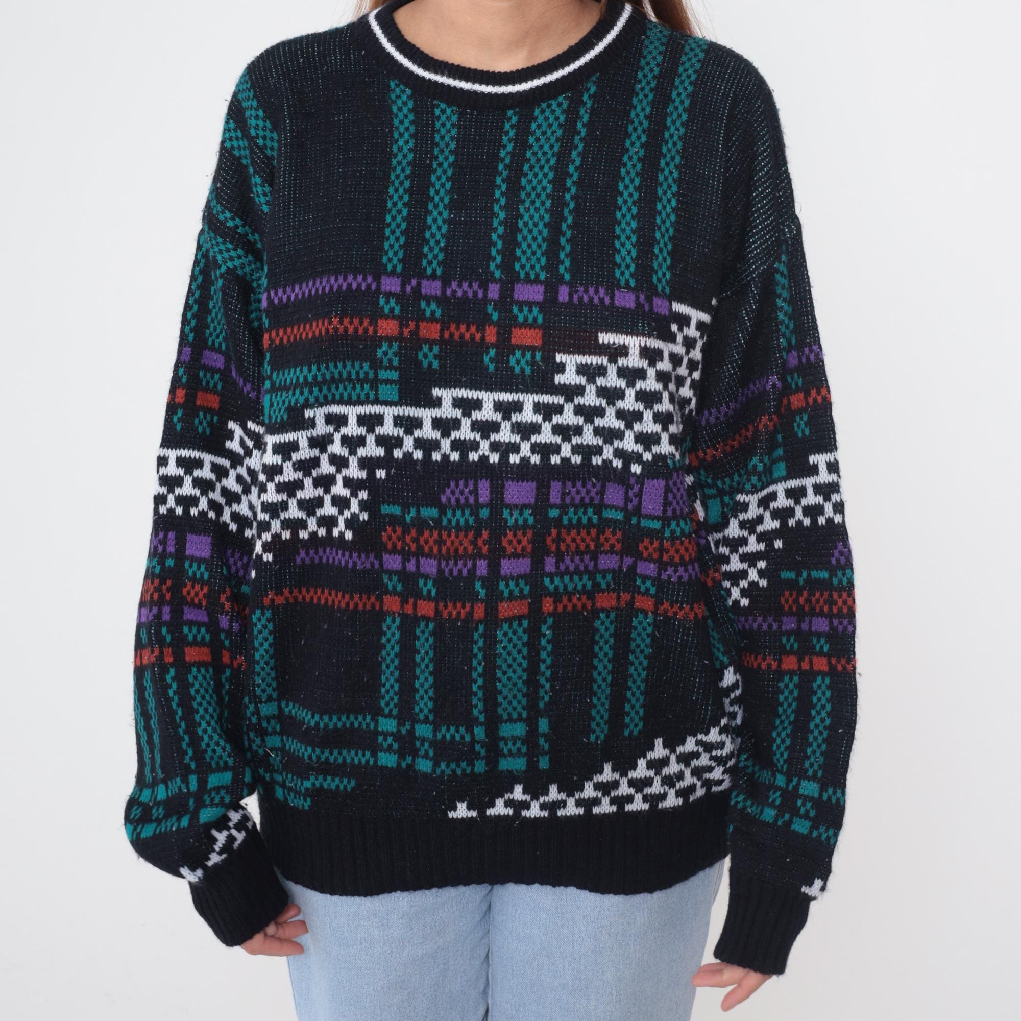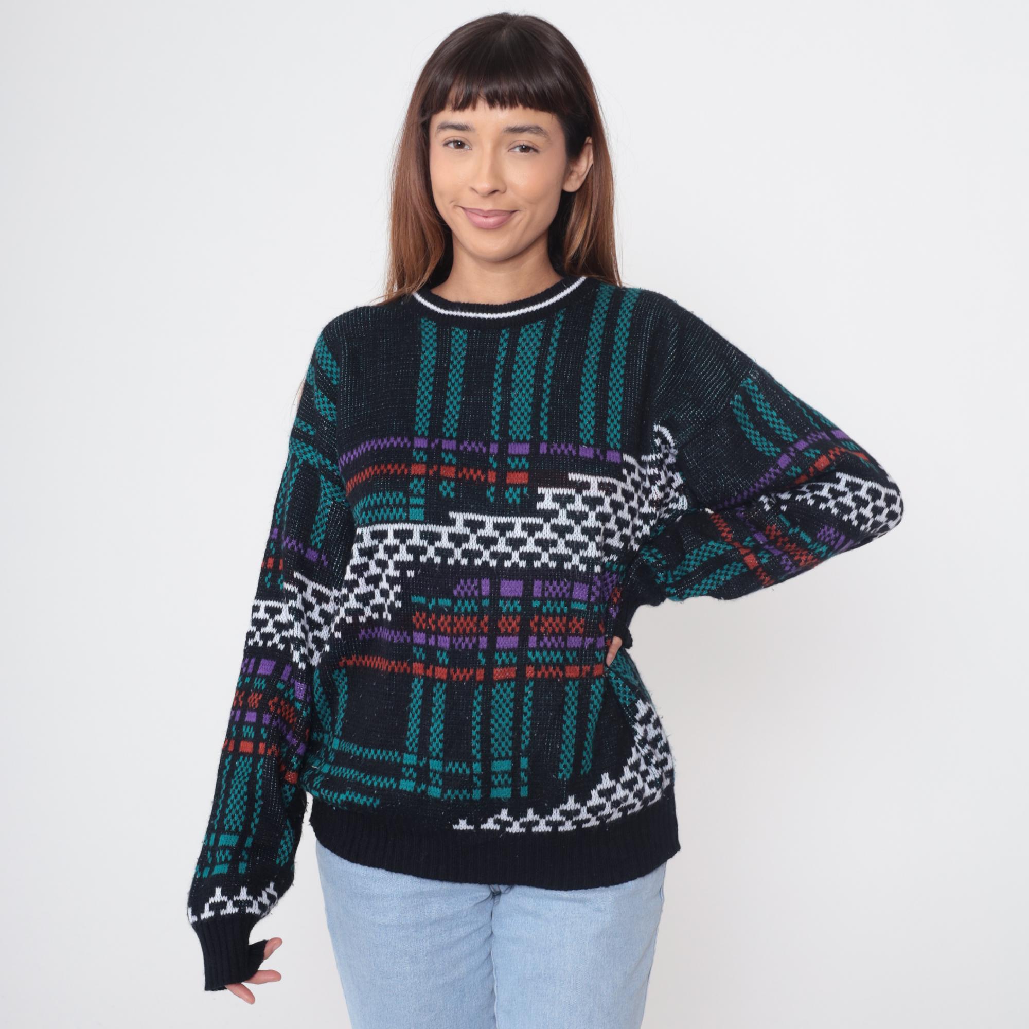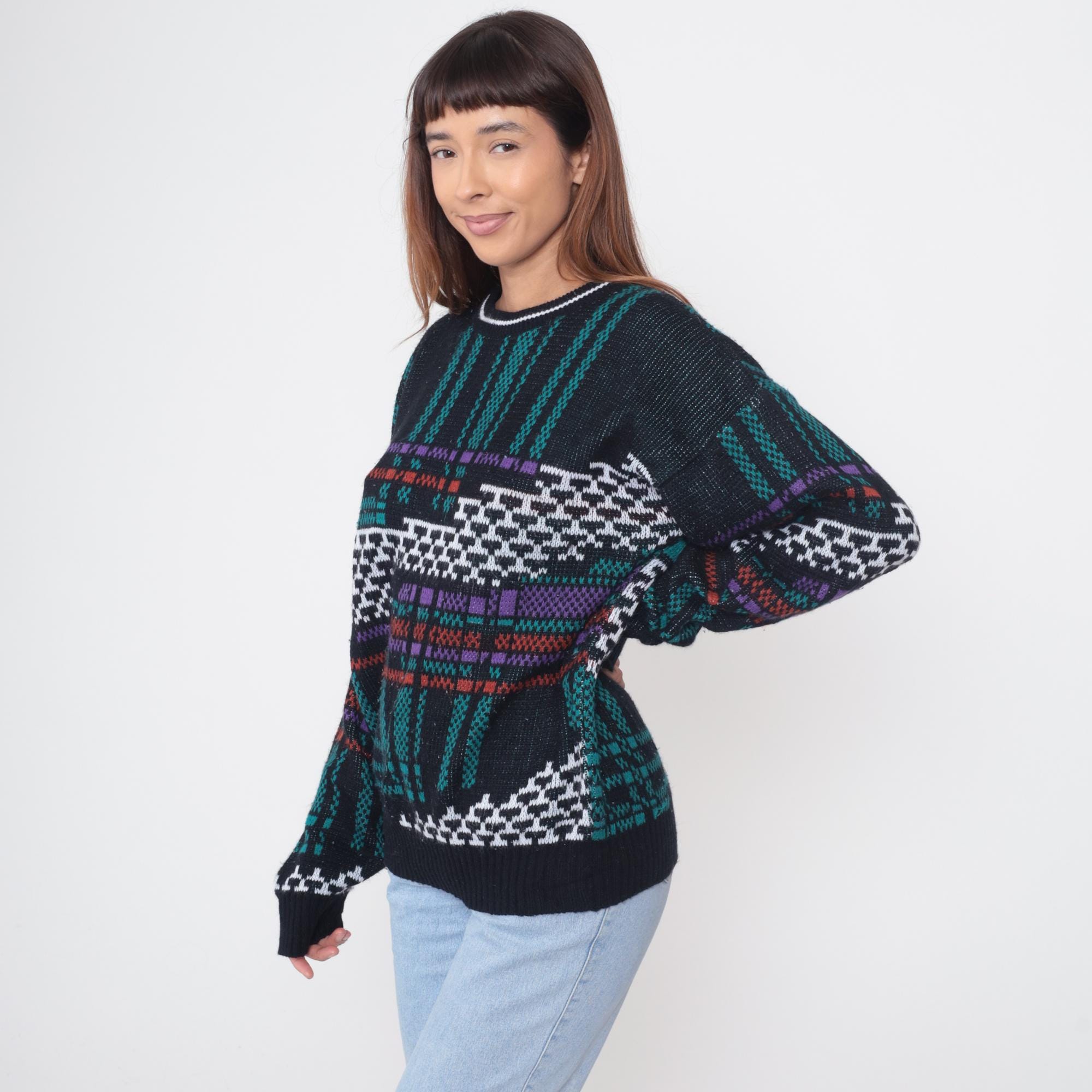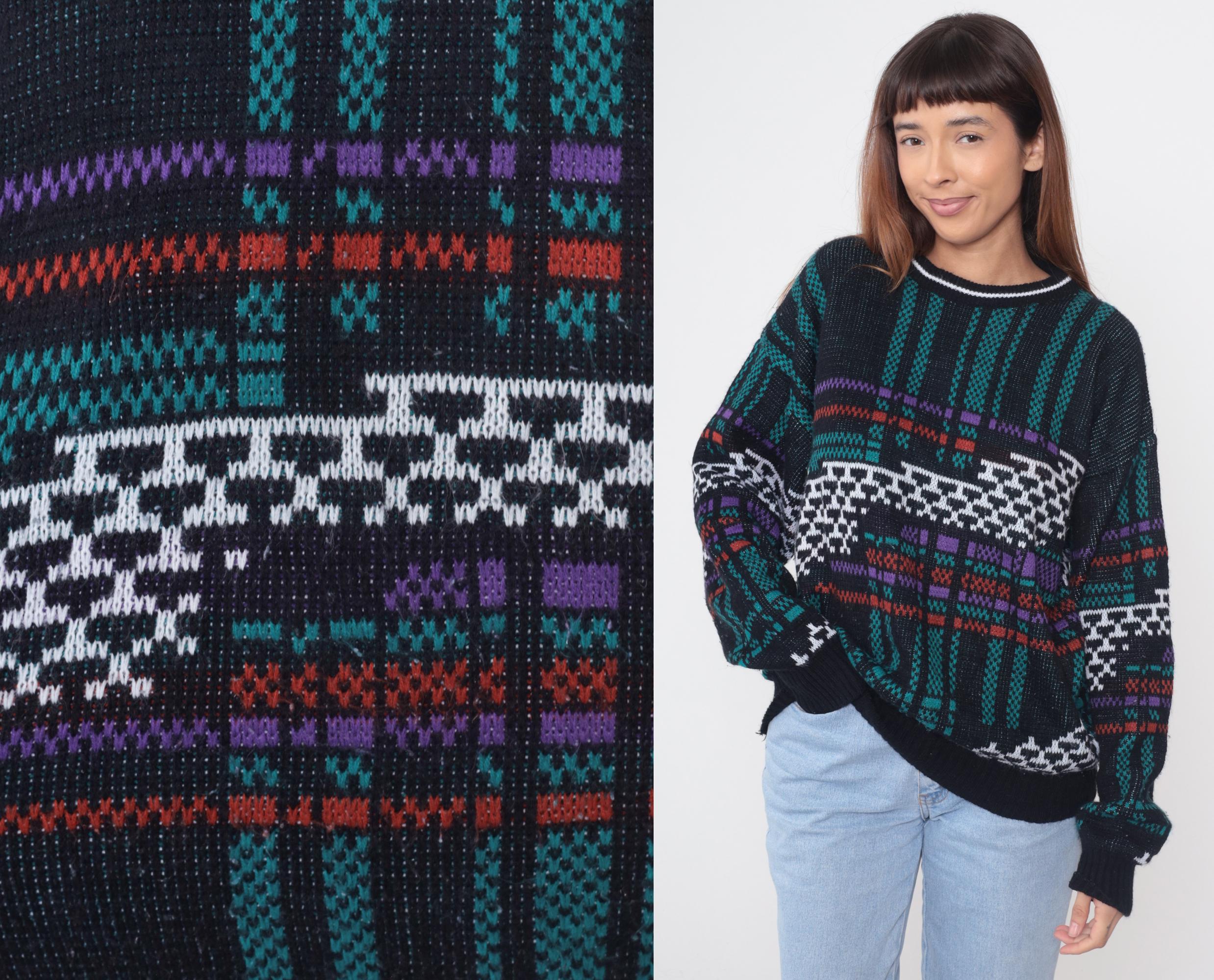 80s crew neck sweater by Weeds. Bold tribal geometric pattern in black, teal, purple, red, and white. Tagged Extra Large. Long sleeves with ribbed cuffs, collar, and hem. Complex southwestern-inspired geometric design with multiple pattern blocks throughout.