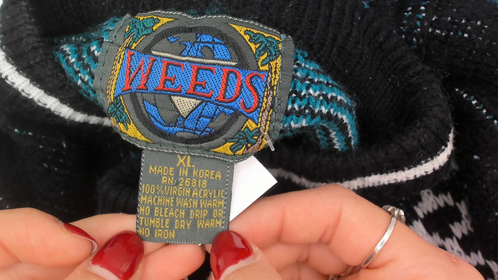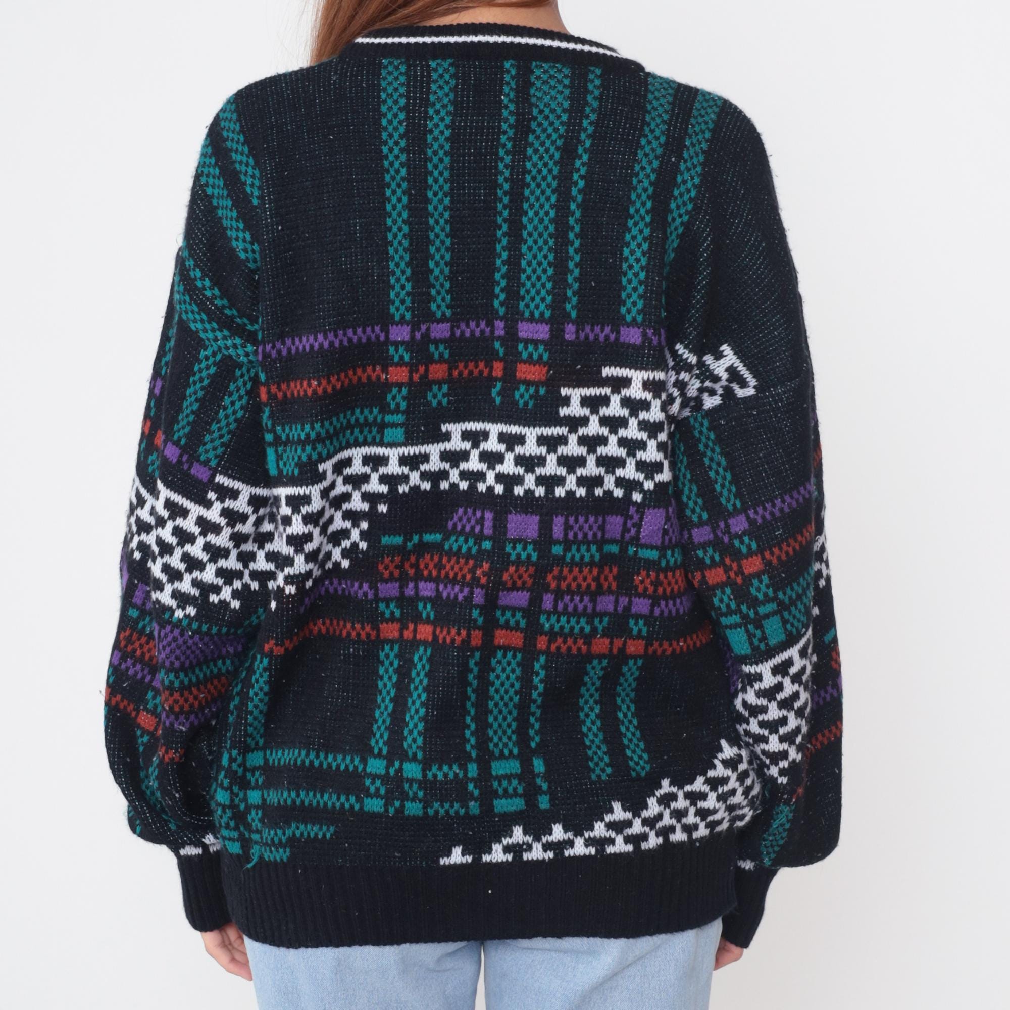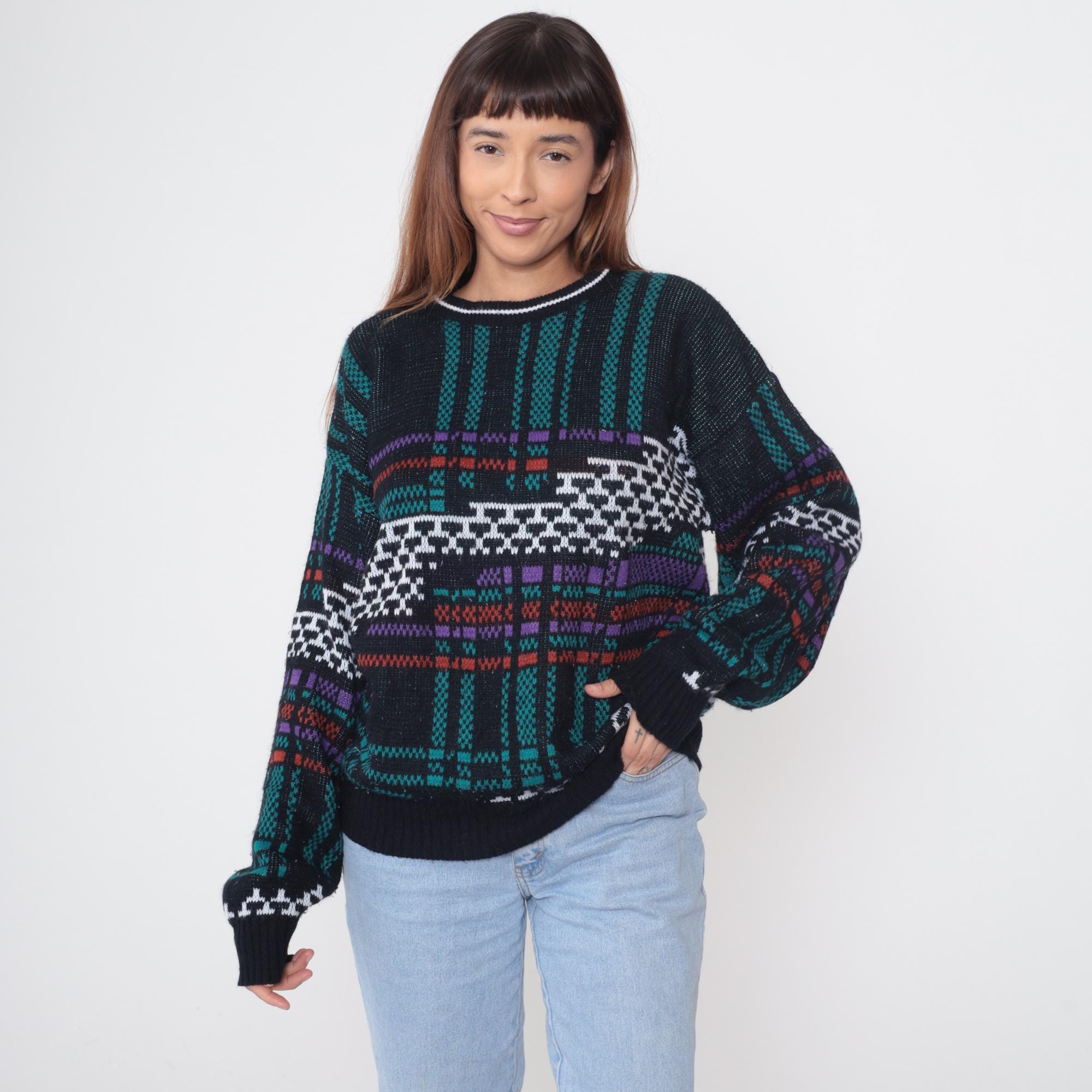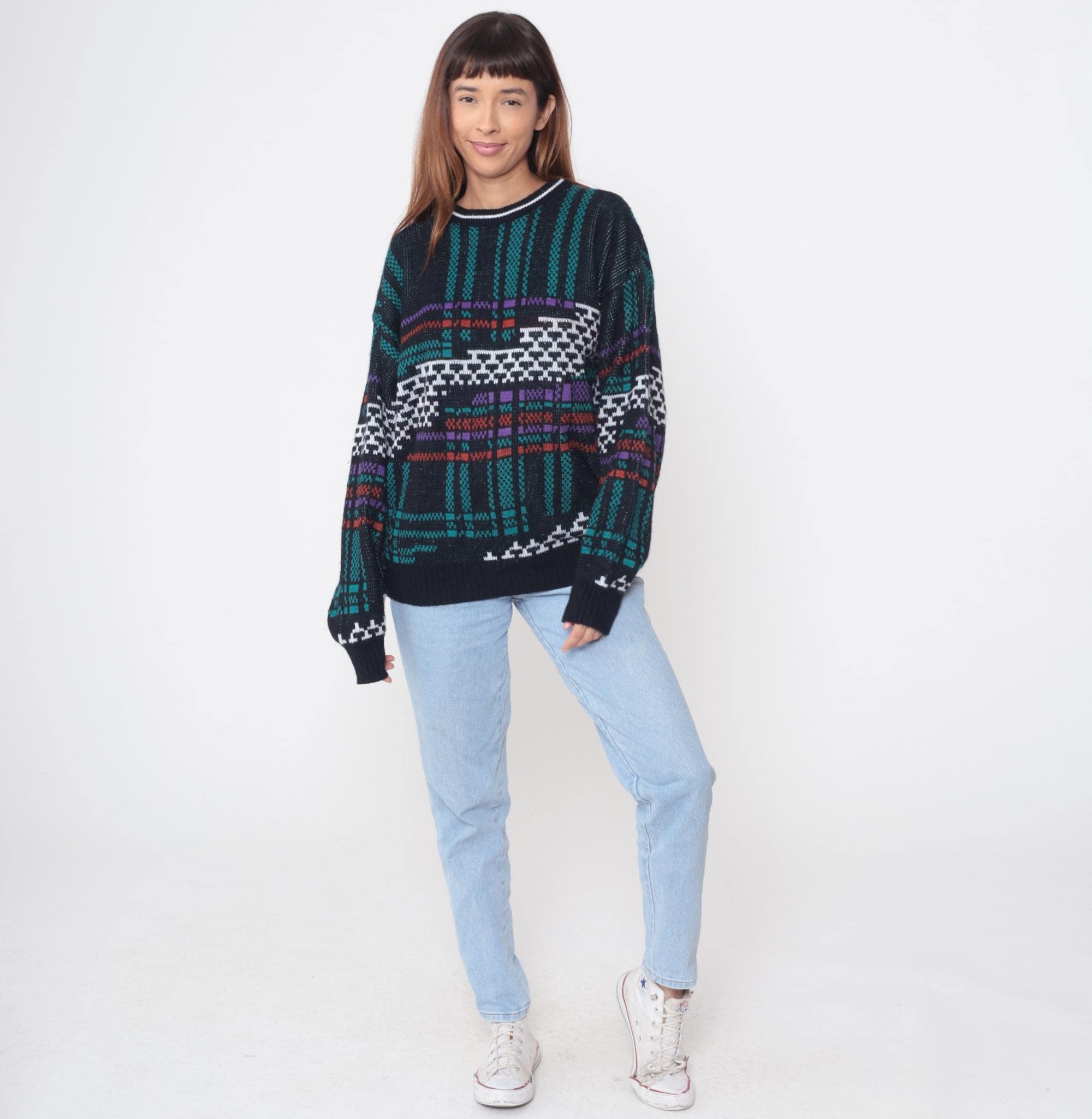 80s crew neck sweater by Weeds. Bold tribal geometric pattern in black, teal, purple, red, and white. Tagged Extra Large. Long sleeves with ribbed cuffs, collar, and hem. Complex southwestern-inspired geometric design with multiple pattern blocks throughout.