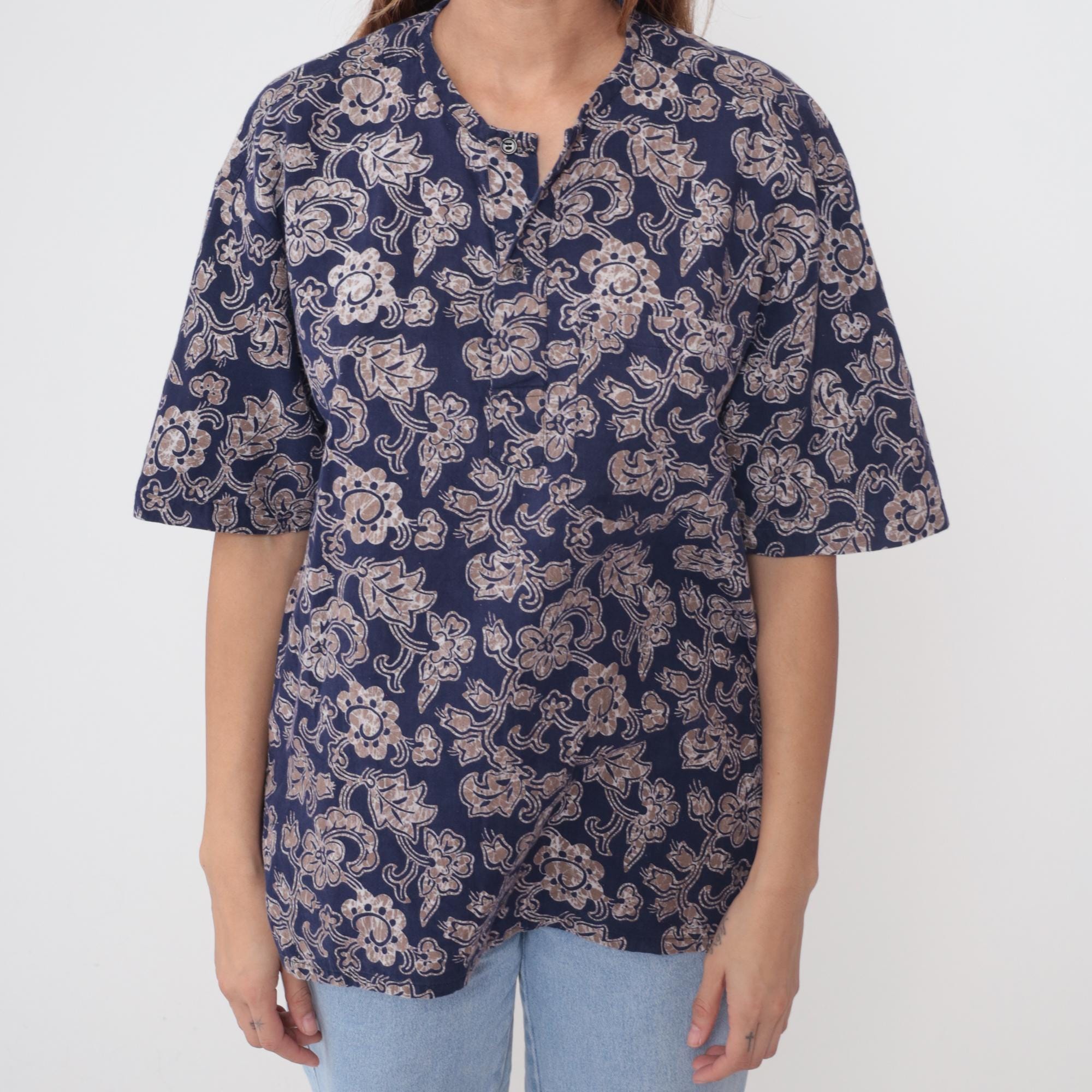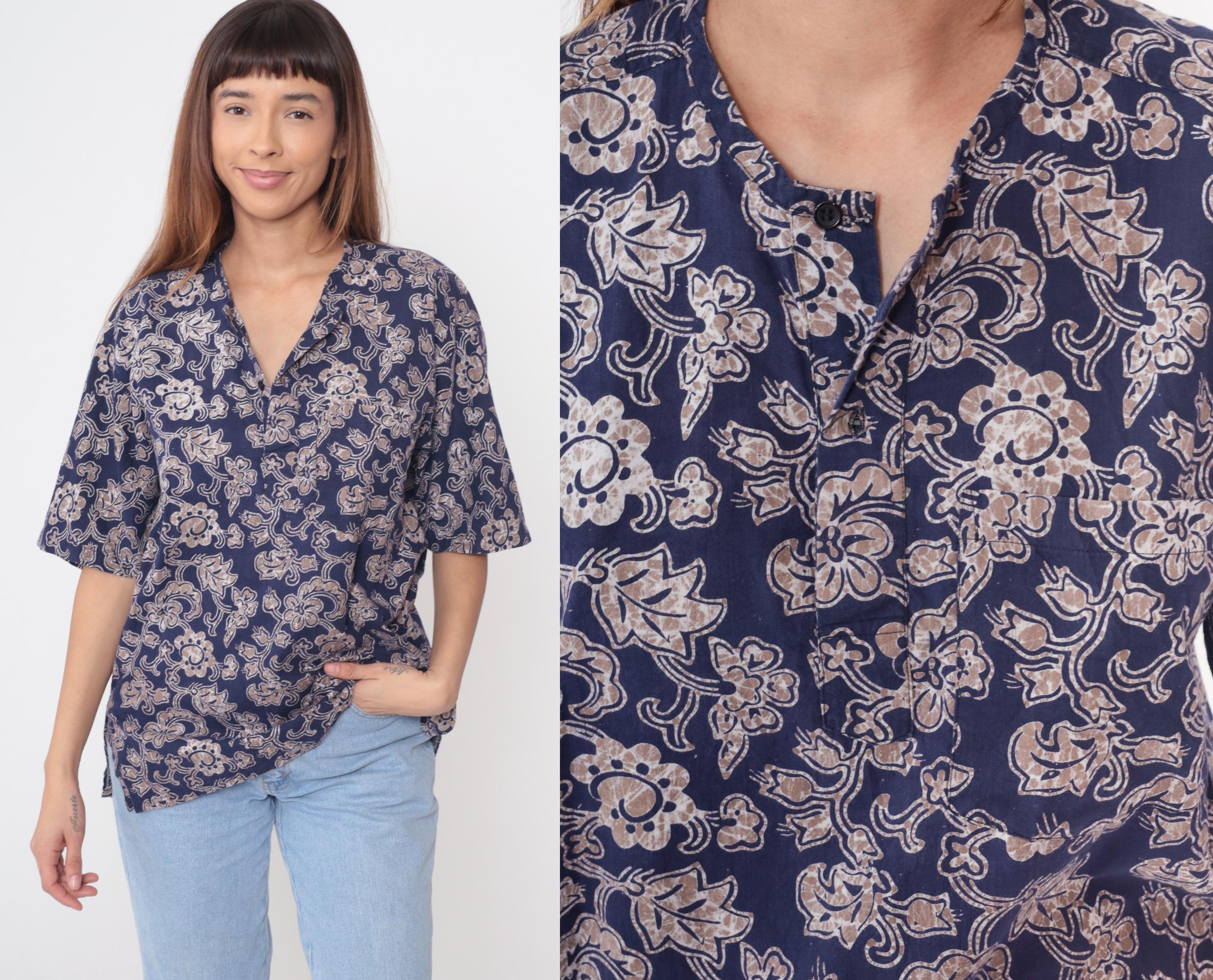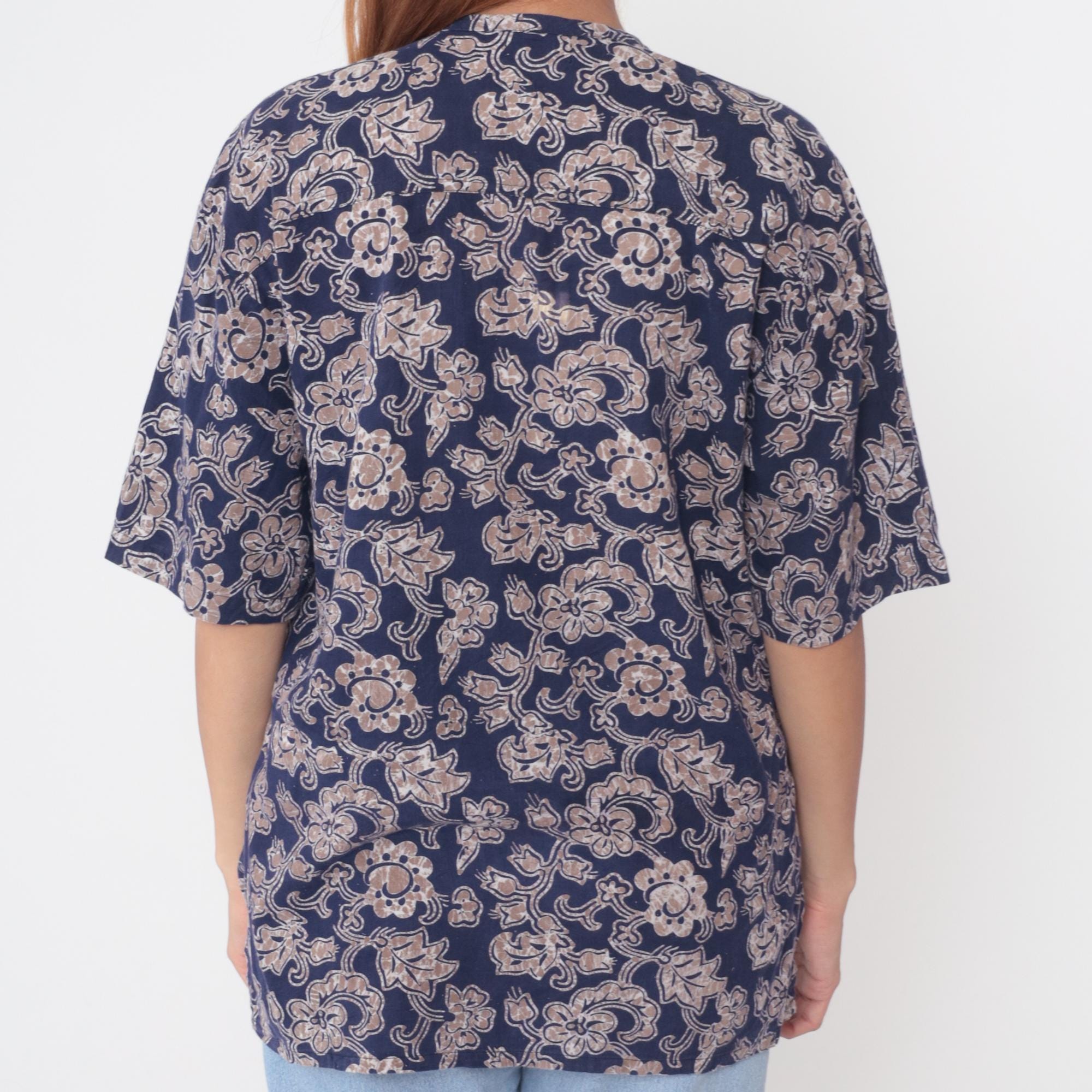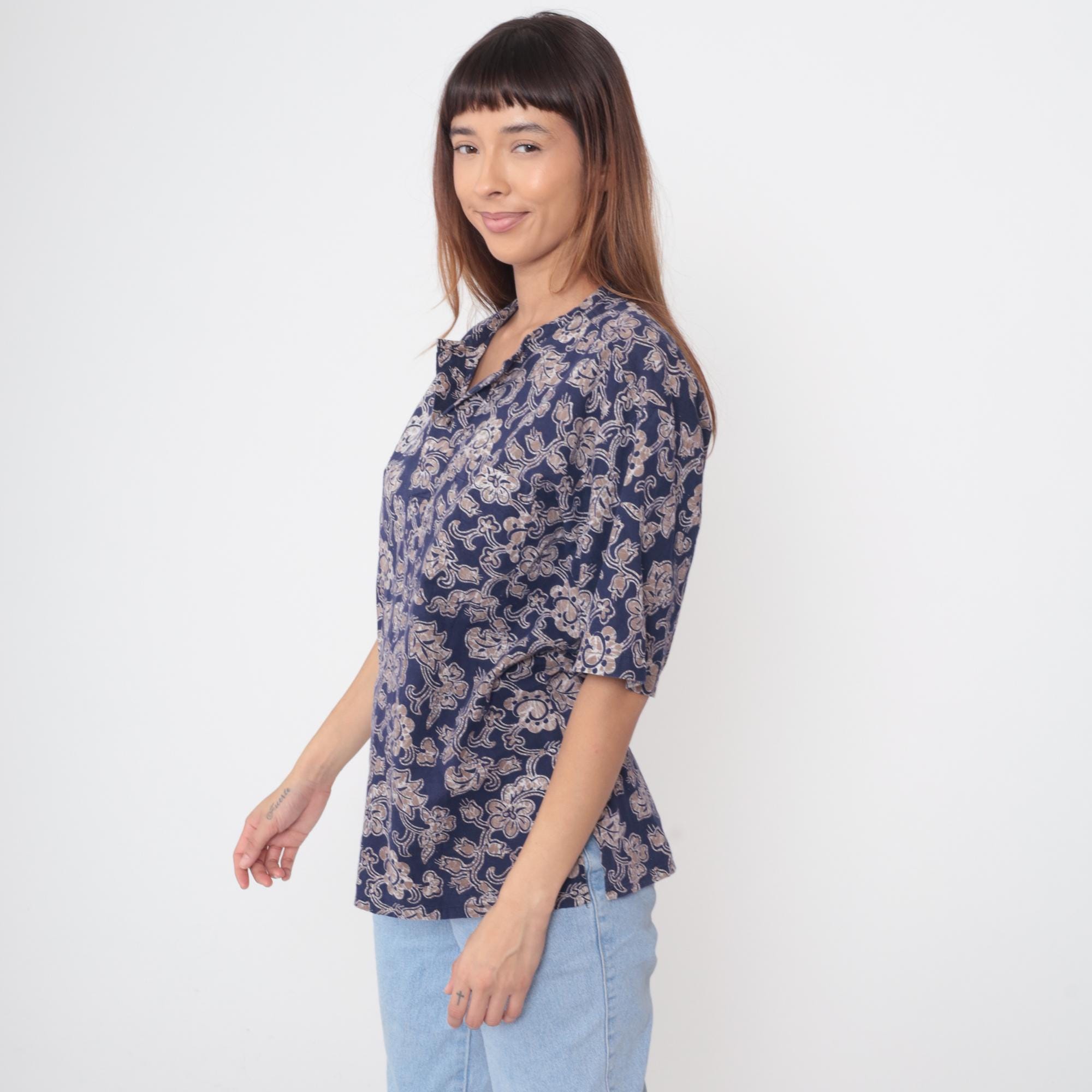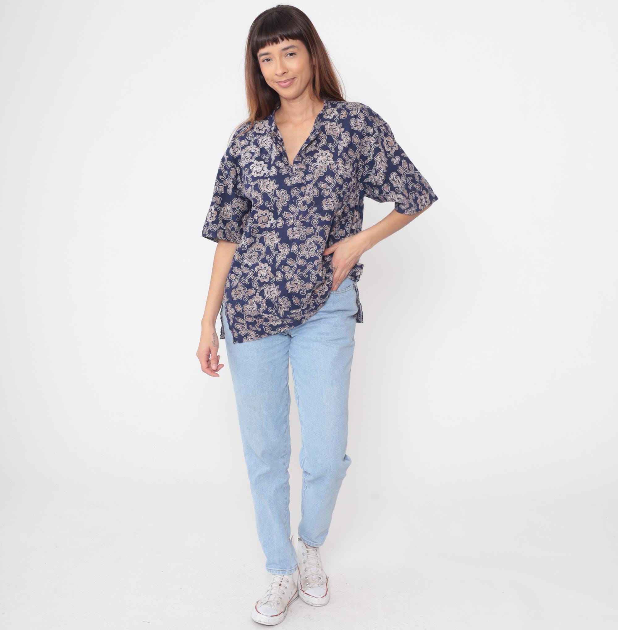 Y2K navy blue paisley blouse from Craute Creation. Short sleeve design with split neck and button closure. Oversized relaxed fit featuring intricate paisley and floral print in navy, tan, and white.