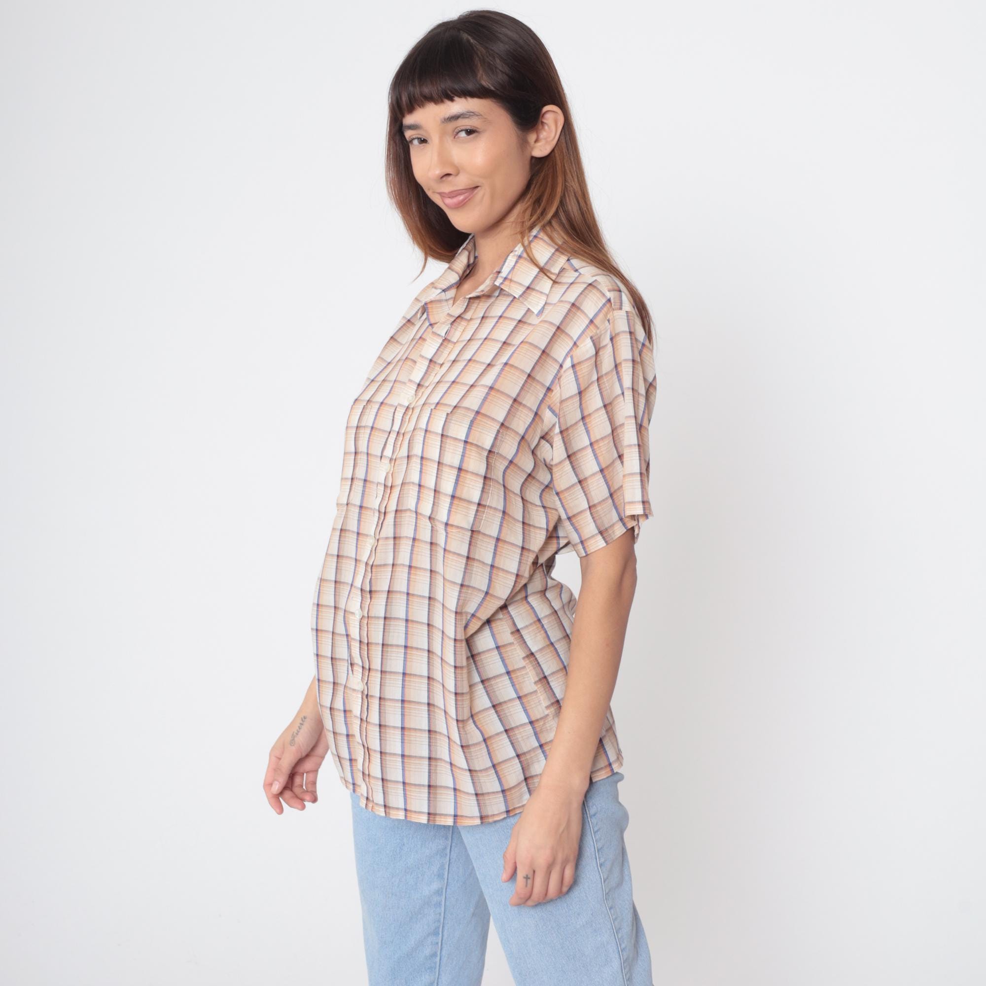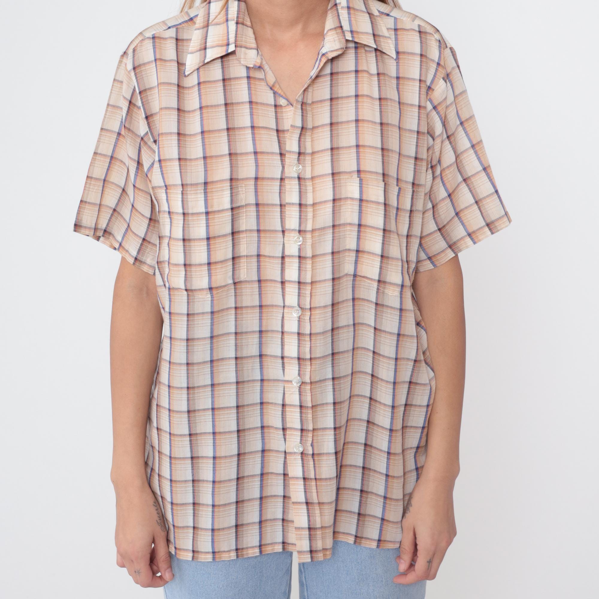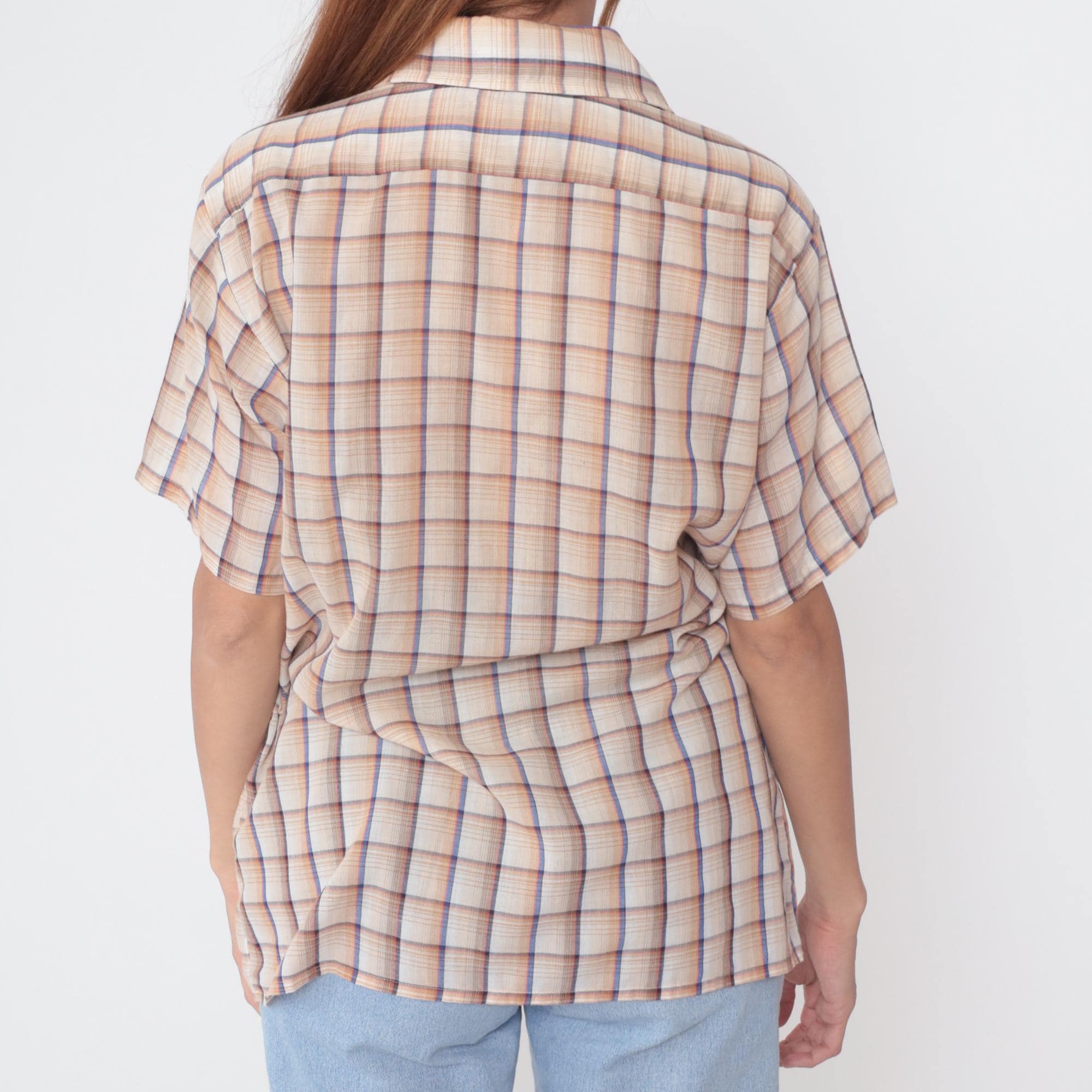 80s beige plaid shirt from Van Heusen featuring soft check pattern in brown and blue tones. Short sleeve button-up design with classic collar and oversized relaxed fit. Neutral color palette with fine plaid detailing.
