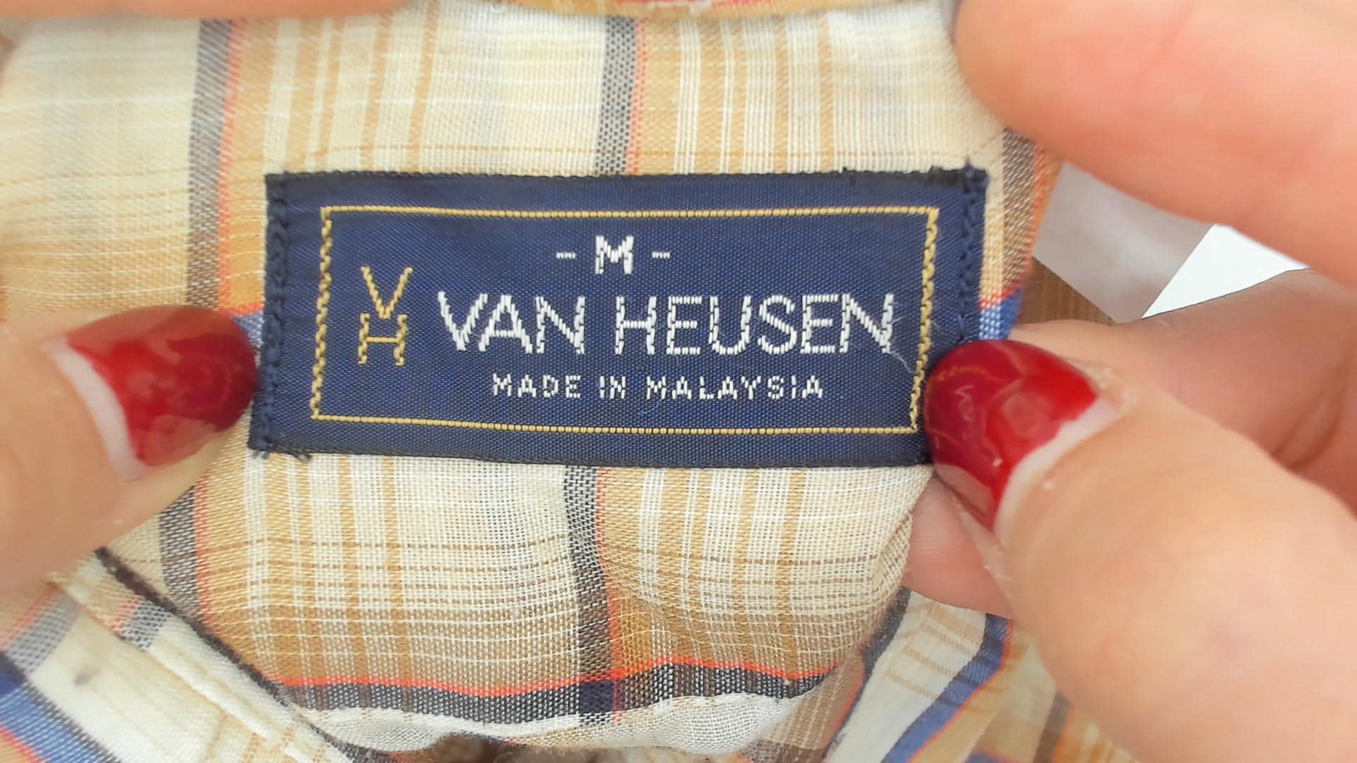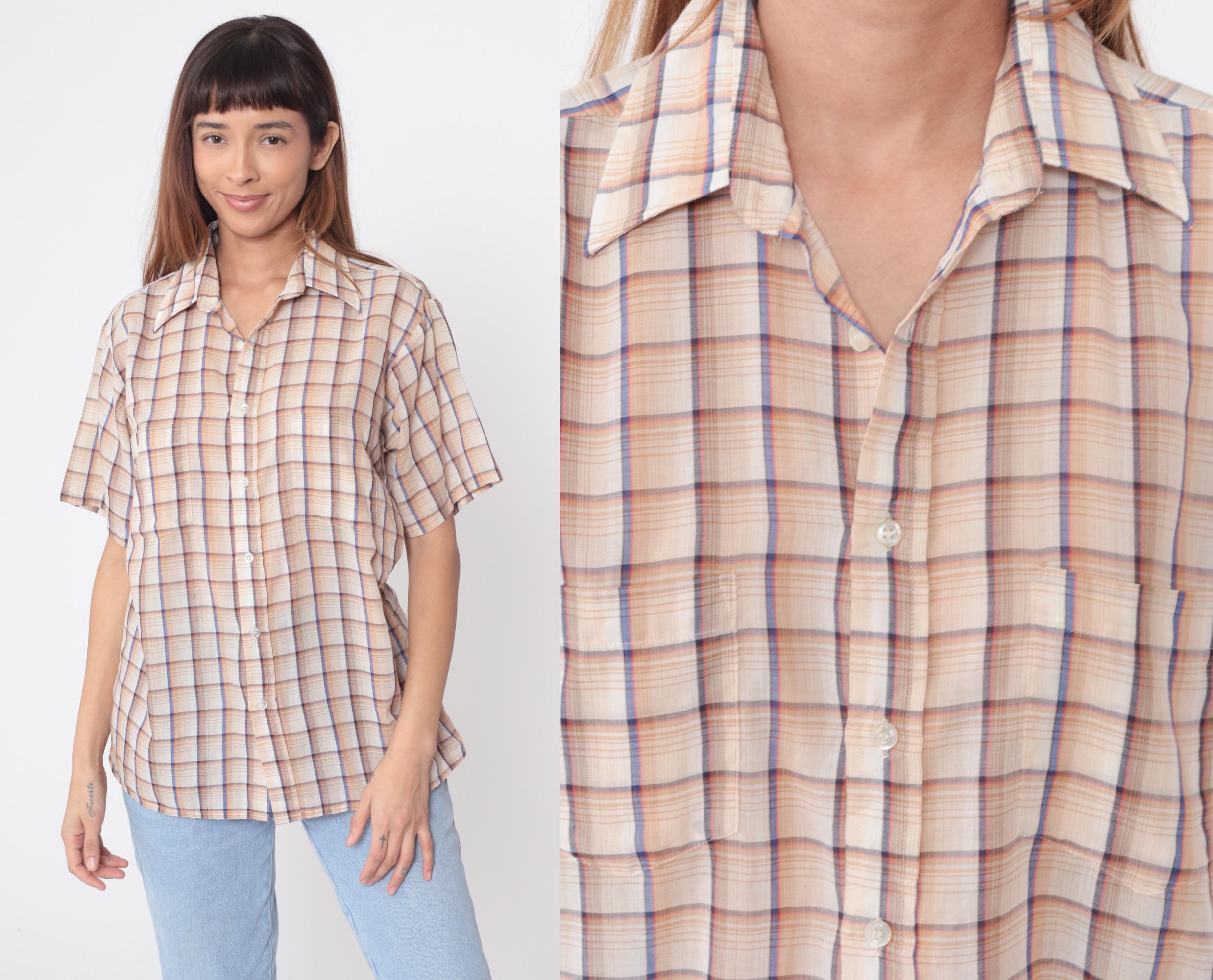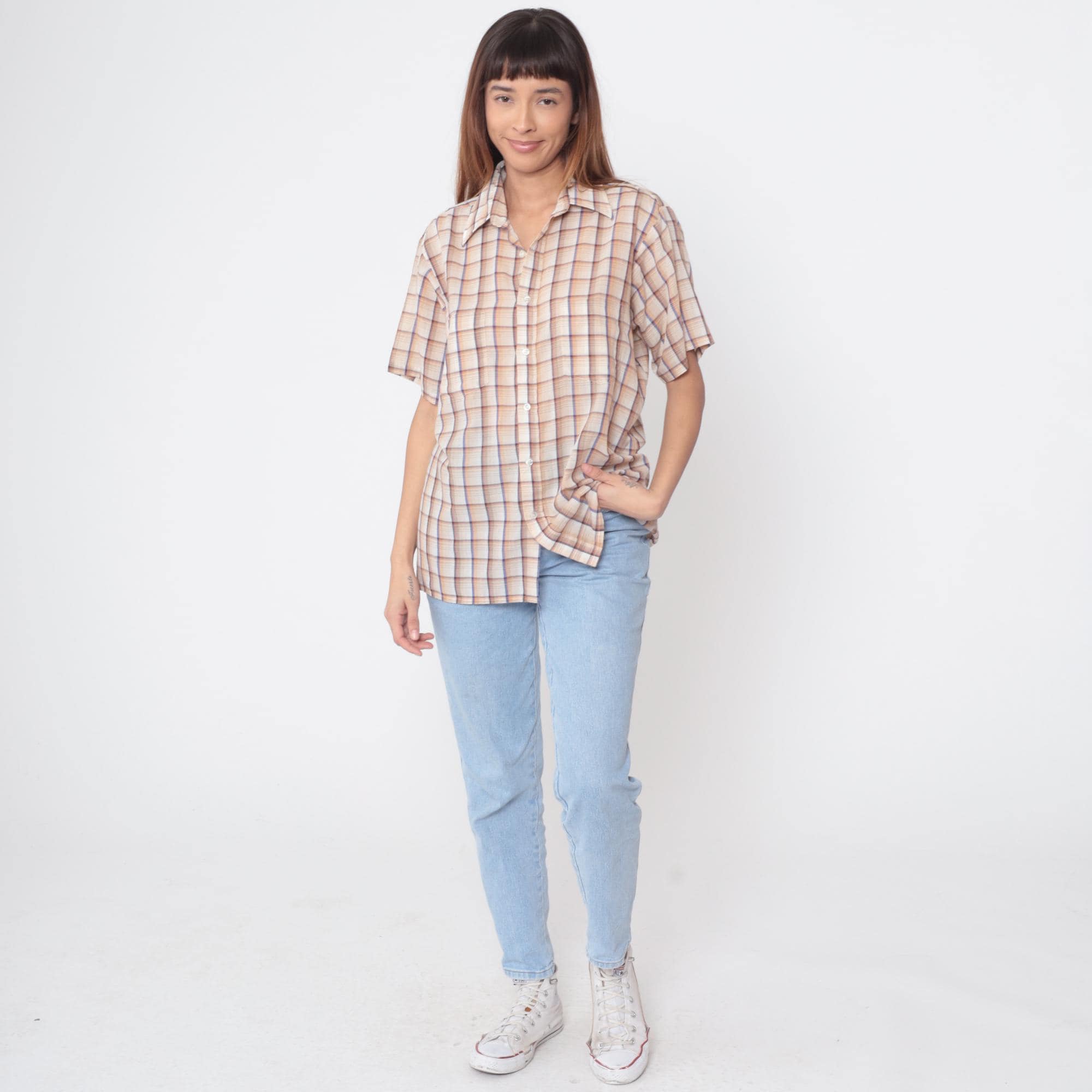 80s beige plaid shirt from Van Heusen featuring soft check pattern in brown and blue tones. Short sleeve button-up design with classic collar and oversized relaxed fit. Neutral color palette with fine plaid detailing.