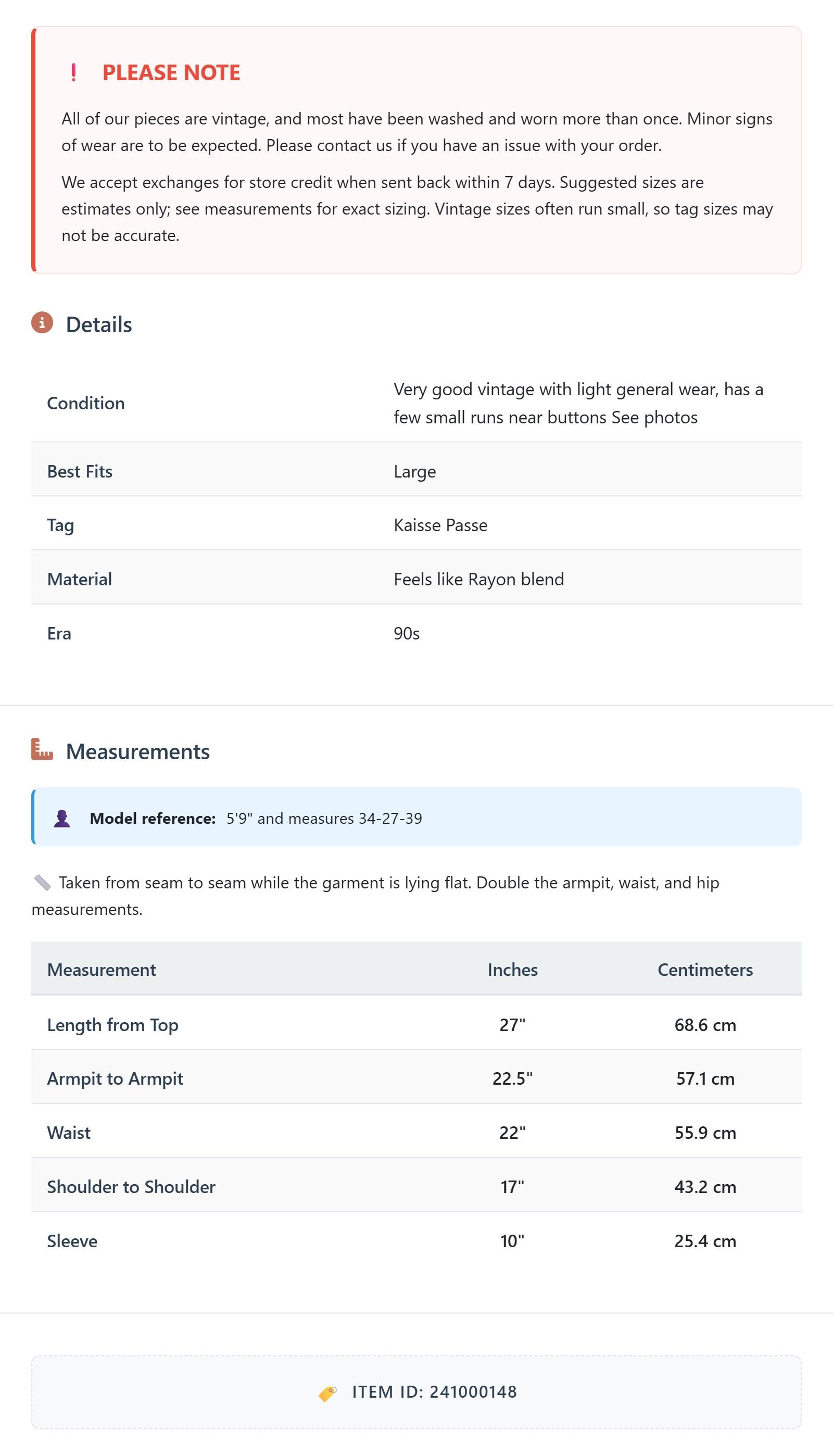 All of our pieces are vintage, and most have been washed and worn more than once. Minor signs of wear are to be expected. Please contact us if you have an issue with your order. We accept exchanges for store credit when sent back within 7 days.