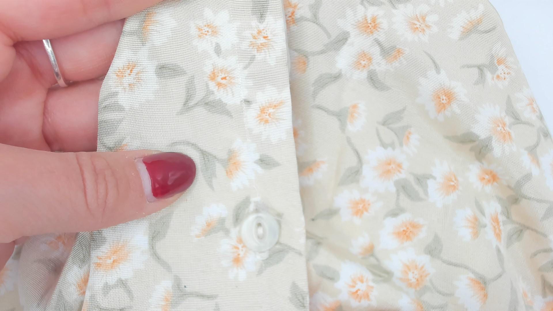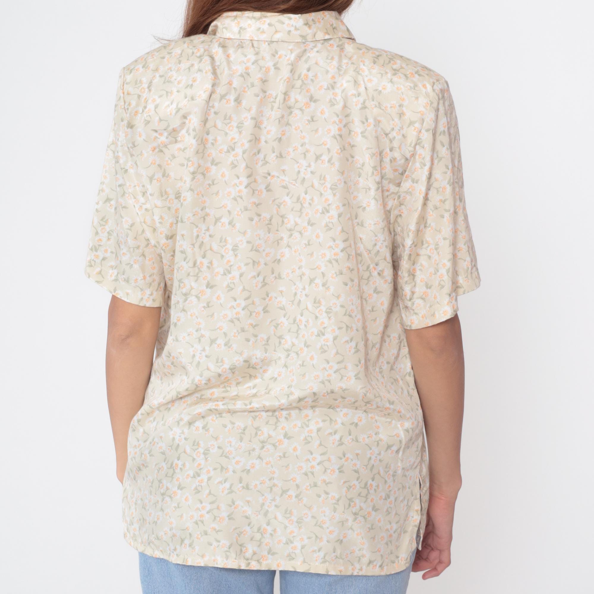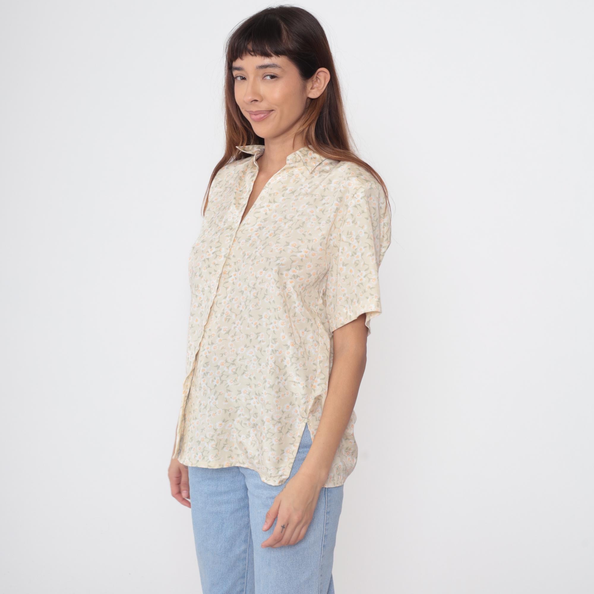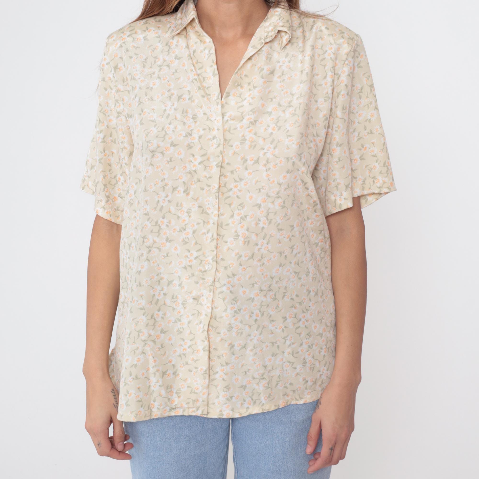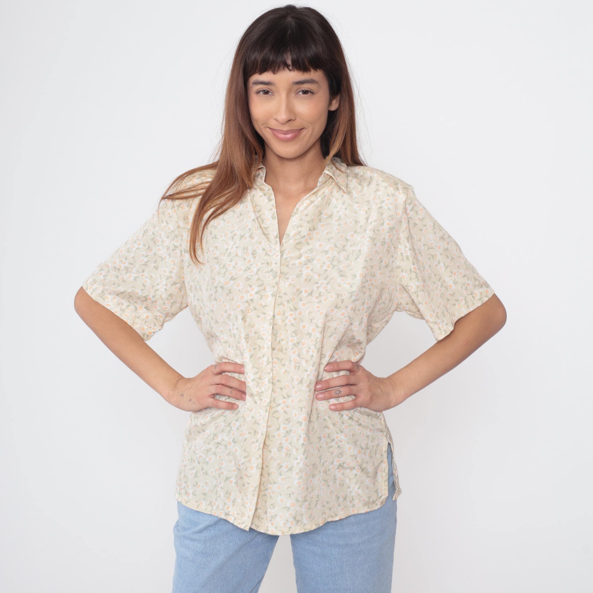 90s floral shirt featuring a soft daisy print on a light beige base. Designed with a relaxed drape, short sleeves, a pointed collar, and a full button front.