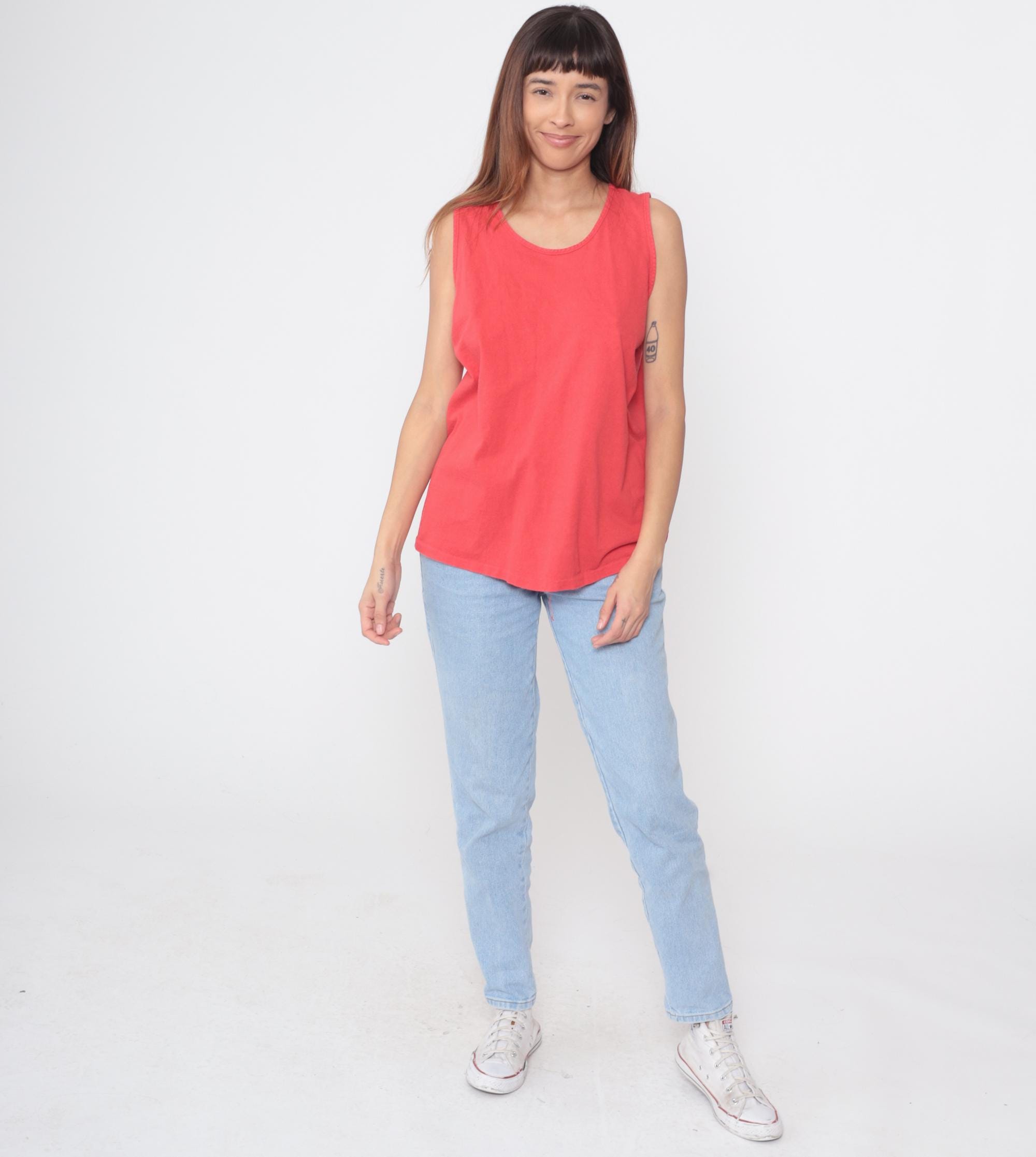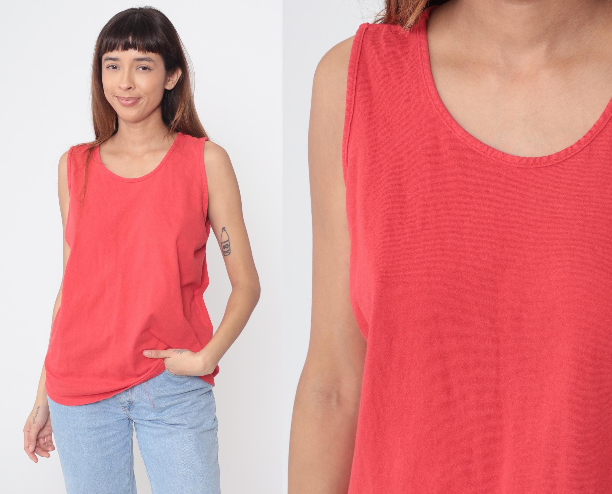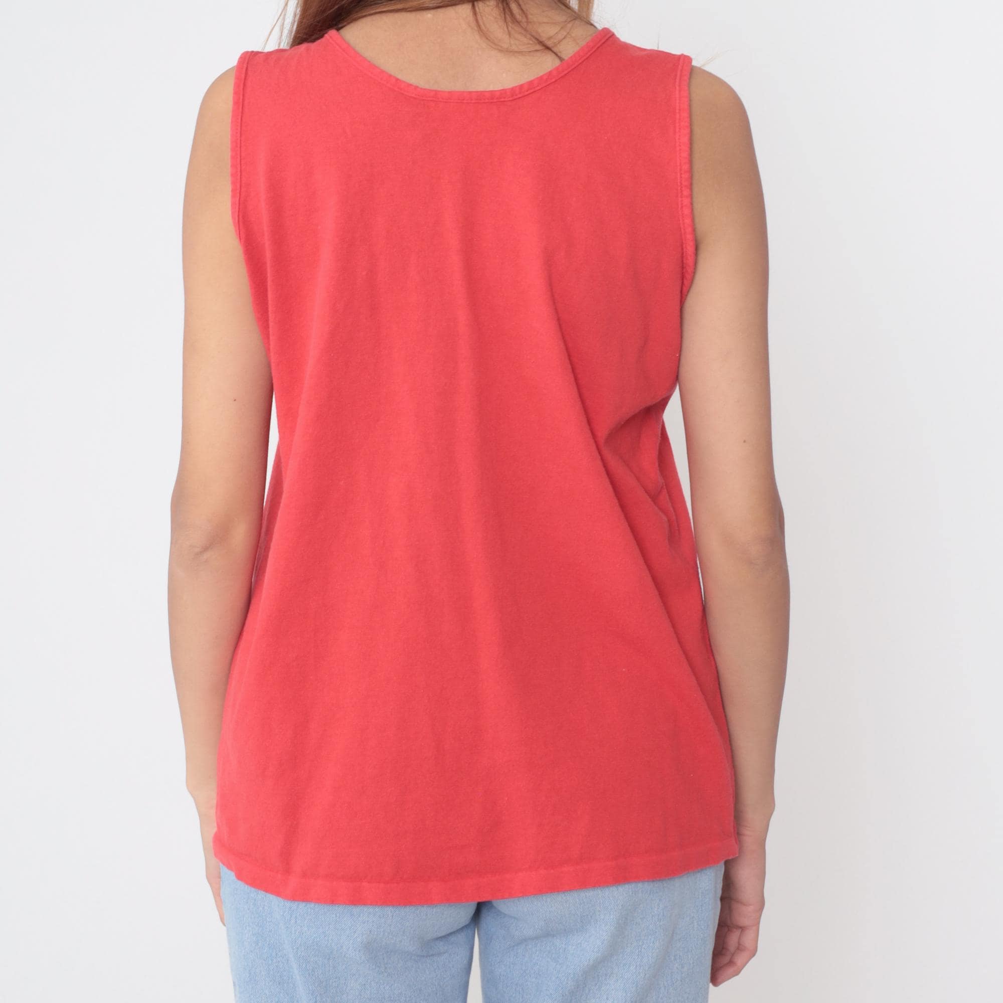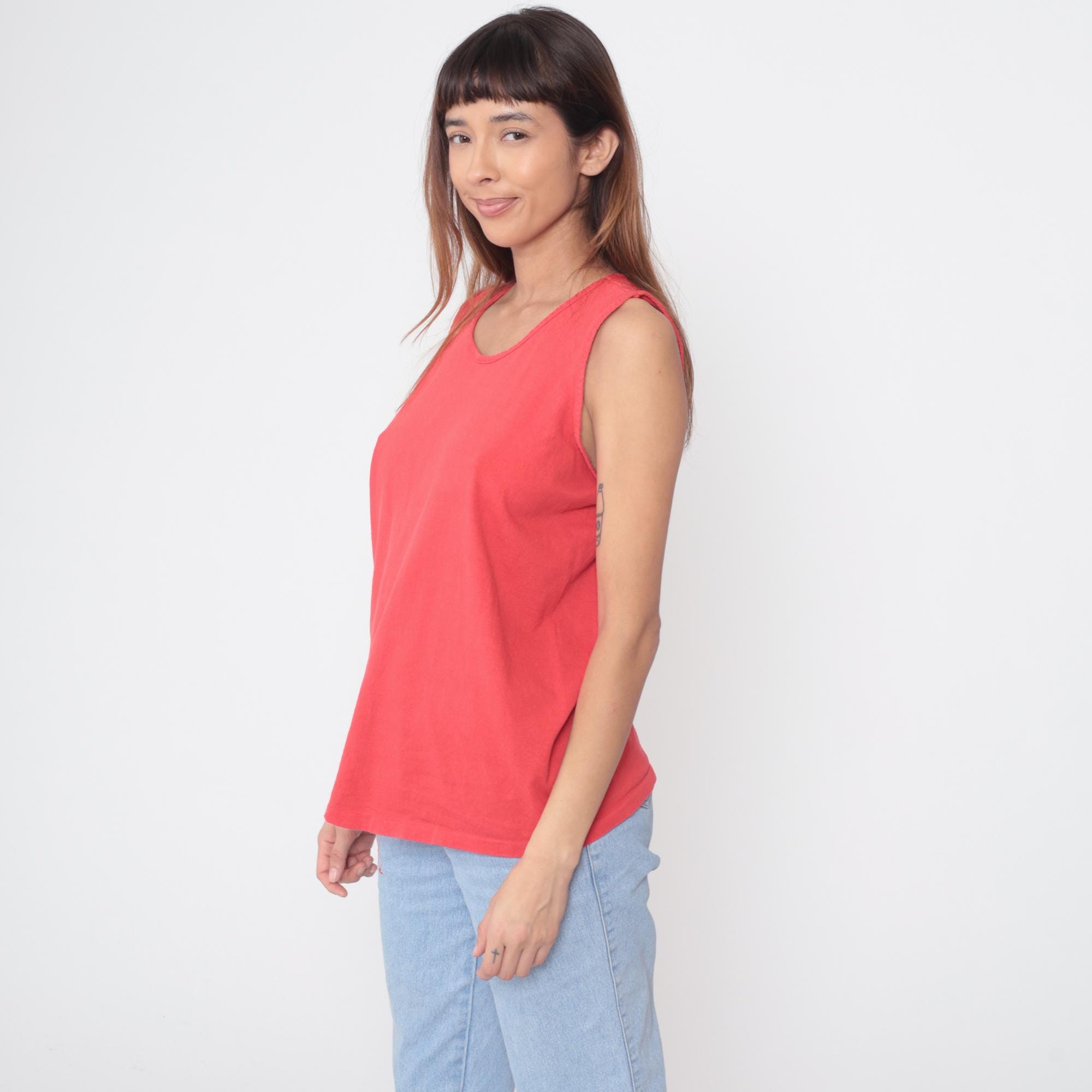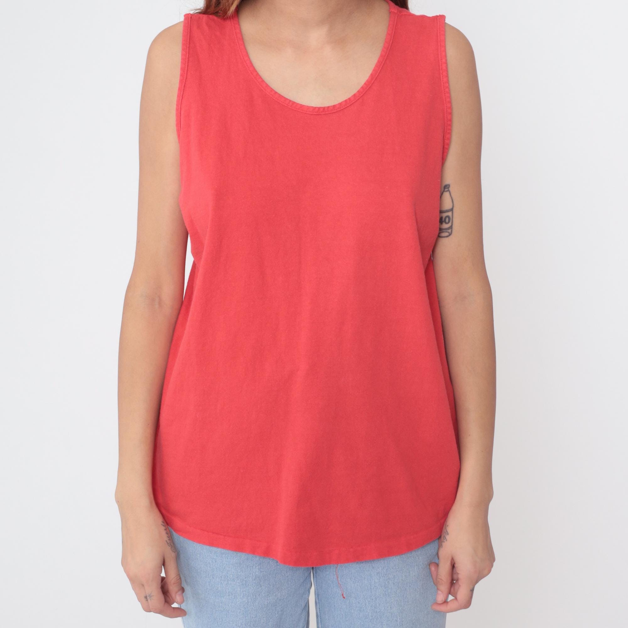 90s coral tank top in bright salmon pink shade. Classic sleeveless design with scoop neckline and relaxed fit. Basic essential perfect for layering or wearing alone.