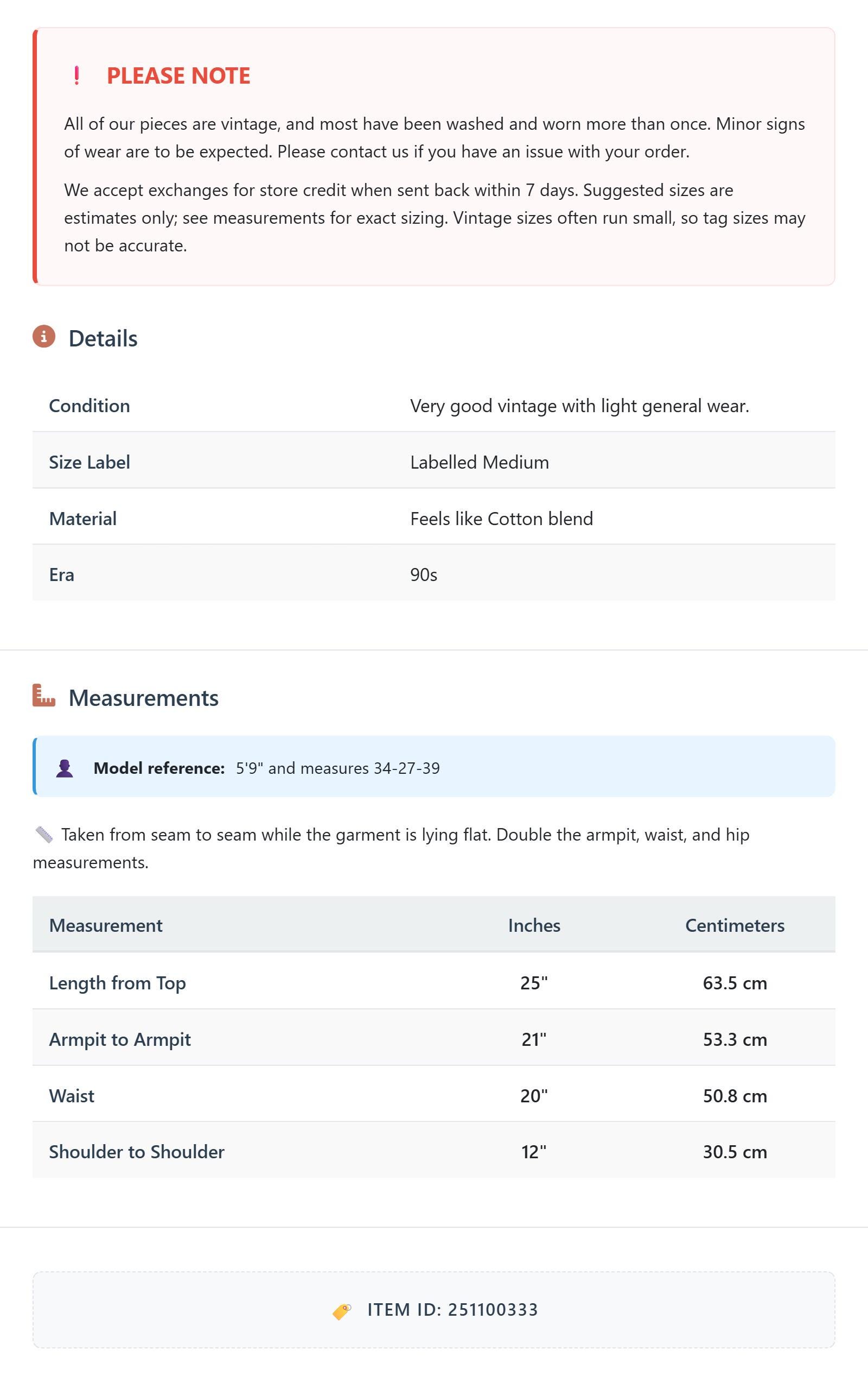 All of our pieces are vintage, and most have been washed and worn more than once. Minor signs of wear are to be expected. Please contact us if you have an issue with your order. We accept exchanges for store credit when sent back within 7 days.