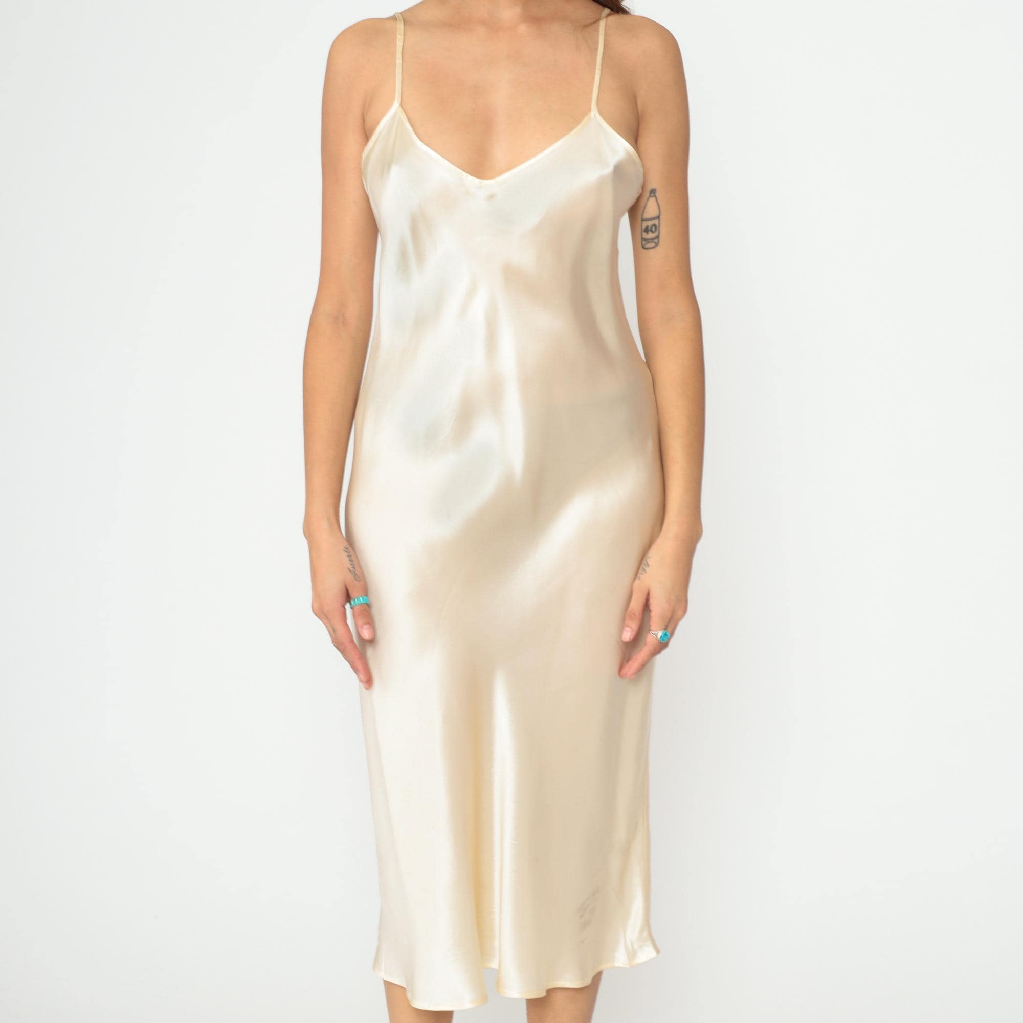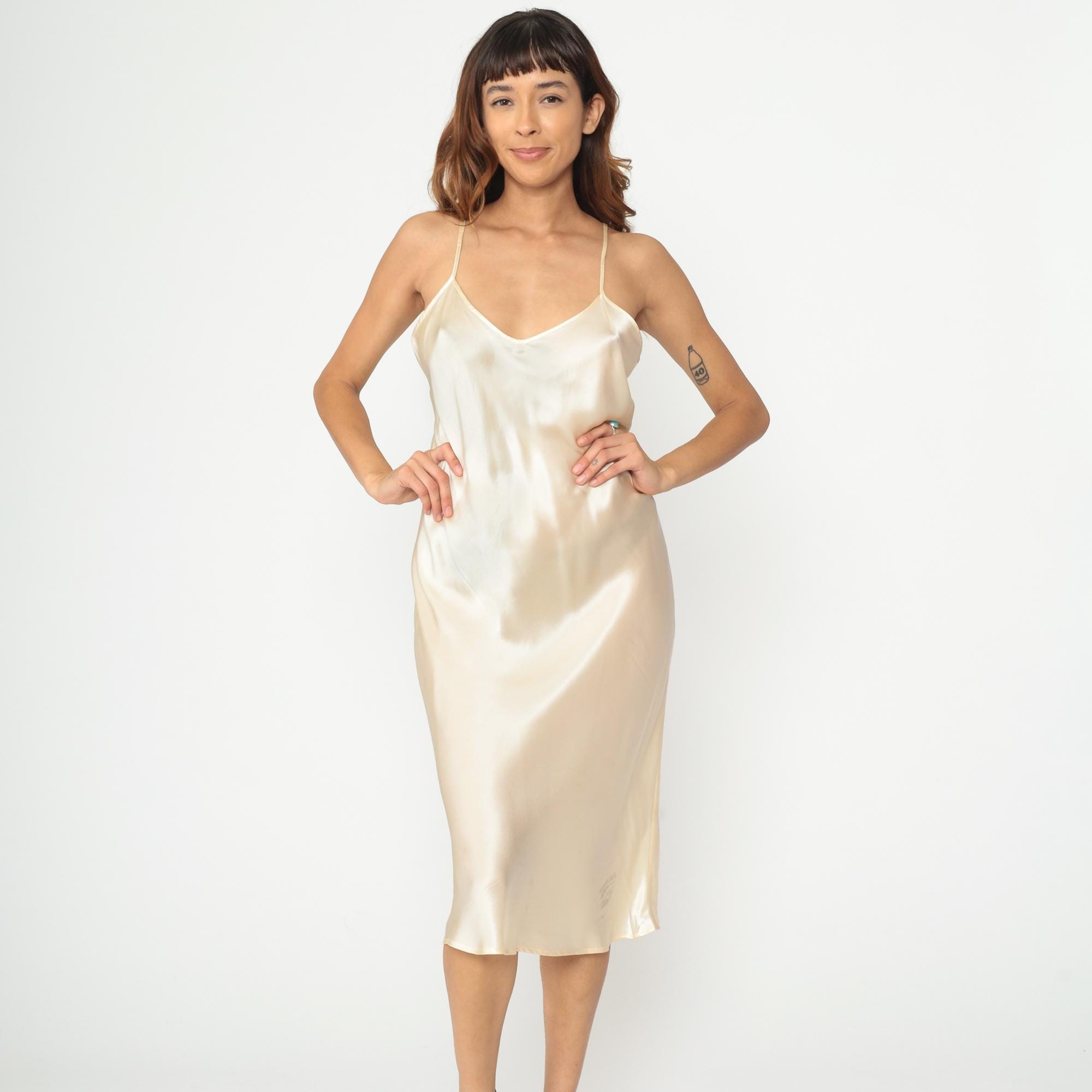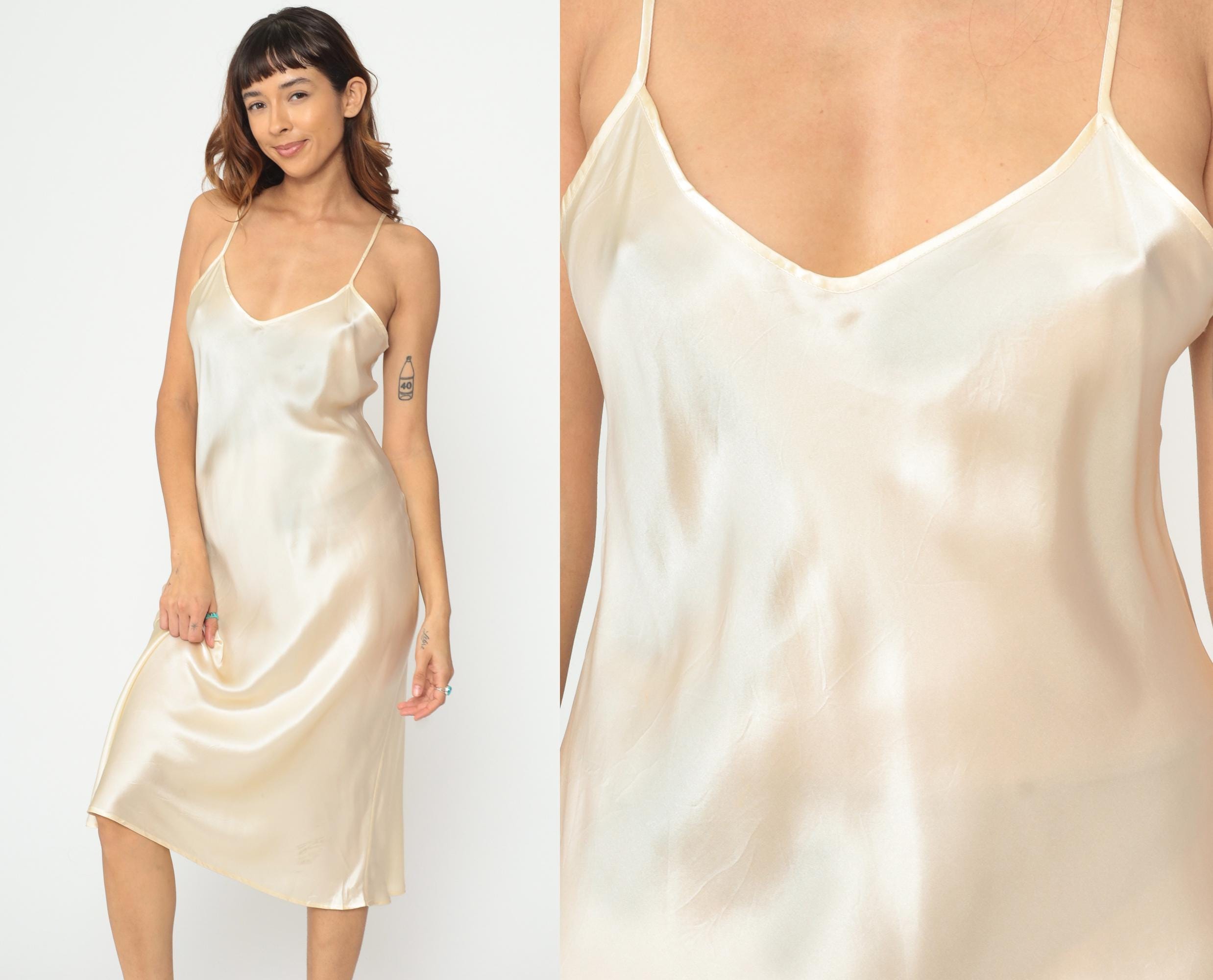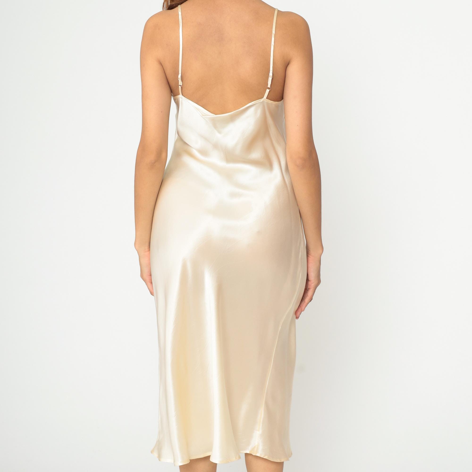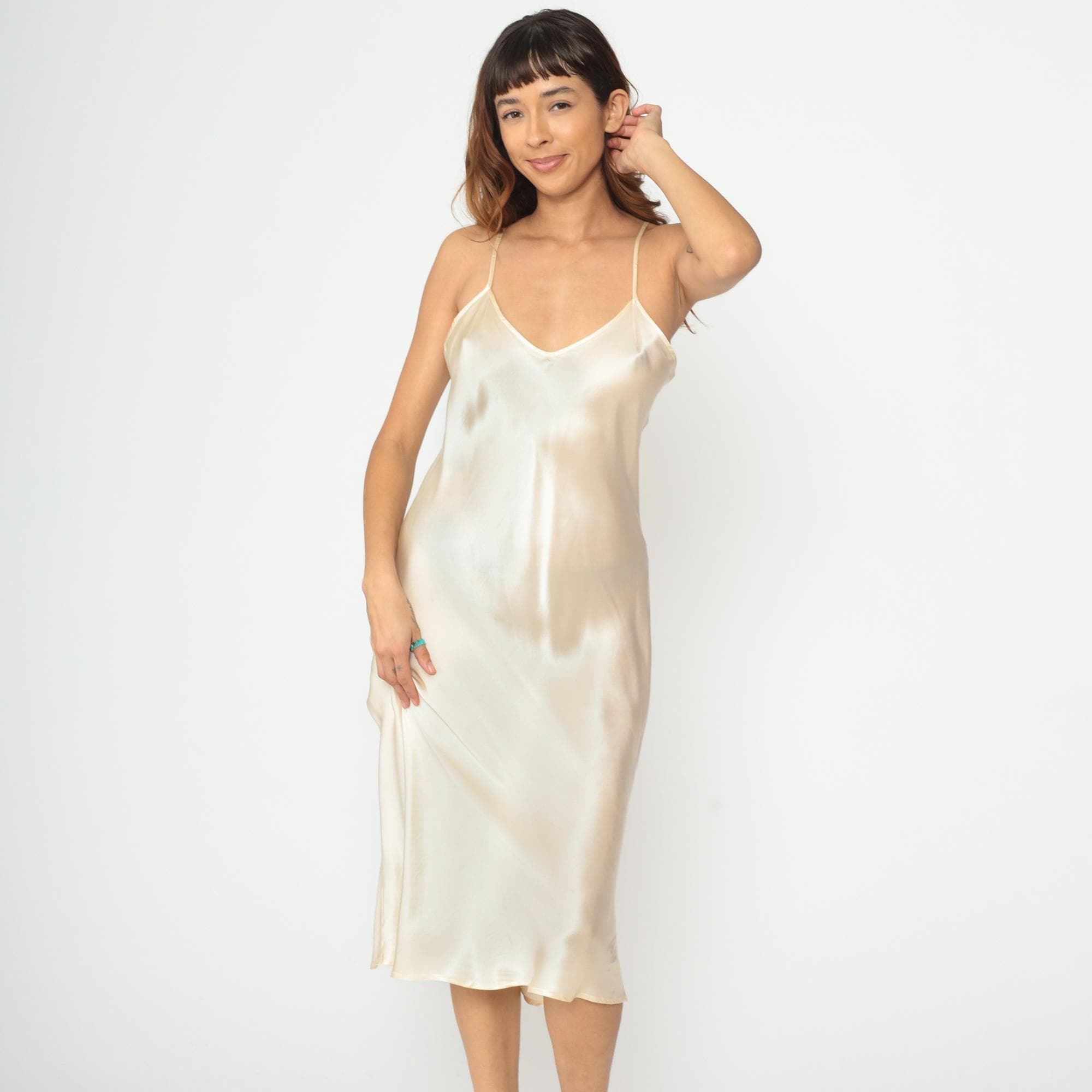 Y2K cream silk slip dress with spaghetti straps and V-neckline. Bias cut construction with midi length hem. Simple, minimalist silhouette in luxurious silk fabric. Tagged size Large.