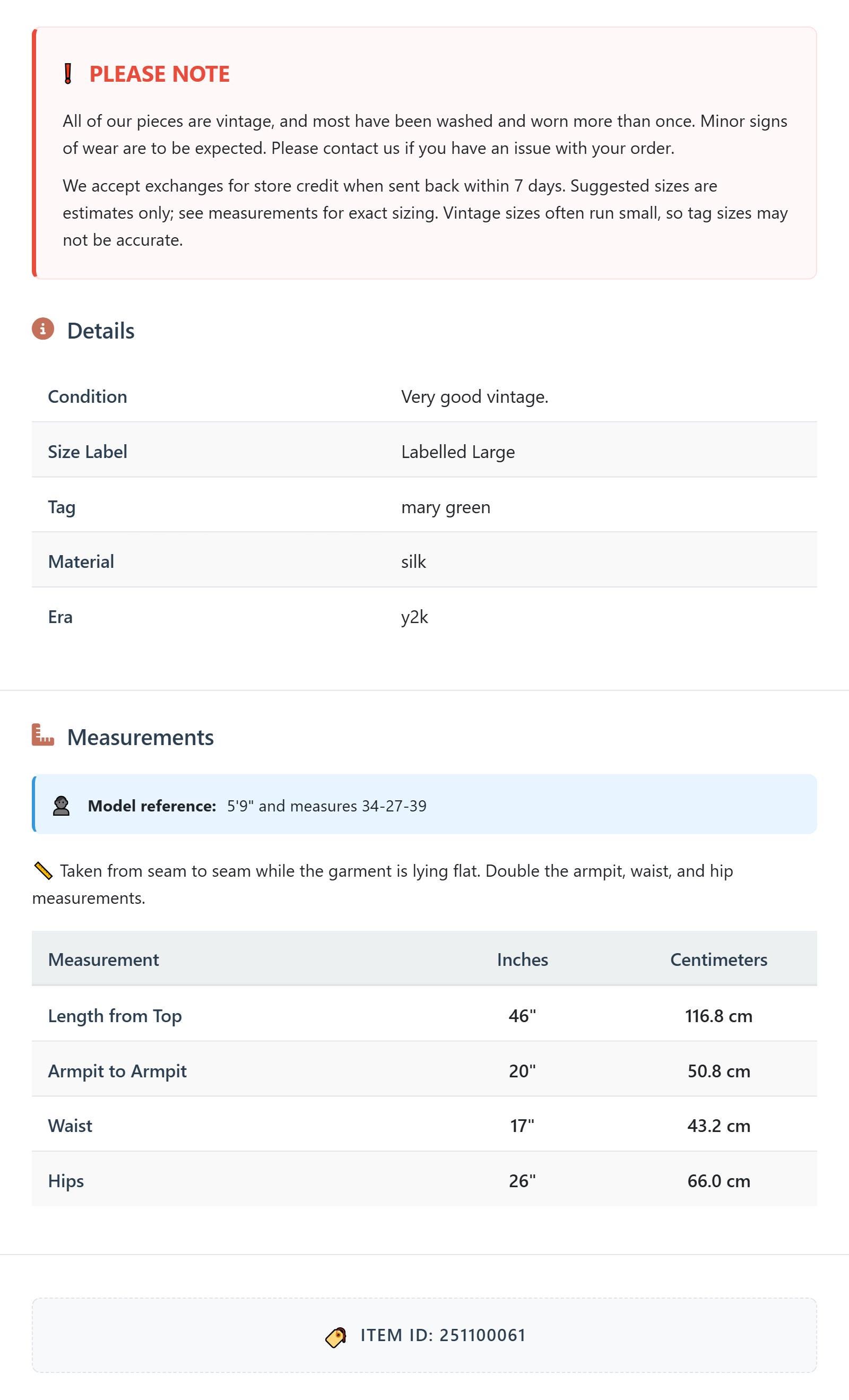 All of our pieces are vintage, and most have been washed and worn more than once. Minor signs of wear are to be expected. Please contact us if you have an issue with your order. We accept exchanges for store credit when sent back within 7 days.