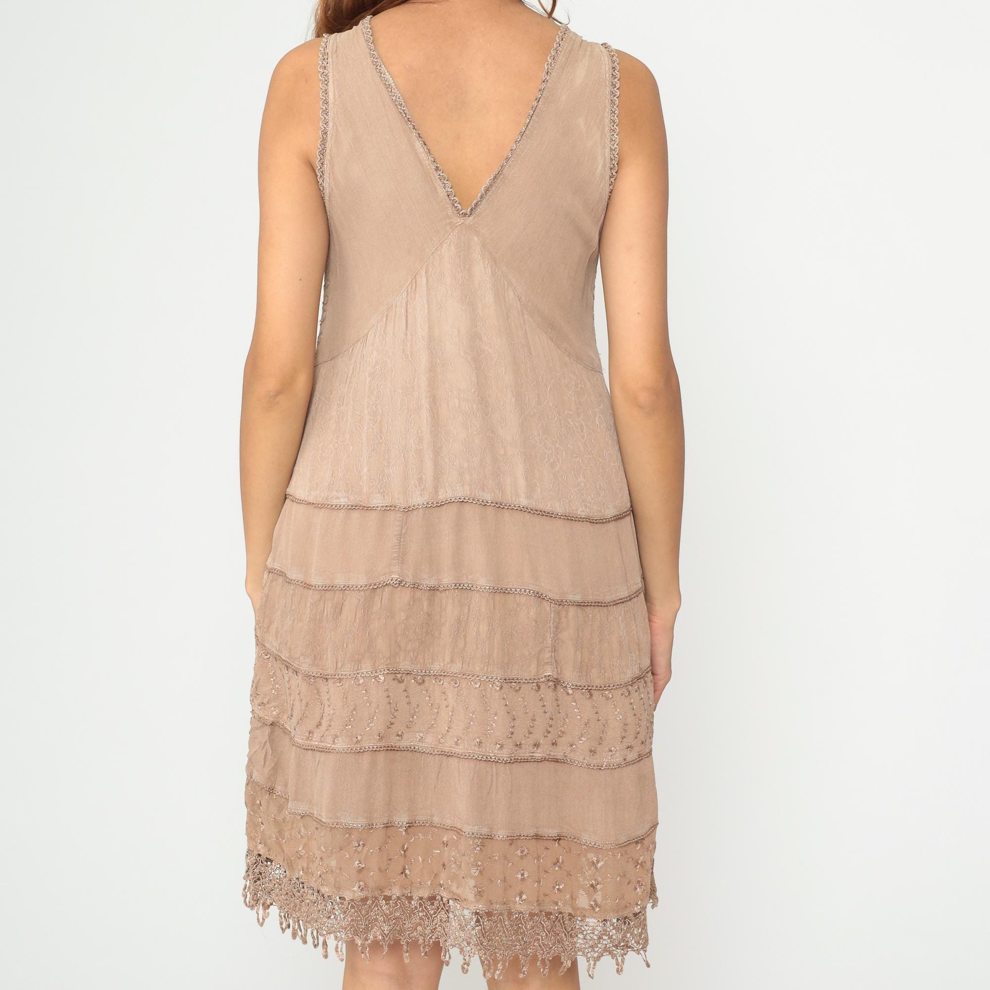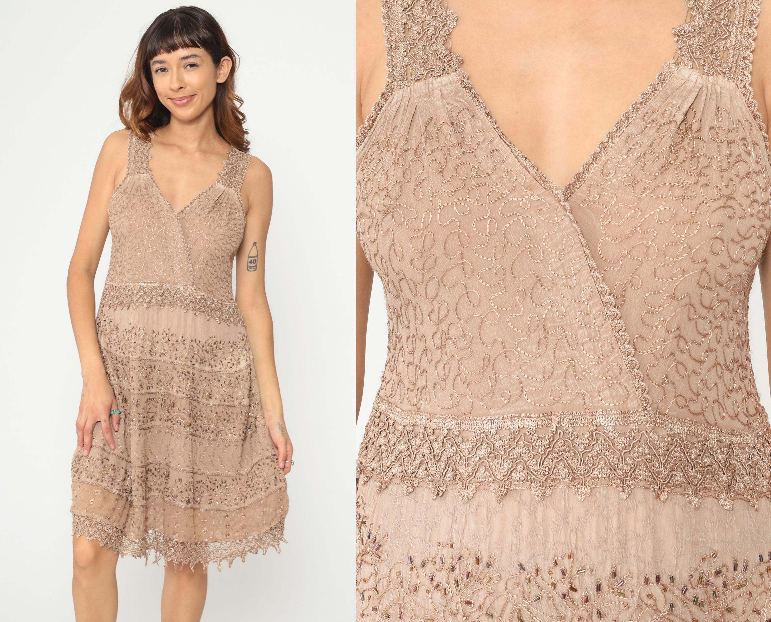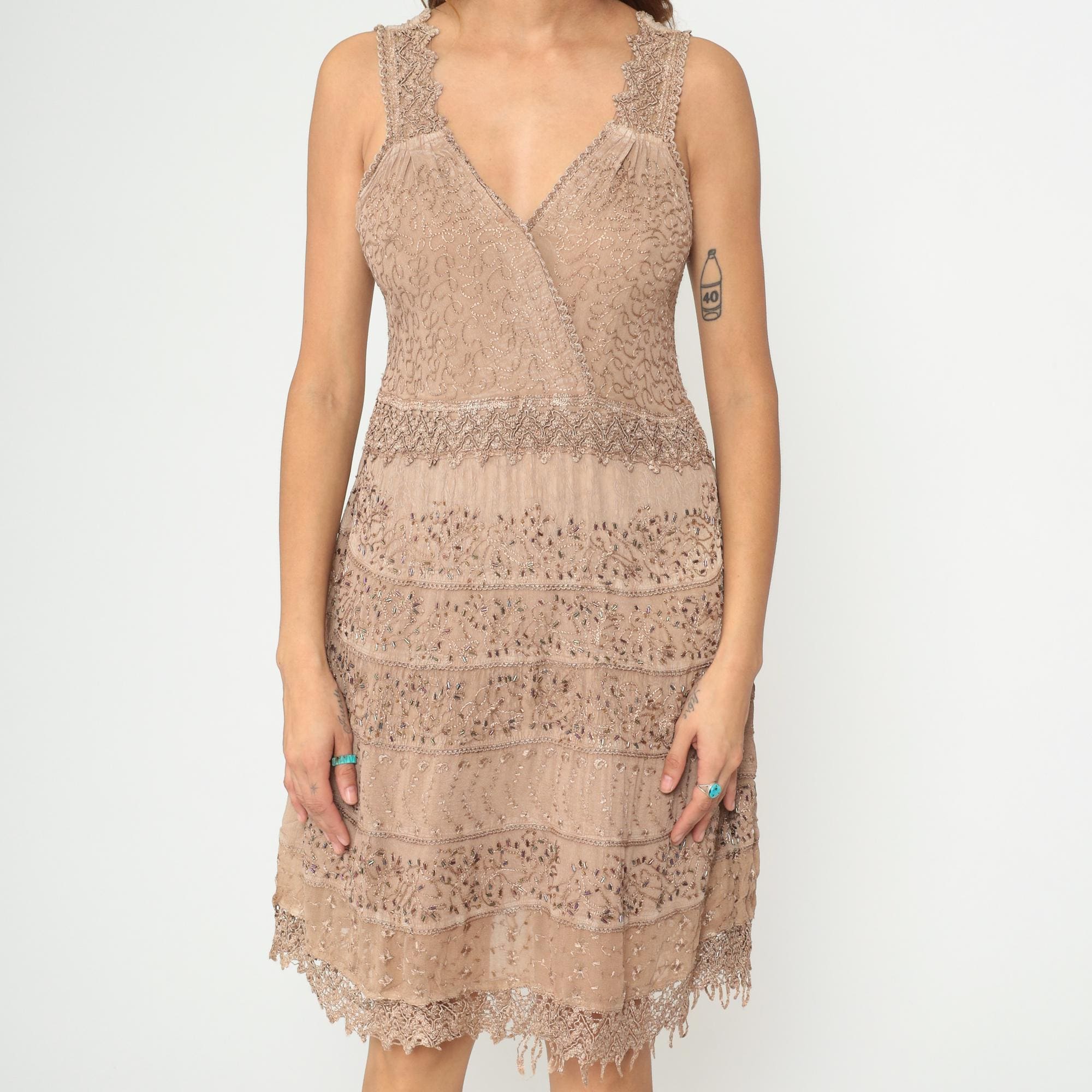 Y2K beige beaded lace dress from magic with tiered construction and intricate embellishment throughout. V-neck front and back with beaded lace shoulder straps, drop waist with horizontal tiers alternating between embroidered lace panels and beaded mesh bands. Scalloped beaded lace trim at hem with fringe detail. Rayon. Tagged size Large.
