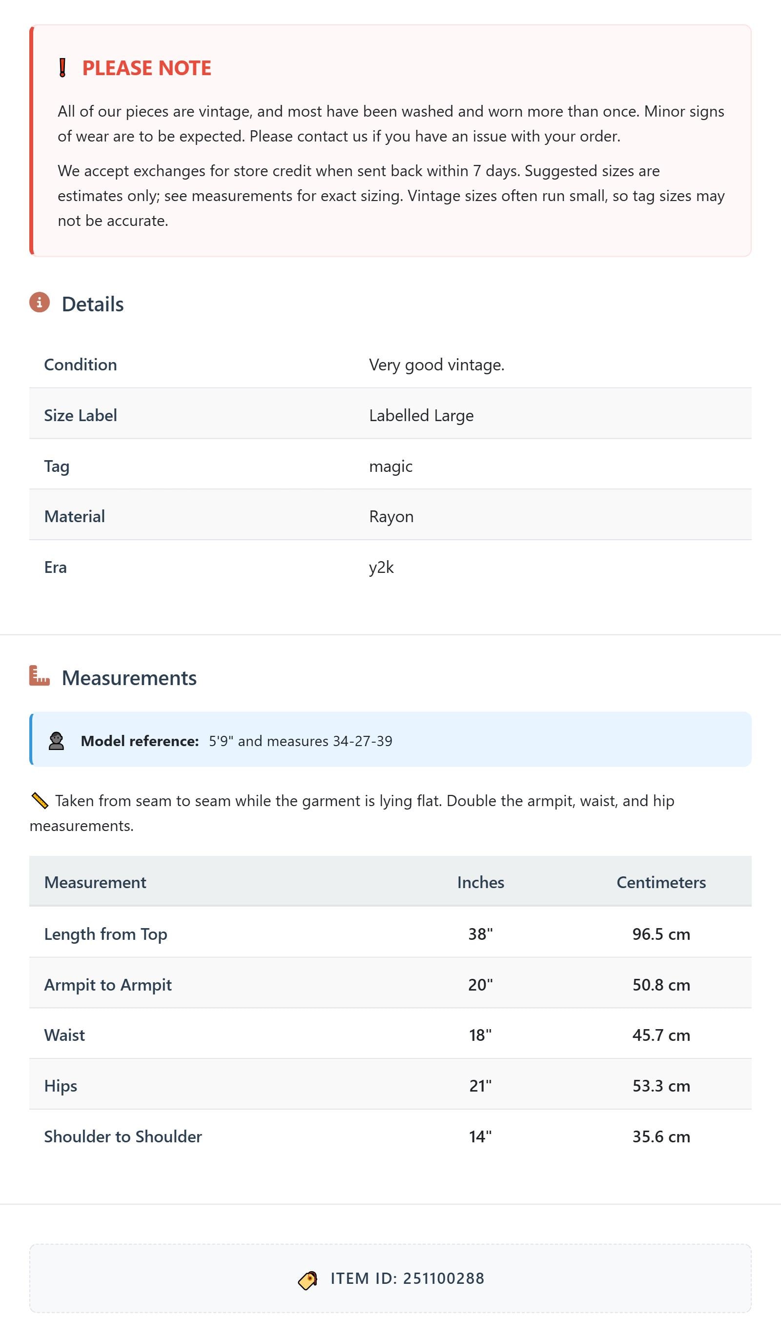 All of our pieces are vintage, and most have been washed and worn more than once. Minor signs of wear are to be expected. Please contact us if you have an issue with your order. We accept exchanges for store credit when sent back within 7 days.