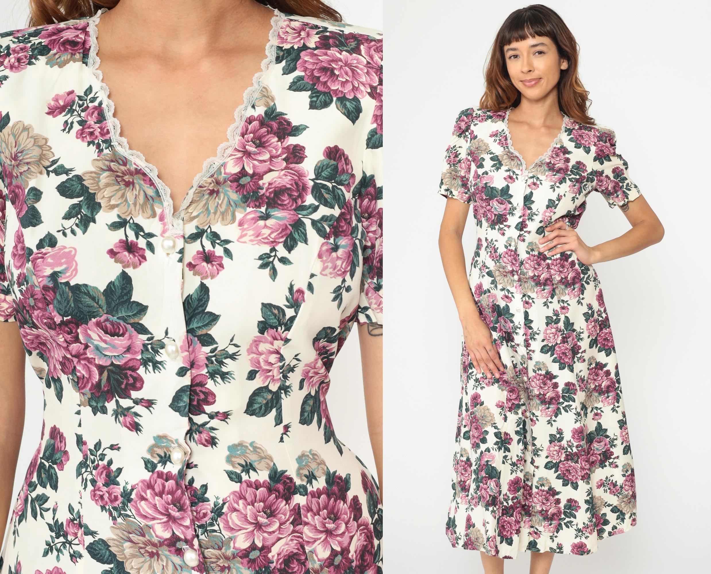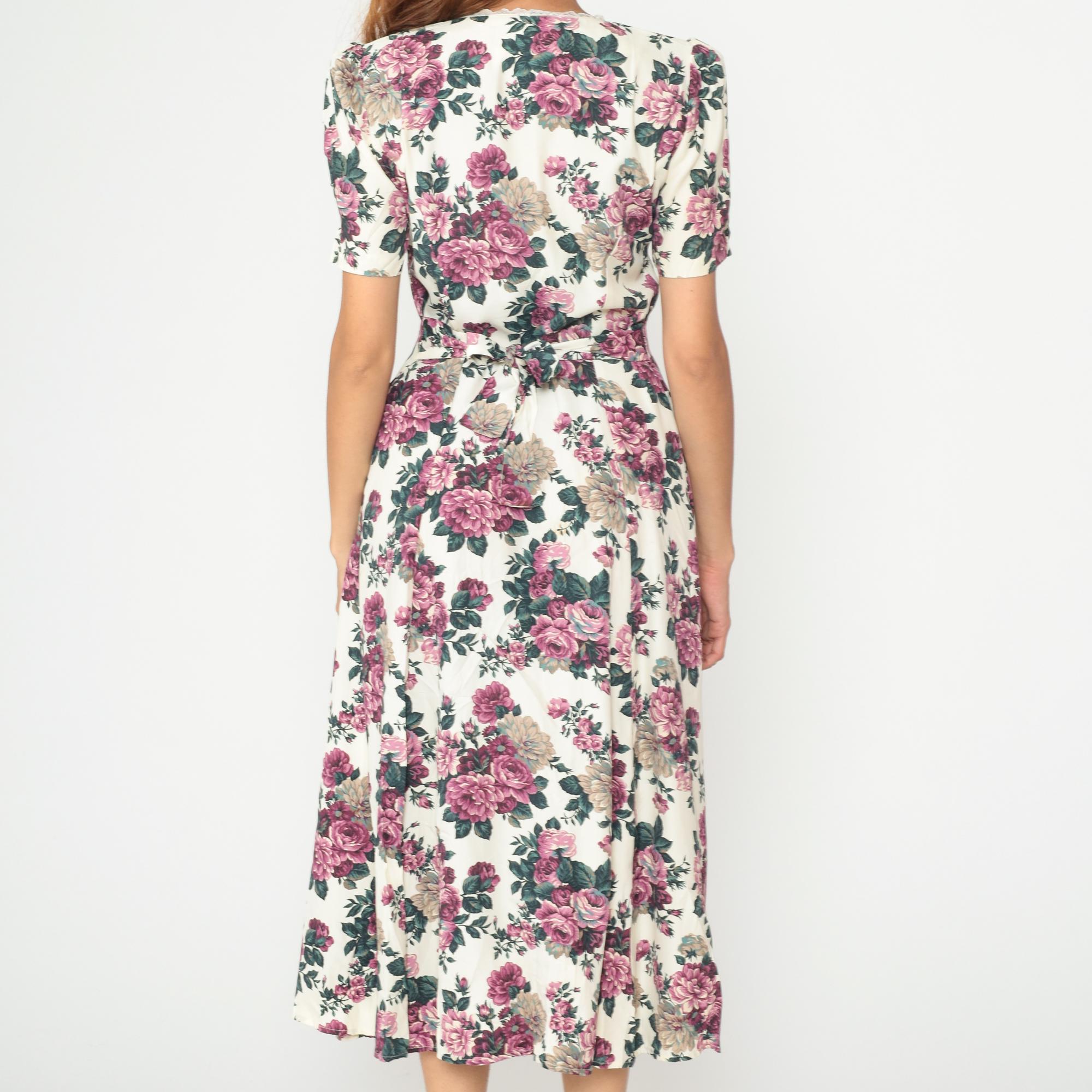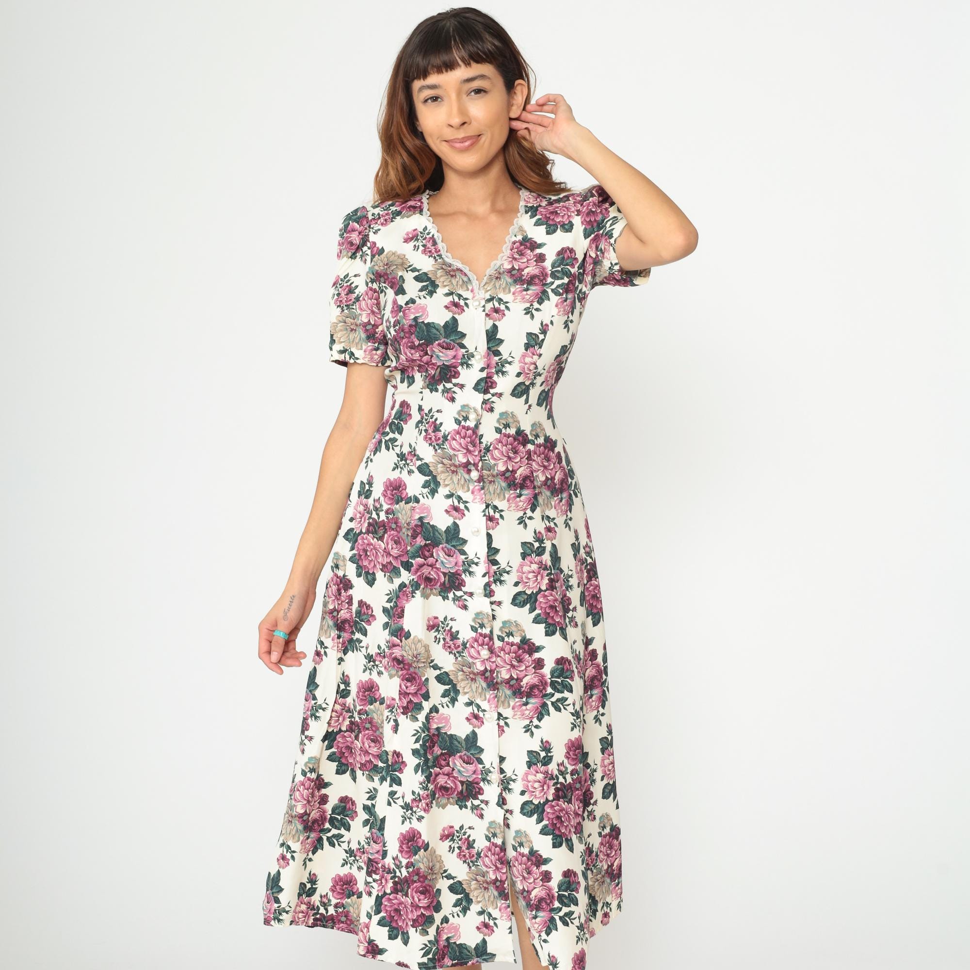 90s cream floral midi dress with large pink roses, tan blooms, and green leaves covering the fabric. V-neckline with white lace trim and pearl button closure down the front. Short puffed sleeves with gathered details. Fitted waist with flowing A-line skirt. Made from acetate rayon blend by en focus. Tagged size 3/4.