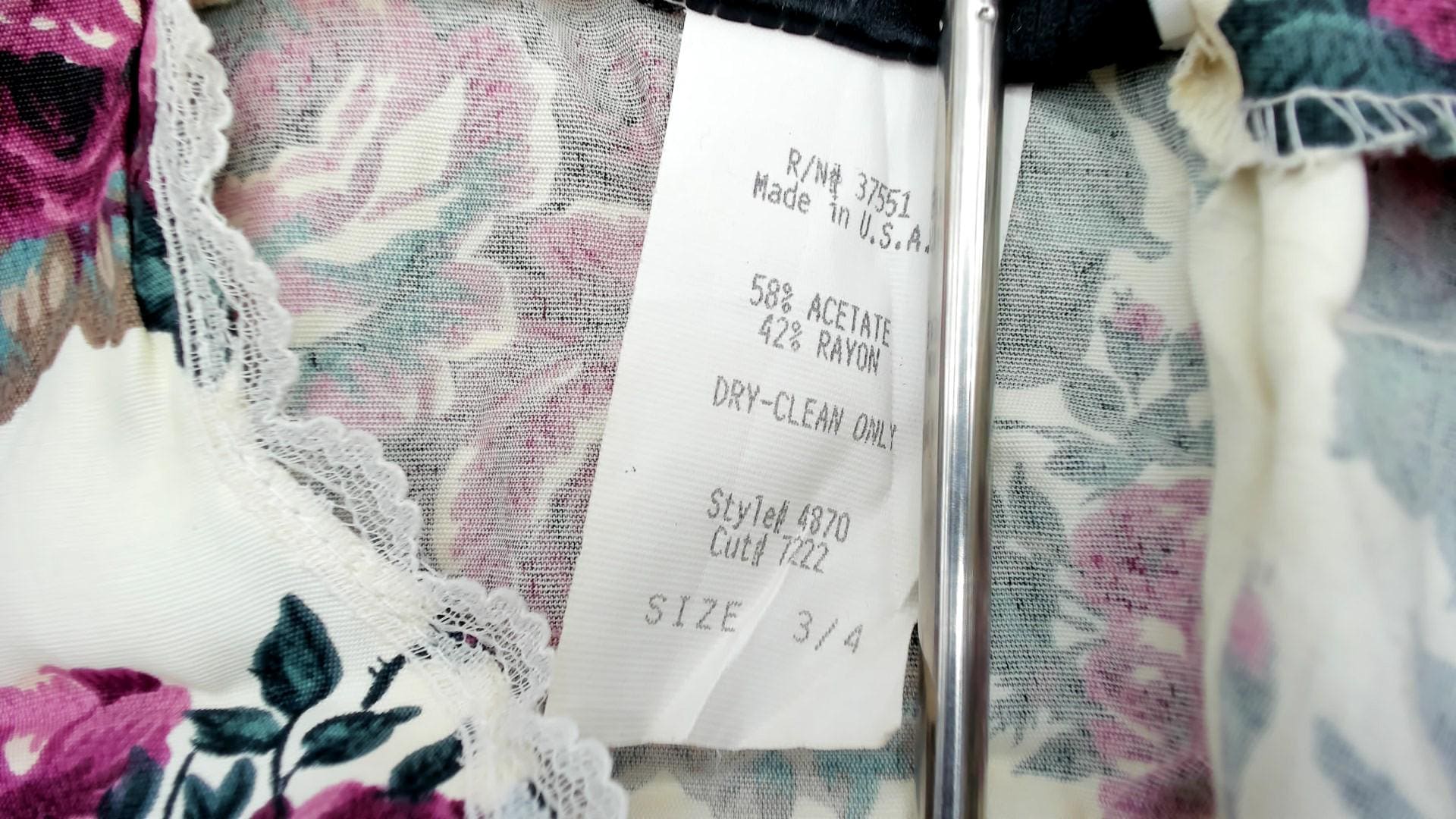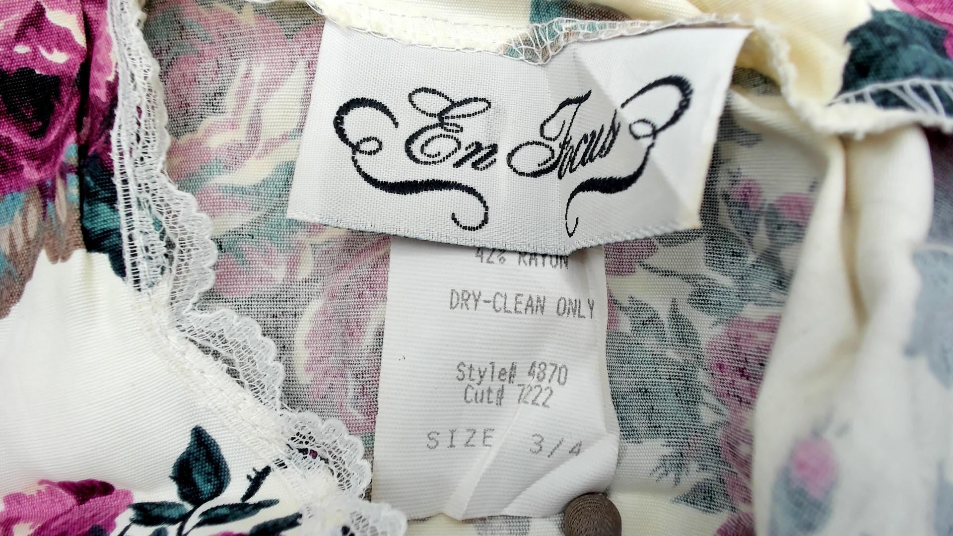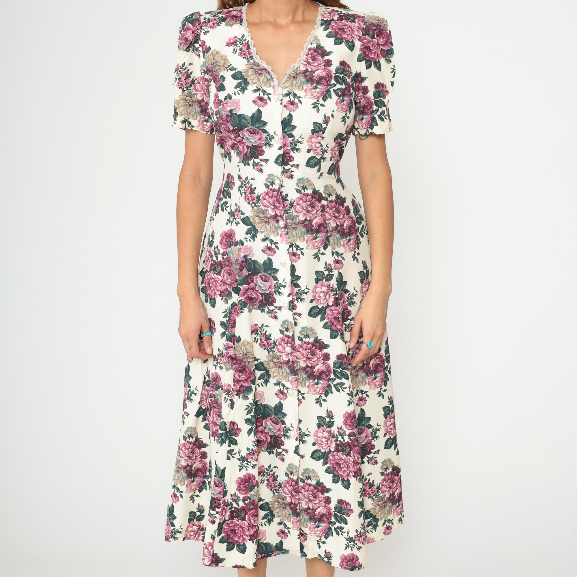 90s cream floral midi dress with large pink roses, tan blooms, and green leaves covering the fabric. V-neckline with white lace trim and pearl button closure down the front. Short puffed sleeves with gathered details. Fitted waist with flowing A-line skirt. Made from acetate rayon blend by en focus. Tagged size 3/4.