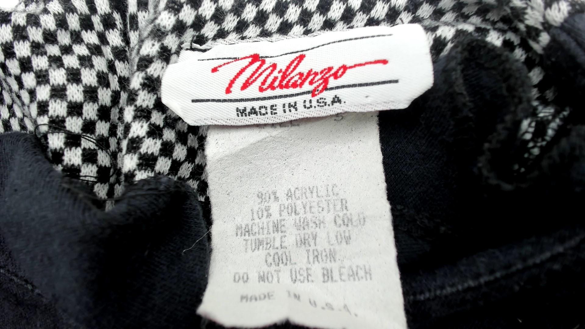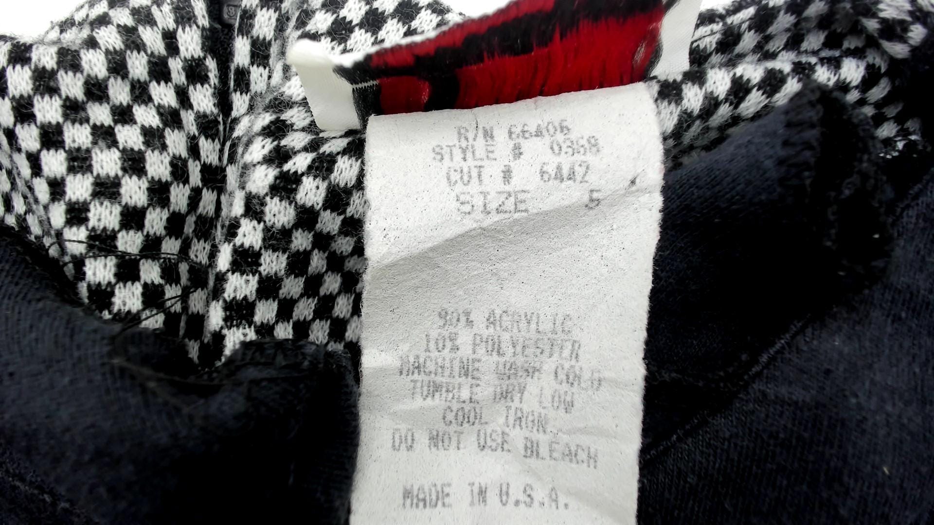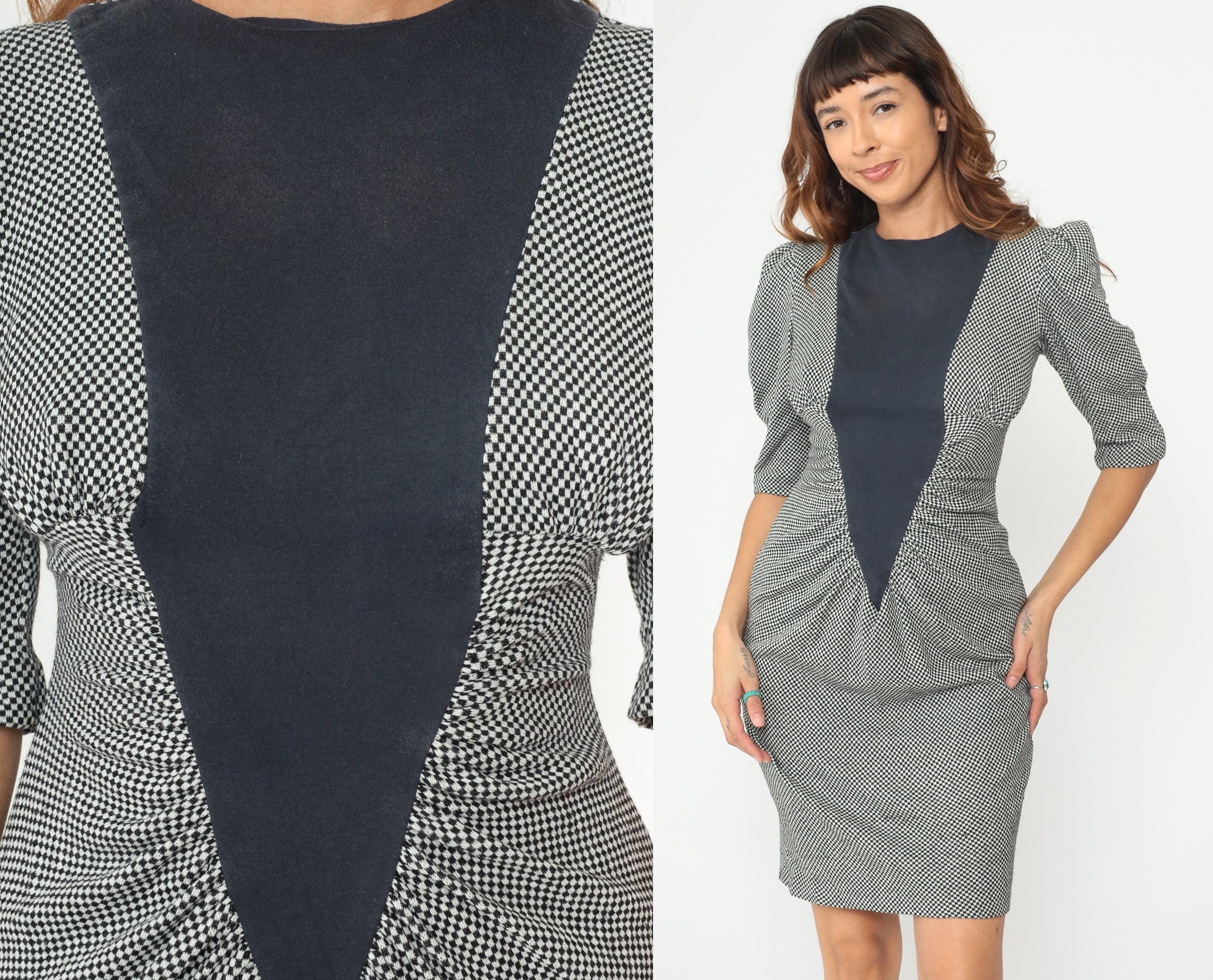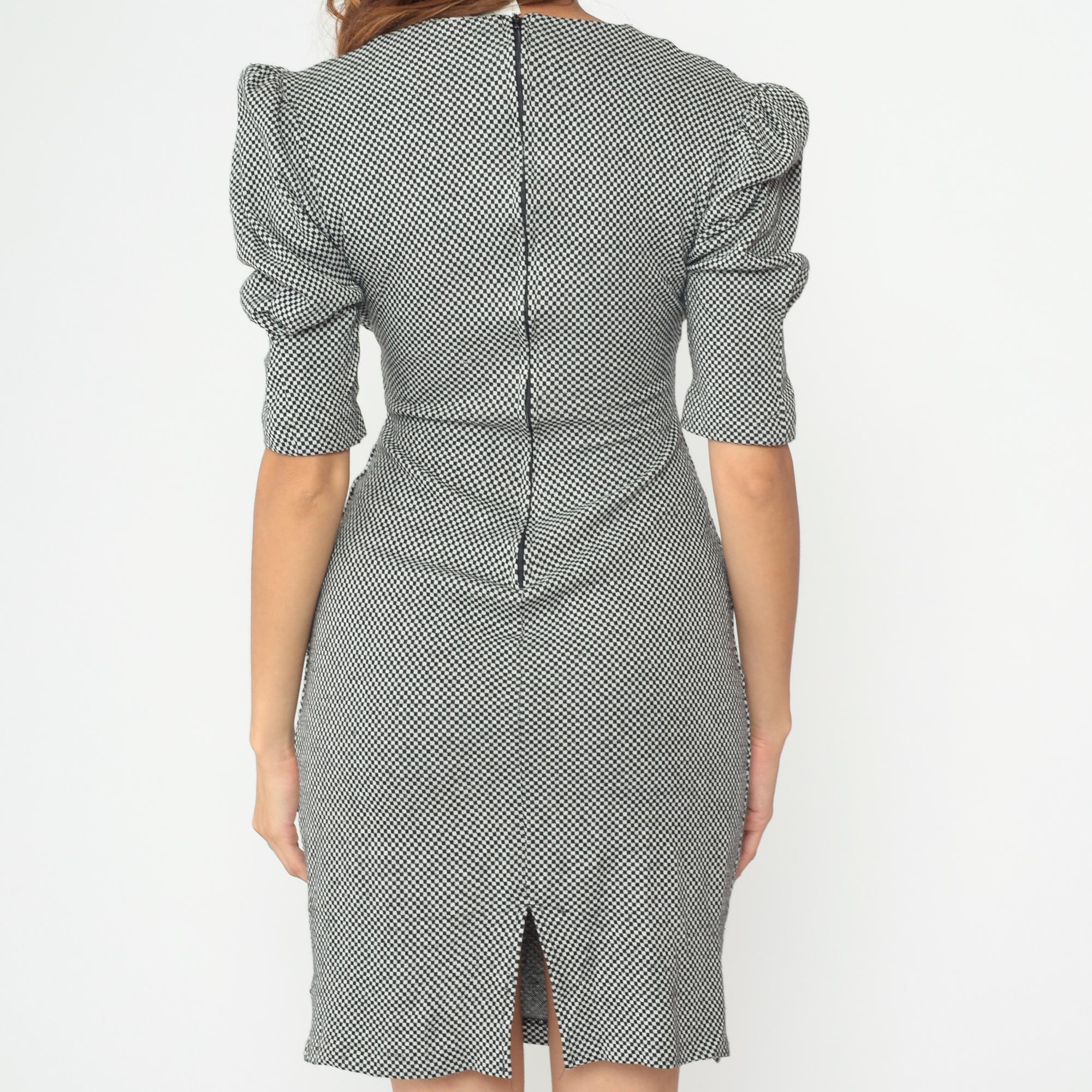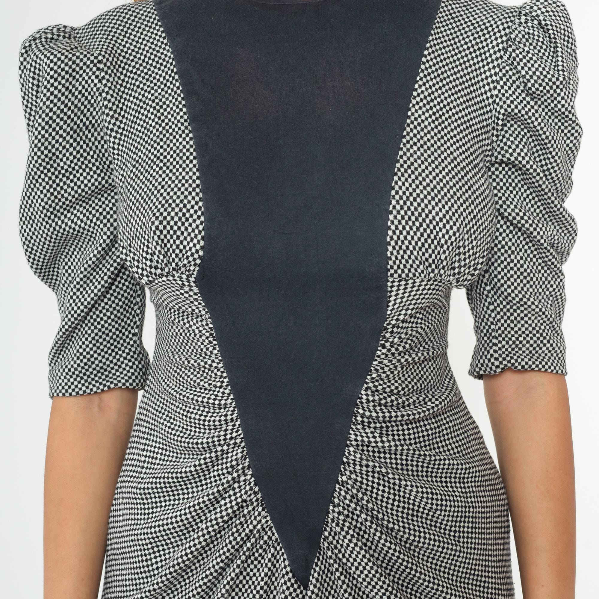 90s black and white checkered dress from milarzo with bold color blocking design. Black center panel runs vertically down the front and back, creating a striking contrast against the houndstooth check pattern. Dramatic puff sleeves with gathered detailing and back zipper closure. Back slit for ease of movement. 90% acrylic and 10% polyester blend. Tagged size 5, fits Small.
