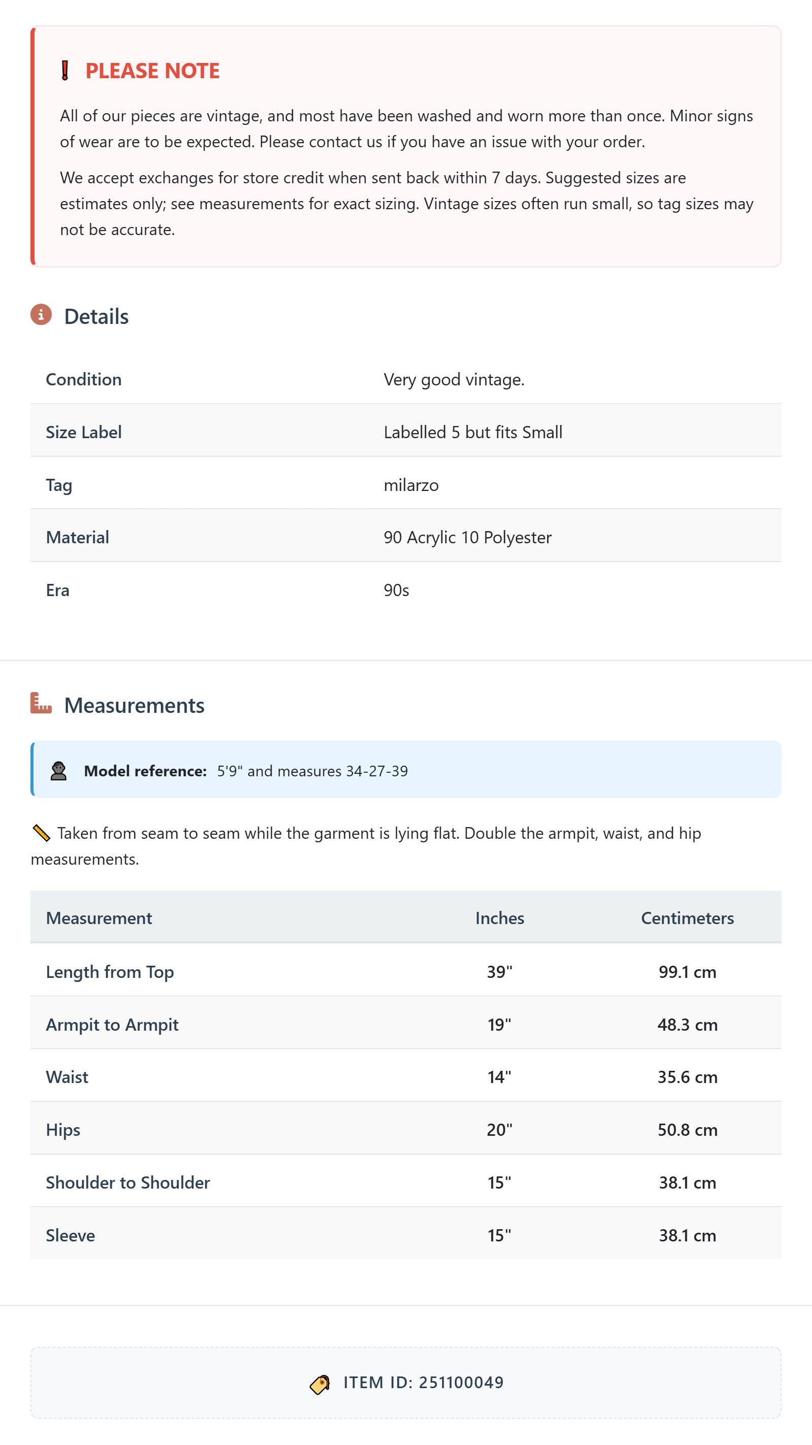 All of our pieces are vintage, and most have been washed and worn more than once. Minor signs of wear are to be expected. Please contact us if you have an issue with your order. We accept exchanges for store credit when sent back within 7 days.