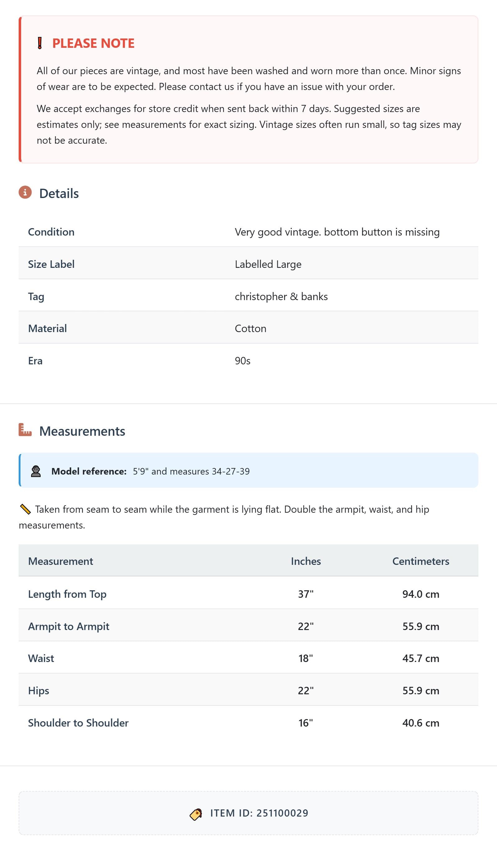 All of our pieces are vintage, and most have been washed and worn more than once. Minor signs of wear are to be expected. Please contact us if you have an issue with your order. We accept exchanges for store credit when sent back within 7 days.