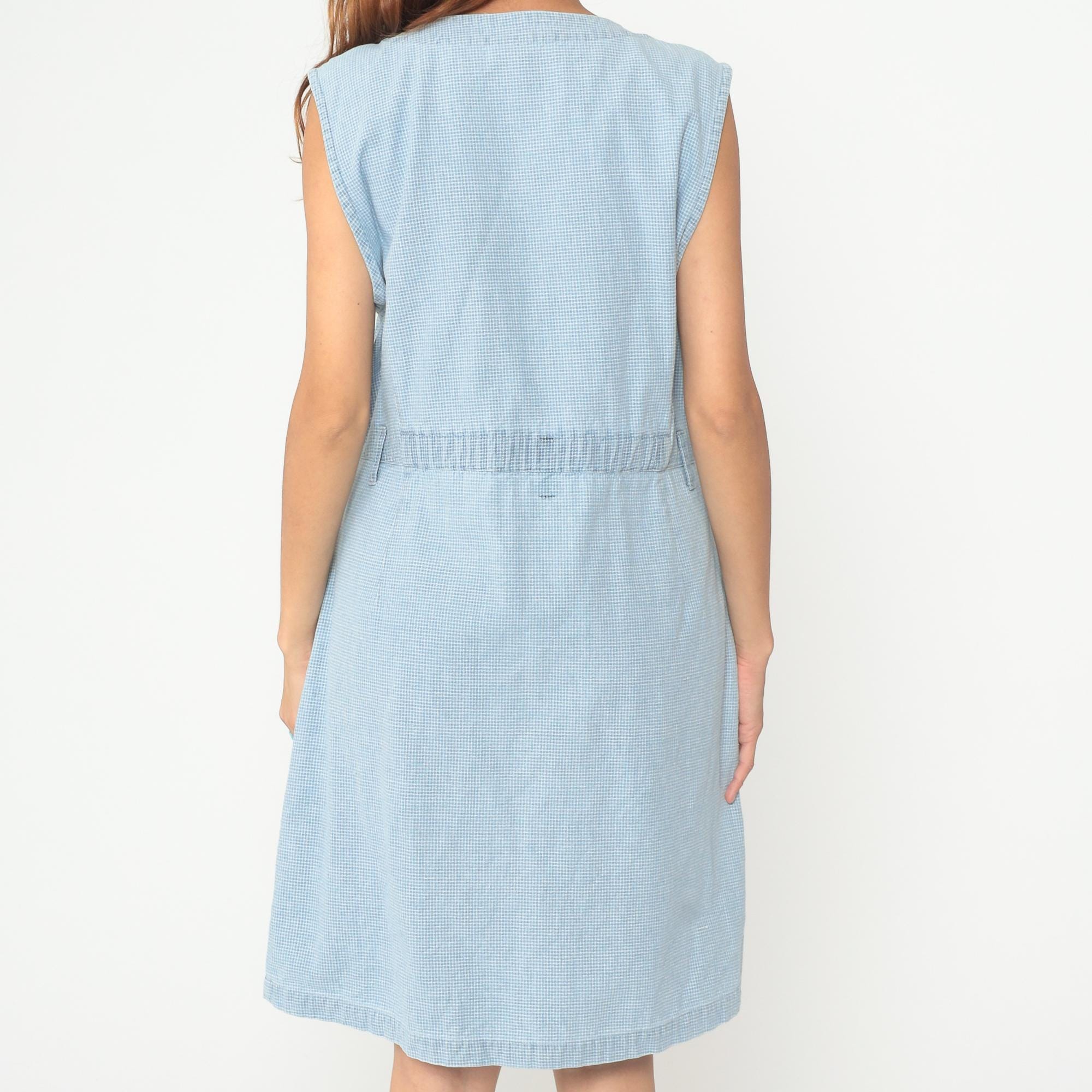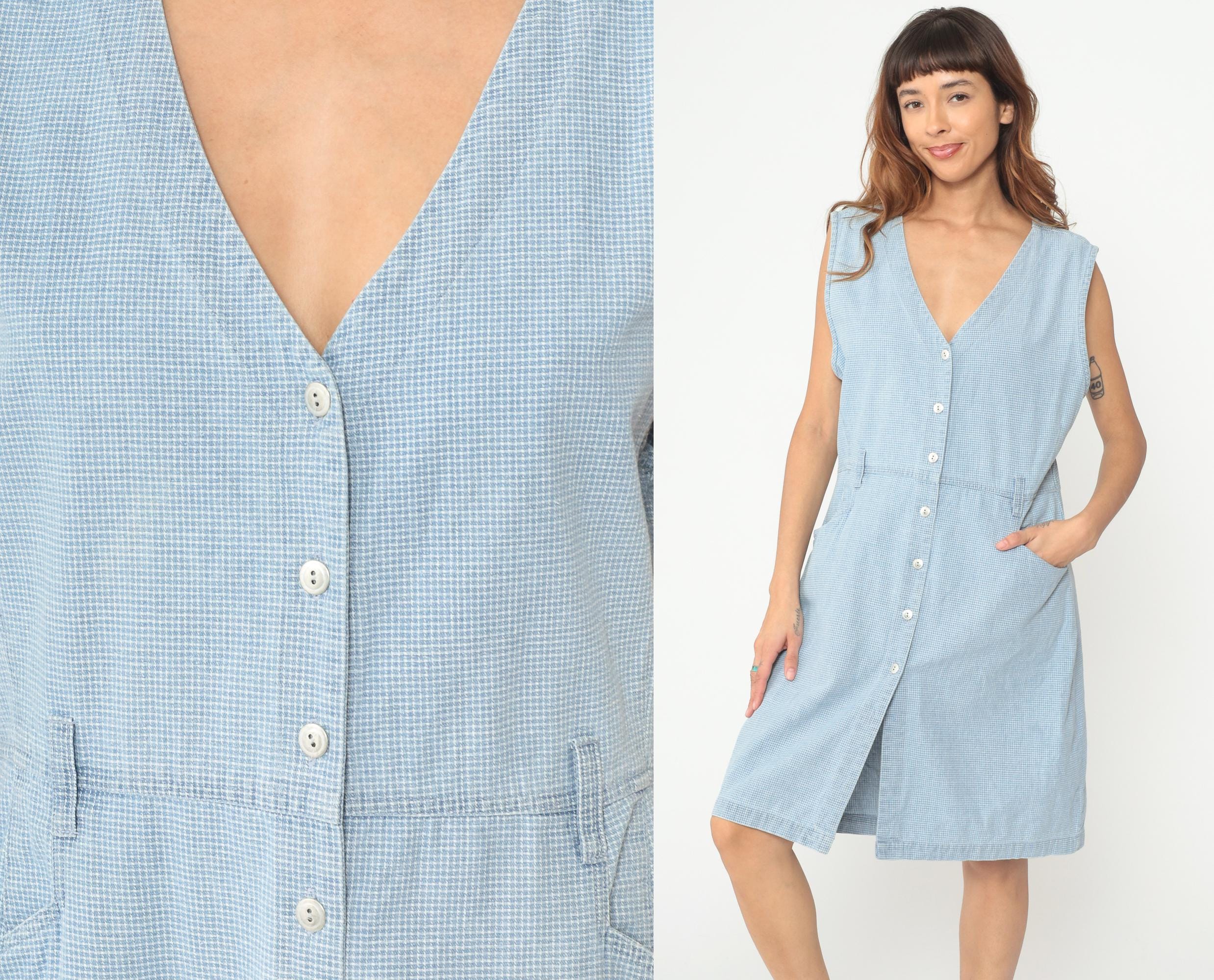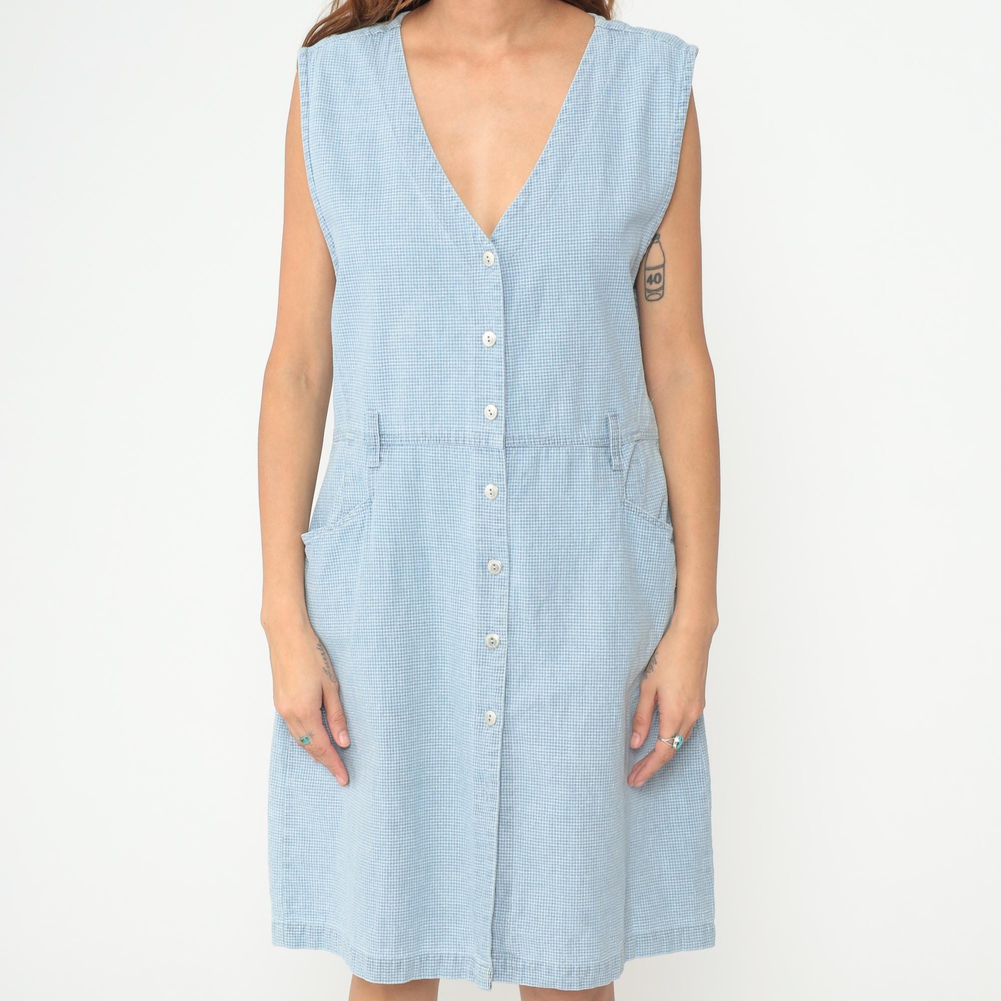 90s light blue gingham dress from Christopher & Banks with sleeveless button-front design and V-neckline. Micro check pattern in pale blue and white throughout, elastic waist detail, two front hip pockets. Cotton. Tagged size Large.