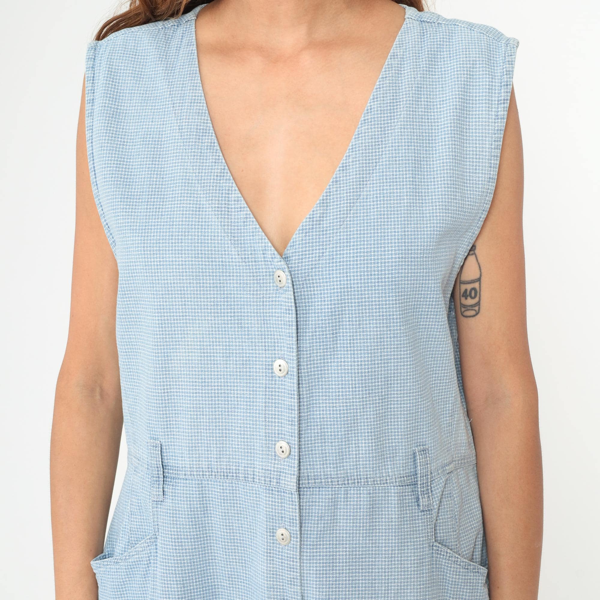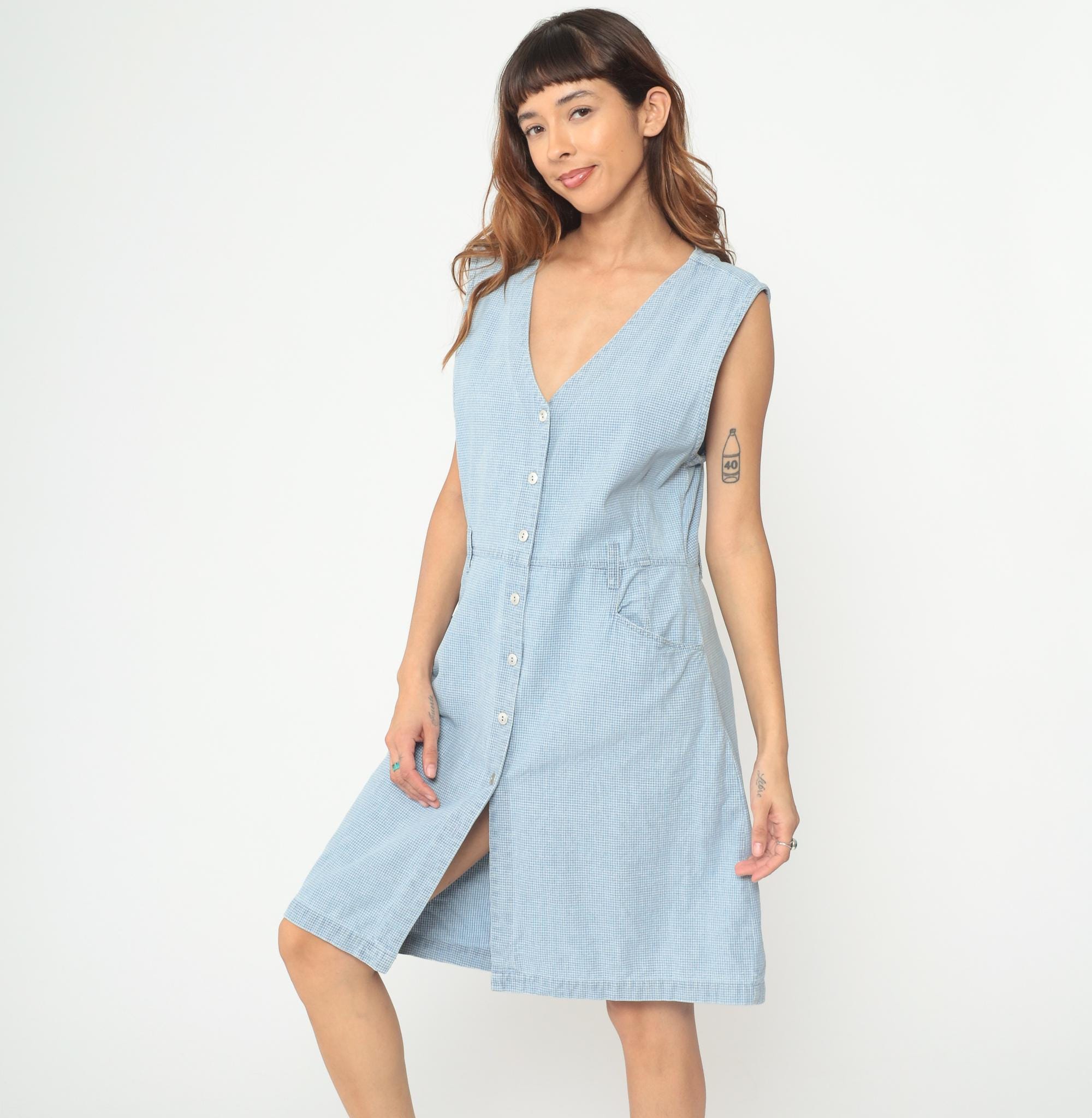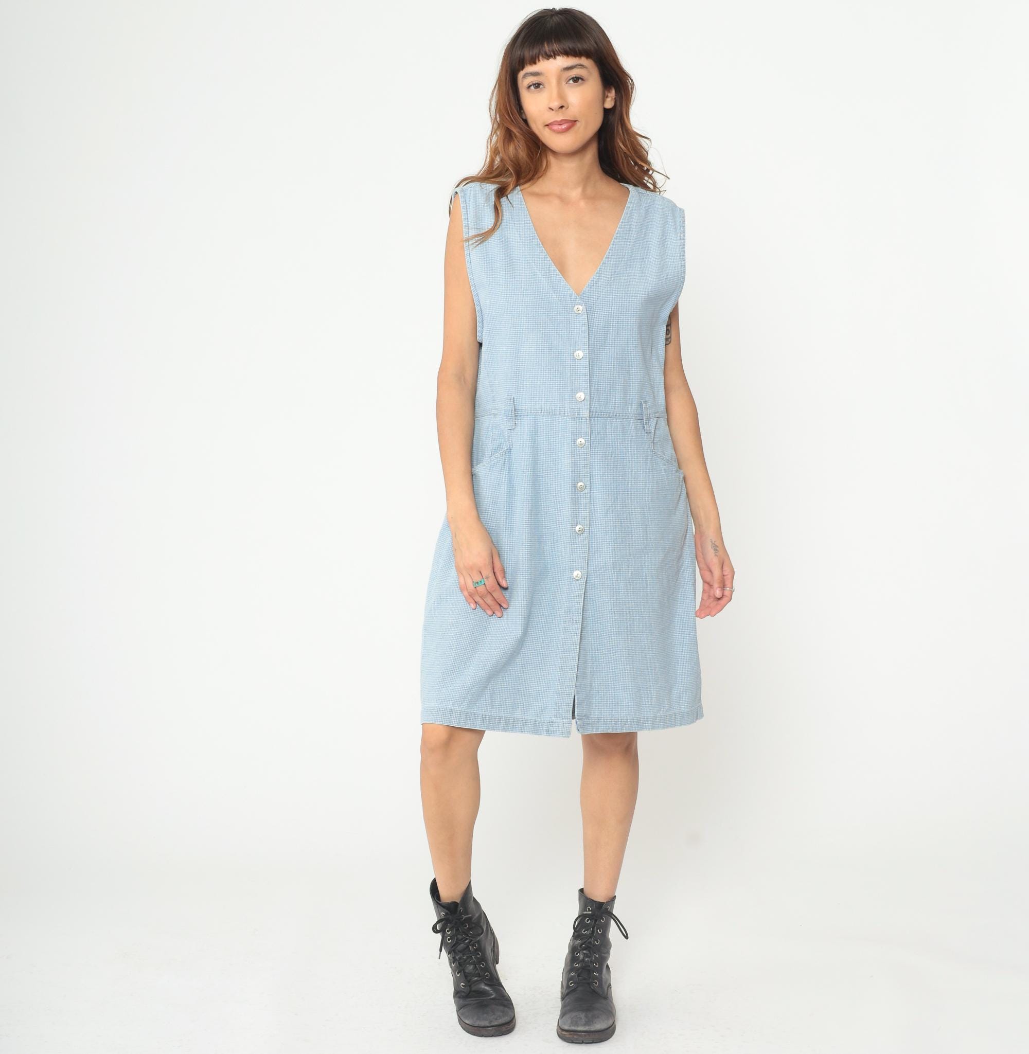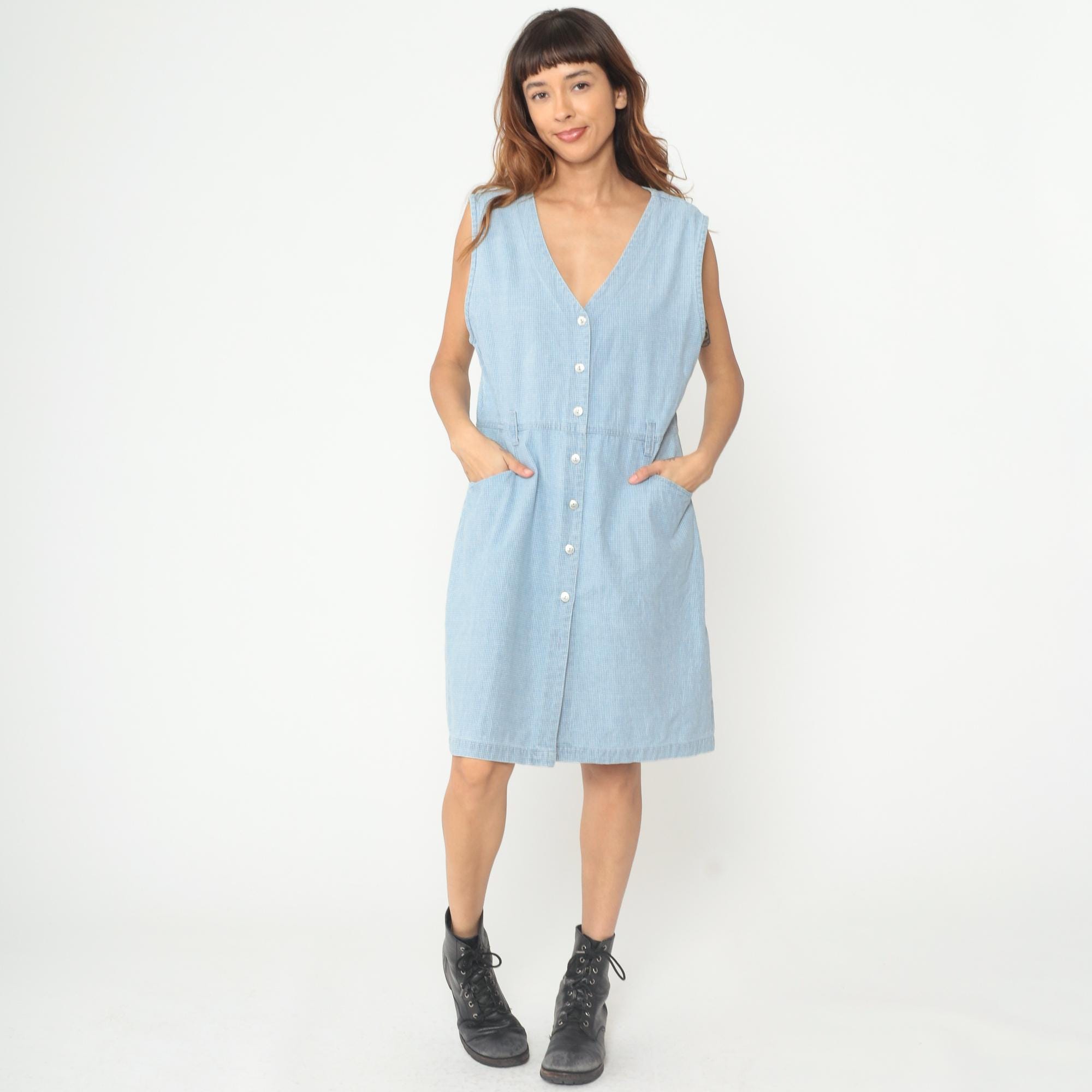 90s light blue gingham dress from Christopher & Banks with sleeveless button-front design and V-neckline. Micro check pattern in pale blue and white throughout, elastic waist detail, two front hip pockets. Cotton. Tagged size Large.
