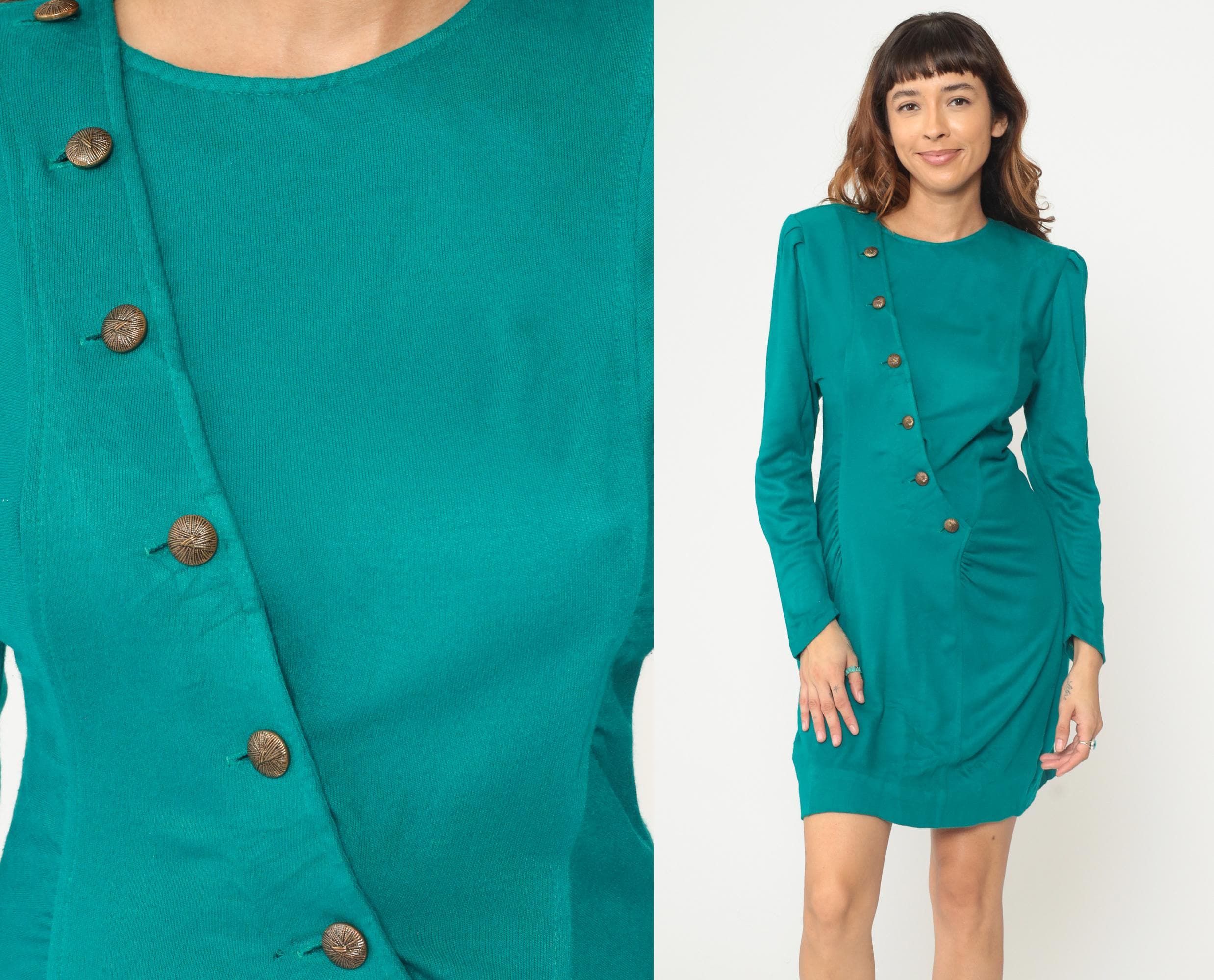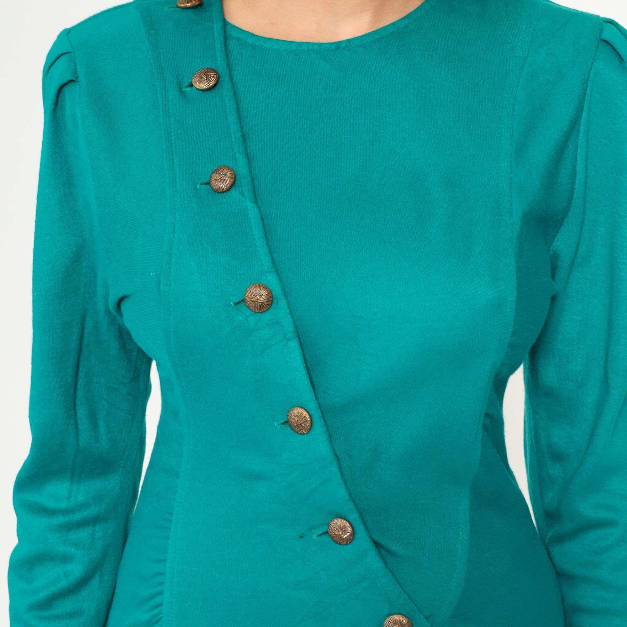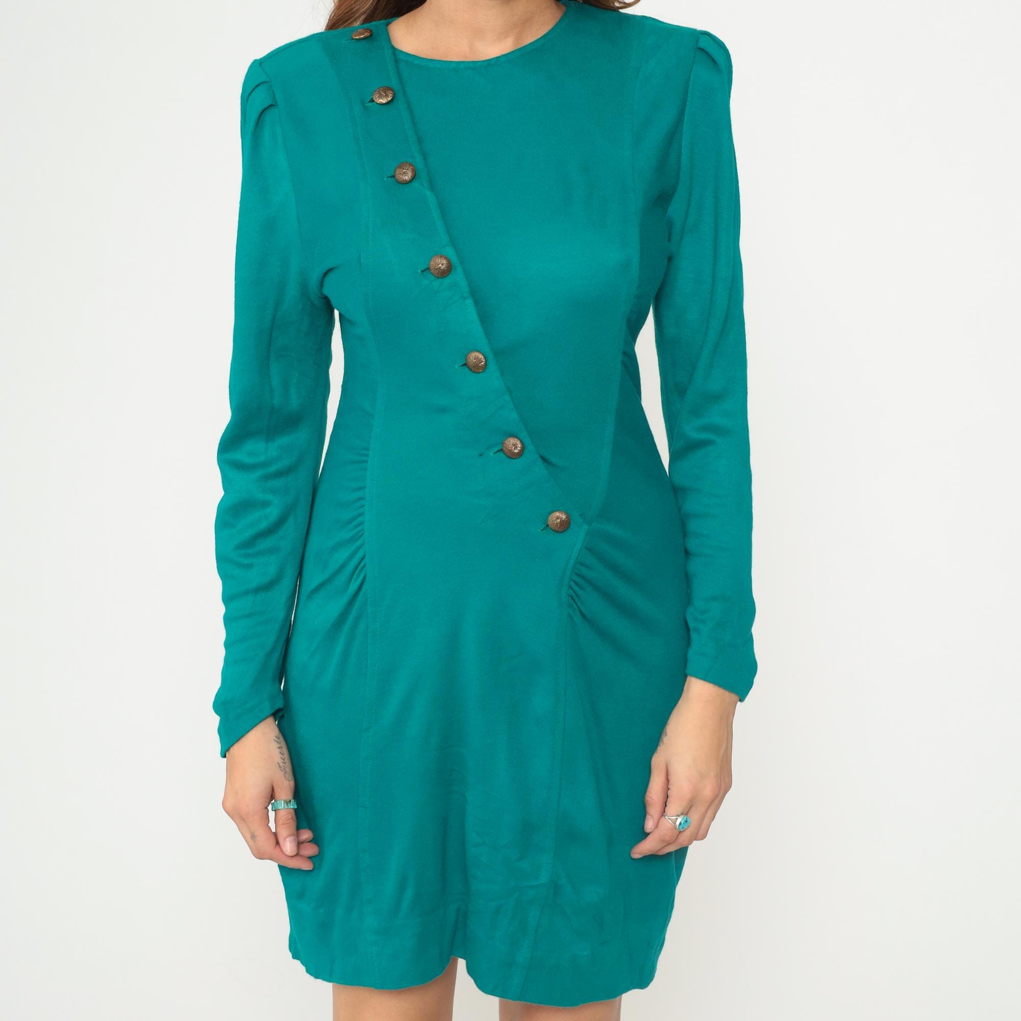 Teal long-sleeve dress from the 80s with structured shoulder pads and asymmetrical button front closure running from left shoulder to waist. Gold-tone disc buttons with decorative detailing, fitted bodice with gathered waist, and knee-length straight skirt. Has a mend on the skirt (see photos).