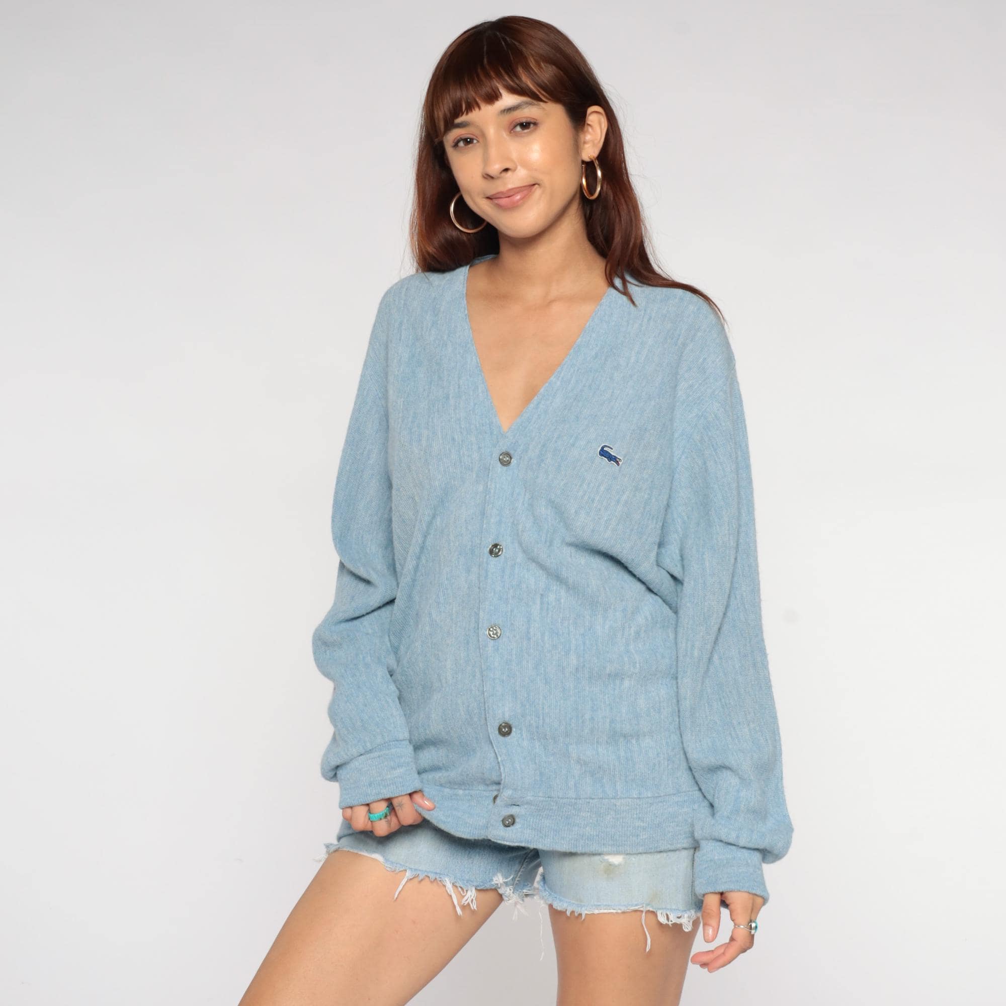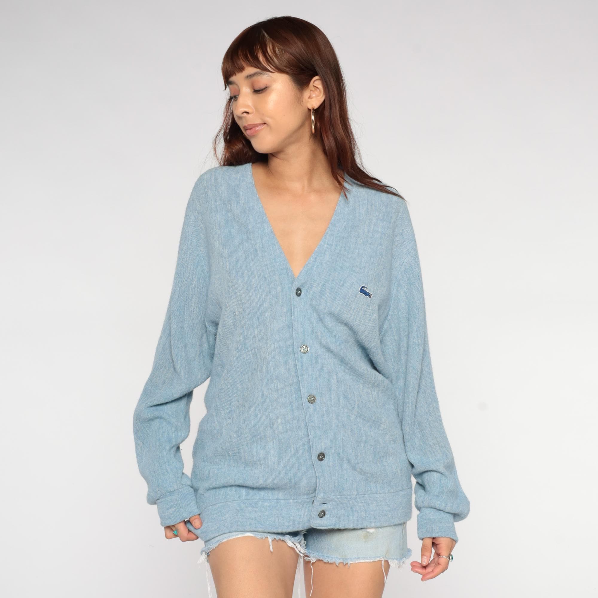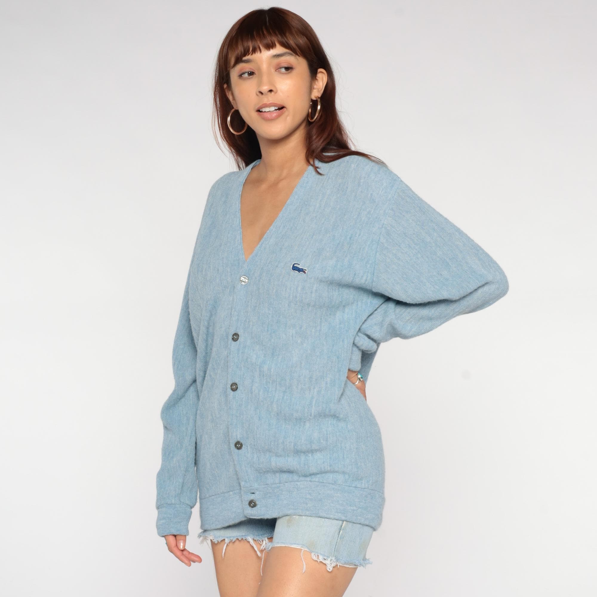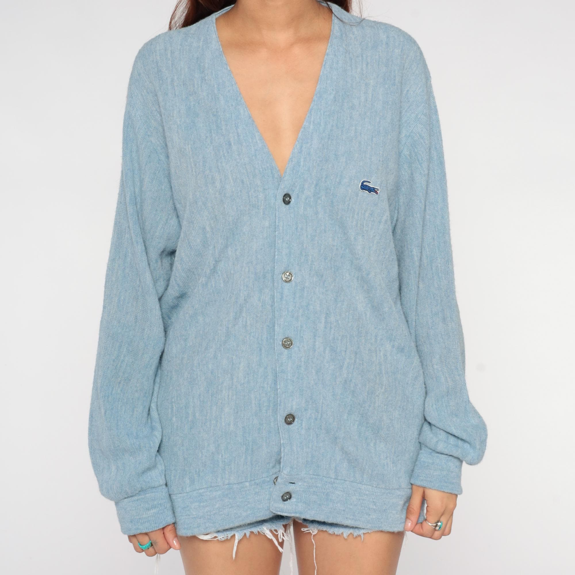 80s light blue cardigan from Lacoste, featuring the iconic embroidered crocodile logo on the chest. Oversized, comfortable fit with button front closure and long sleeves. Classic preppy piece perfect for collegiate and light academia styling.