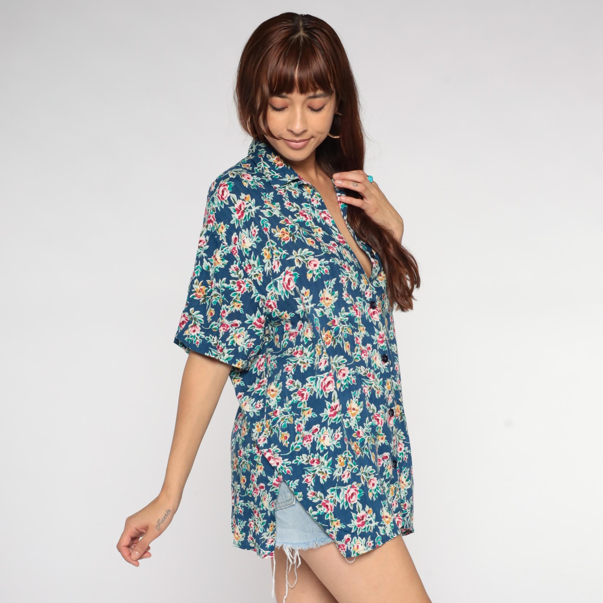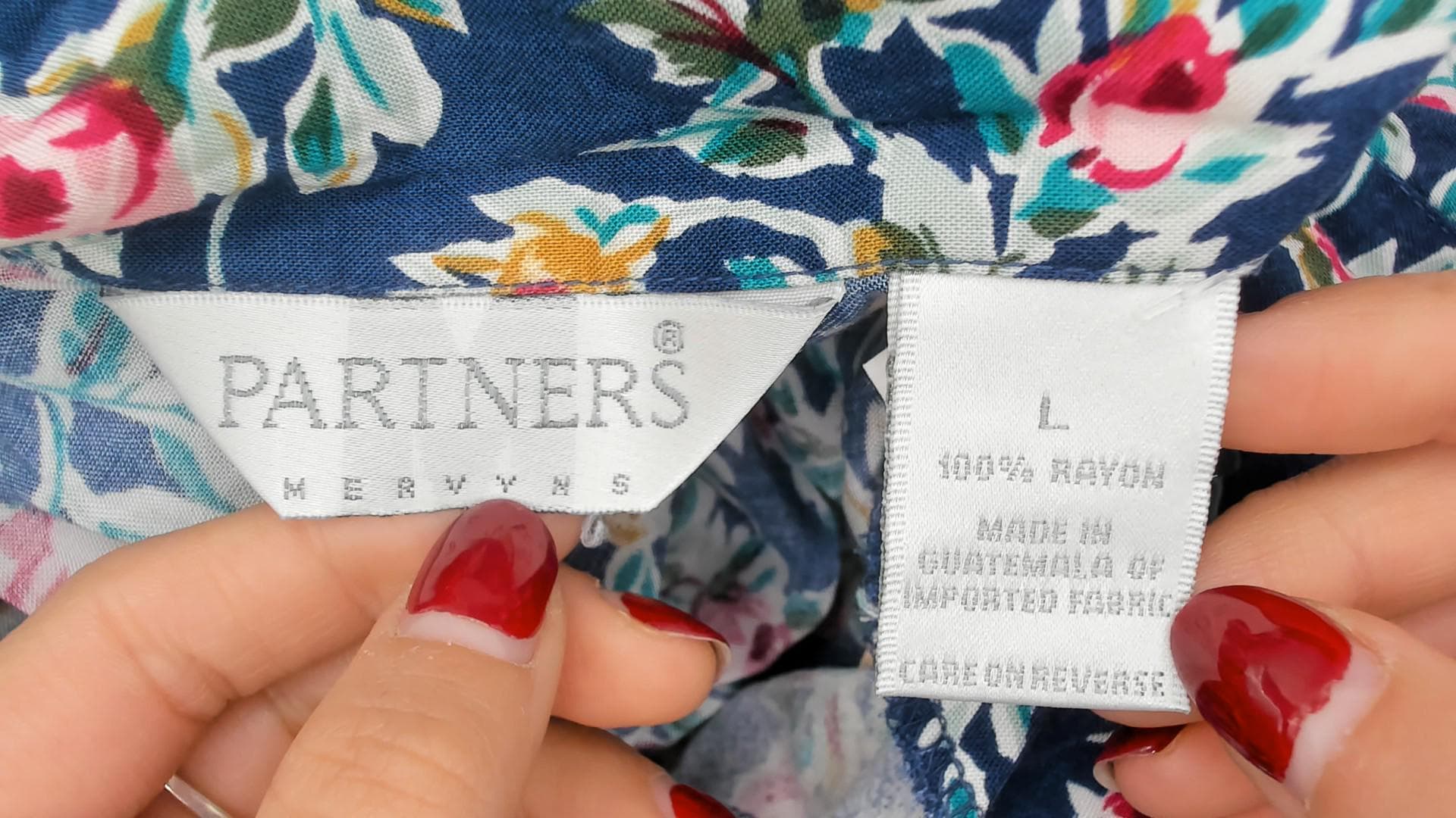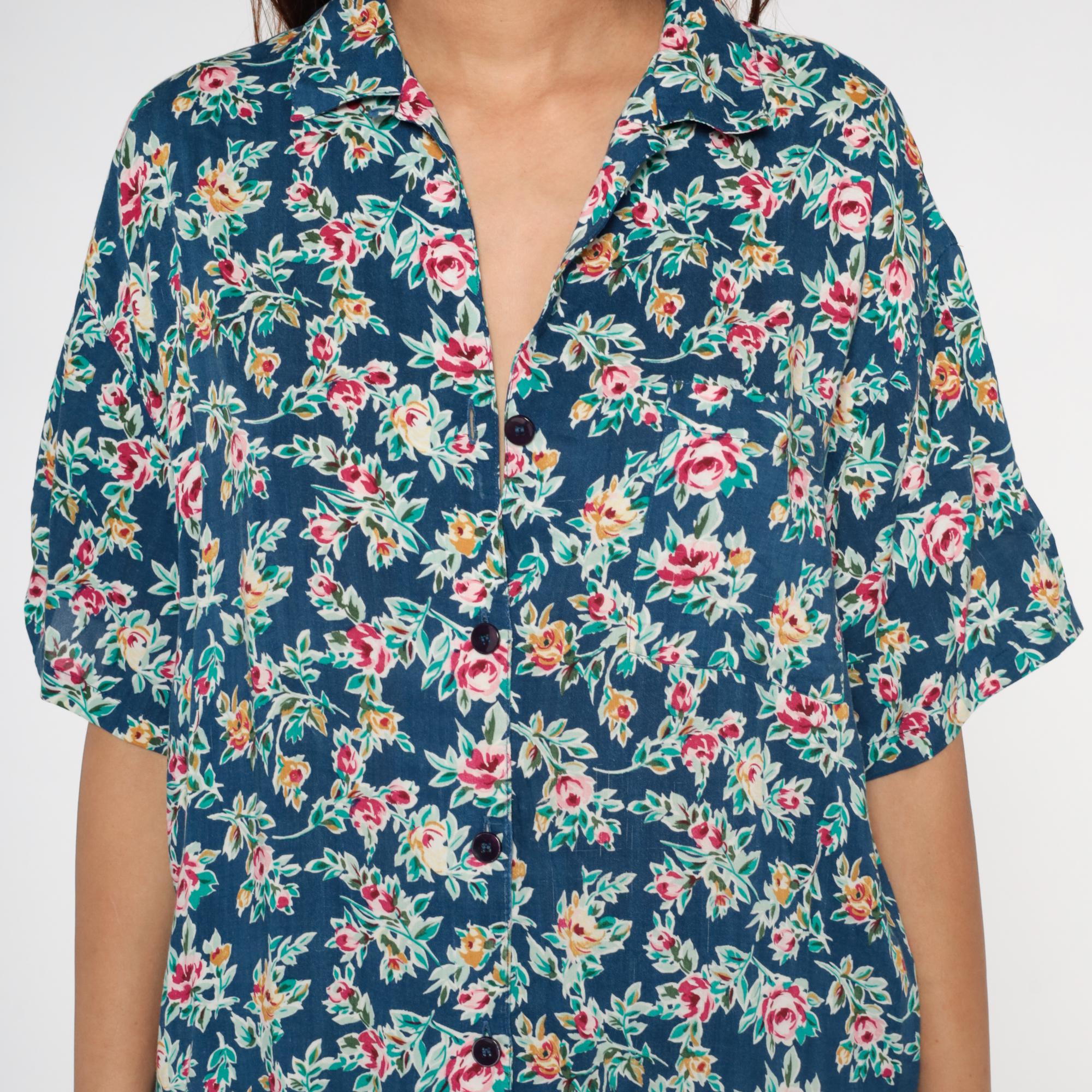 90s floral button-up shirt from Partners in navy blue rayon with pink, yellow, and mint green floral print throughout. Collared neckline with relaxed button front closure and short sleeves.