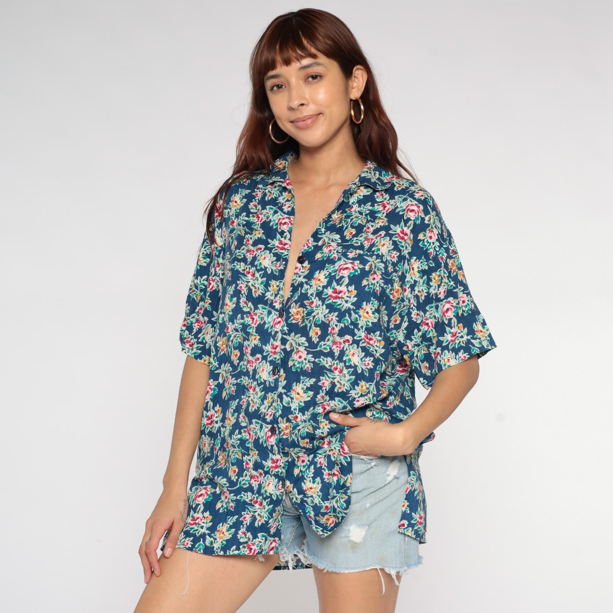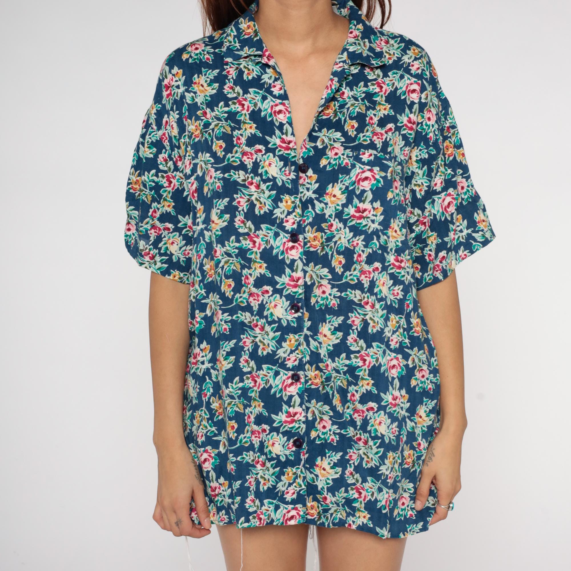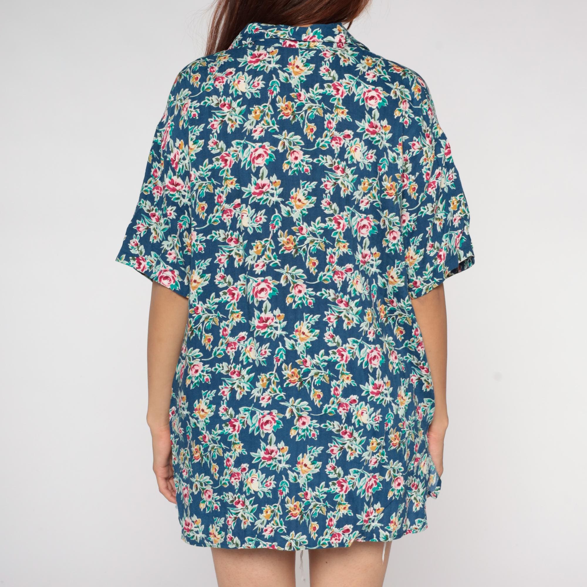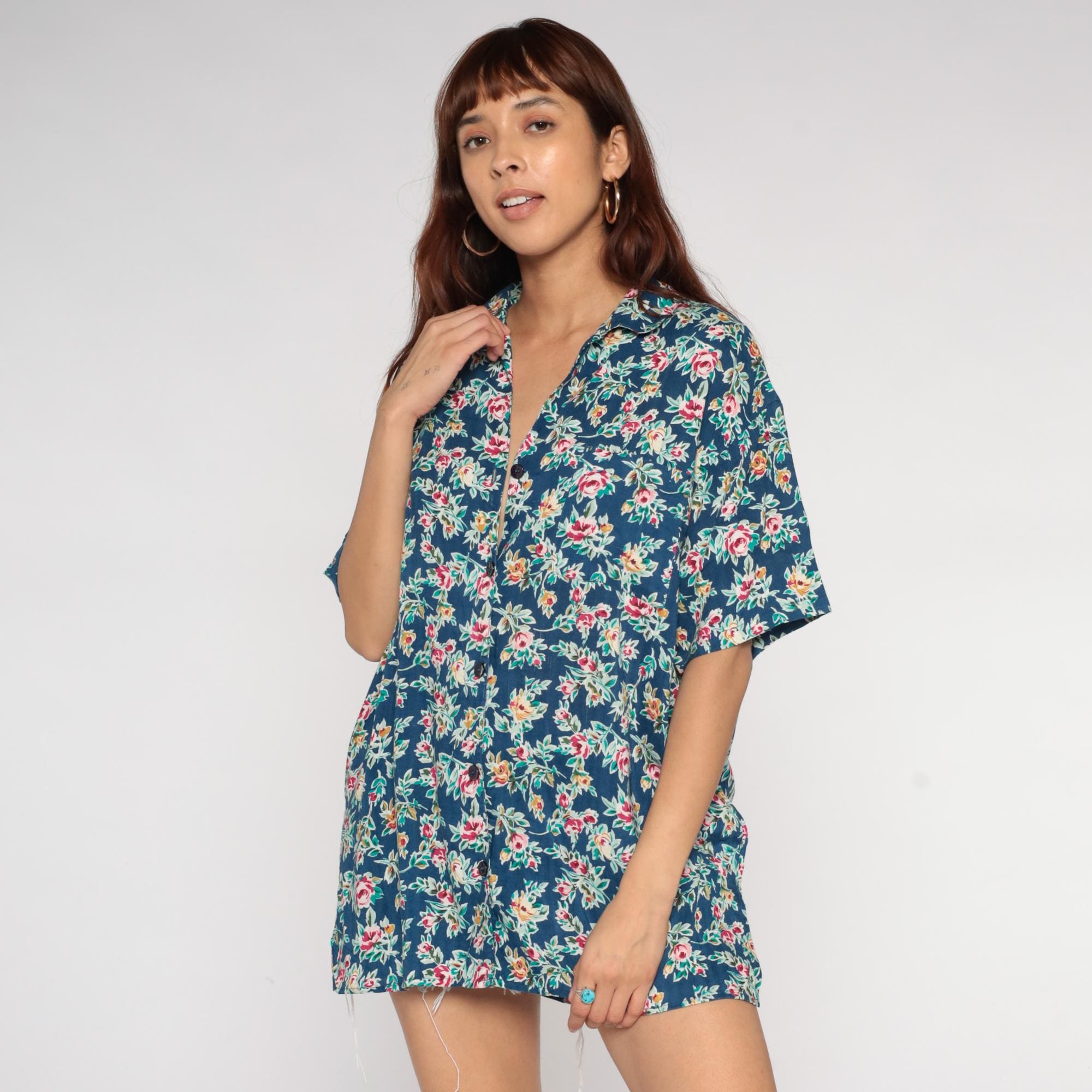 90s floral button-up shirt from Partners in navy blue rayon with pink, yellow, and mint green floral print throughout. Collared neckline with relaxed button front closure and short sleeves.