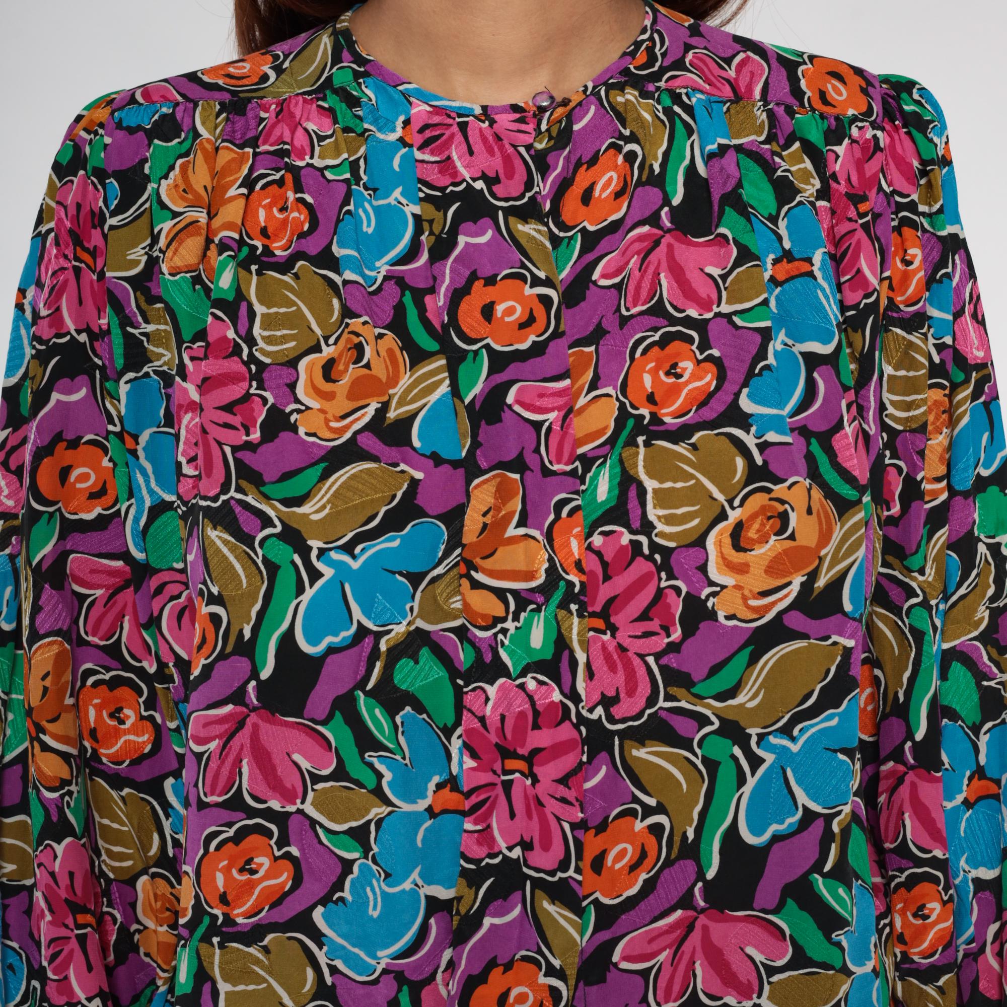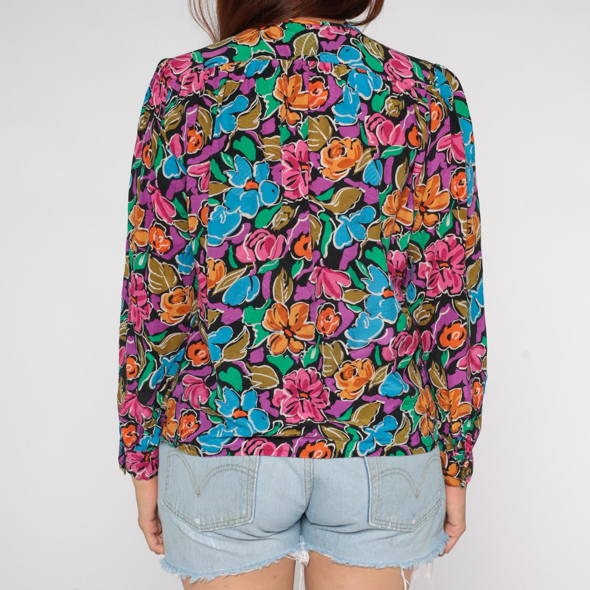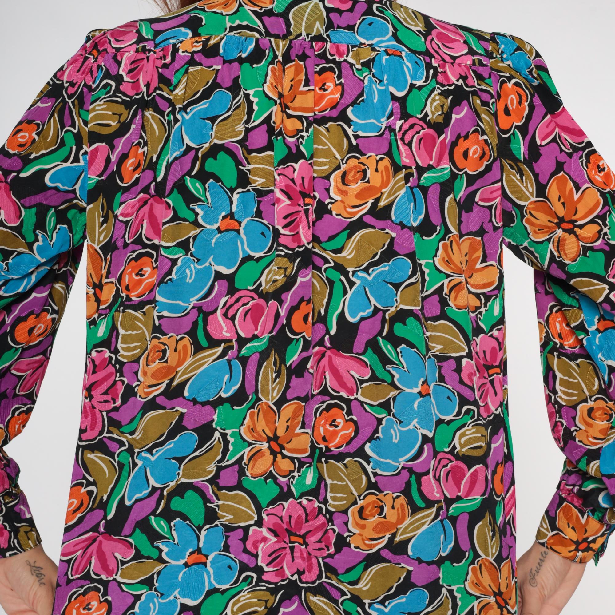 90s silk blouse with bold floral print in pink, orange, blue, green, and olive against a black background. Made from 100% silk with a soft, flowing hand and luxurious drape. Features a jewel neckline with gathered pleats, long sleeves with elasticized cuffs, and a relaxed fit through the body.